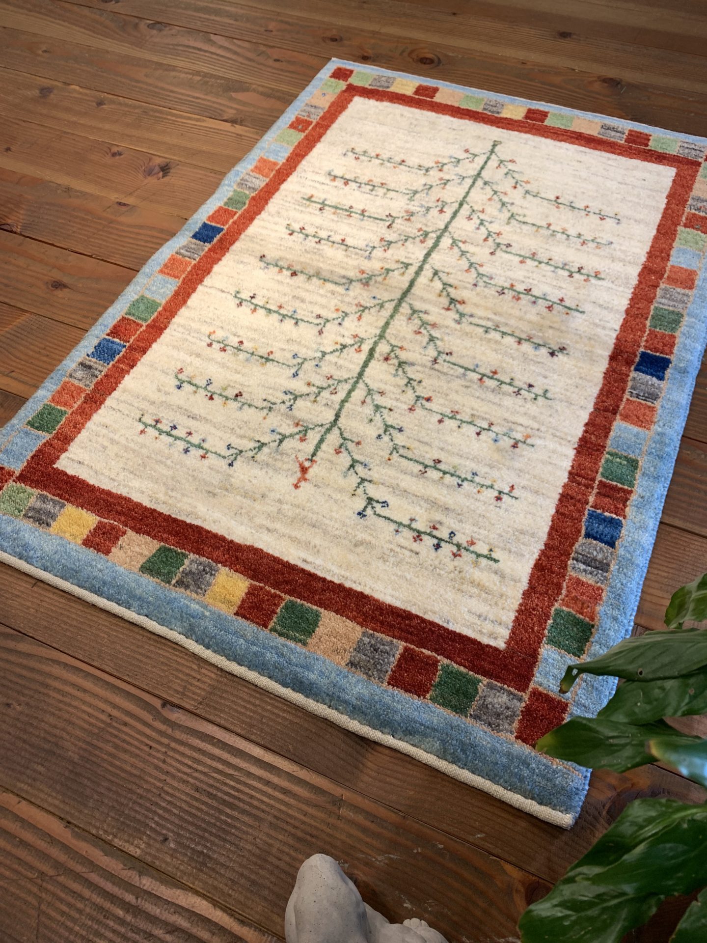 健康・長寿を願う『生命の木』が大きく織りこまれ、枝には花が咲き、木のてっぺんには可愛らしい鳥さんがとまっています♪カラフルなブロックが積まれたようなデザインで、お部屋がパッと明るくなりますね^^玄関に、ベッドサイドに、壁掛にして絵画のように飾っていただくのもオススメ!