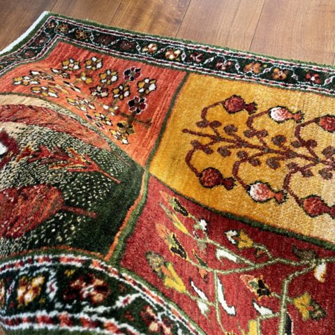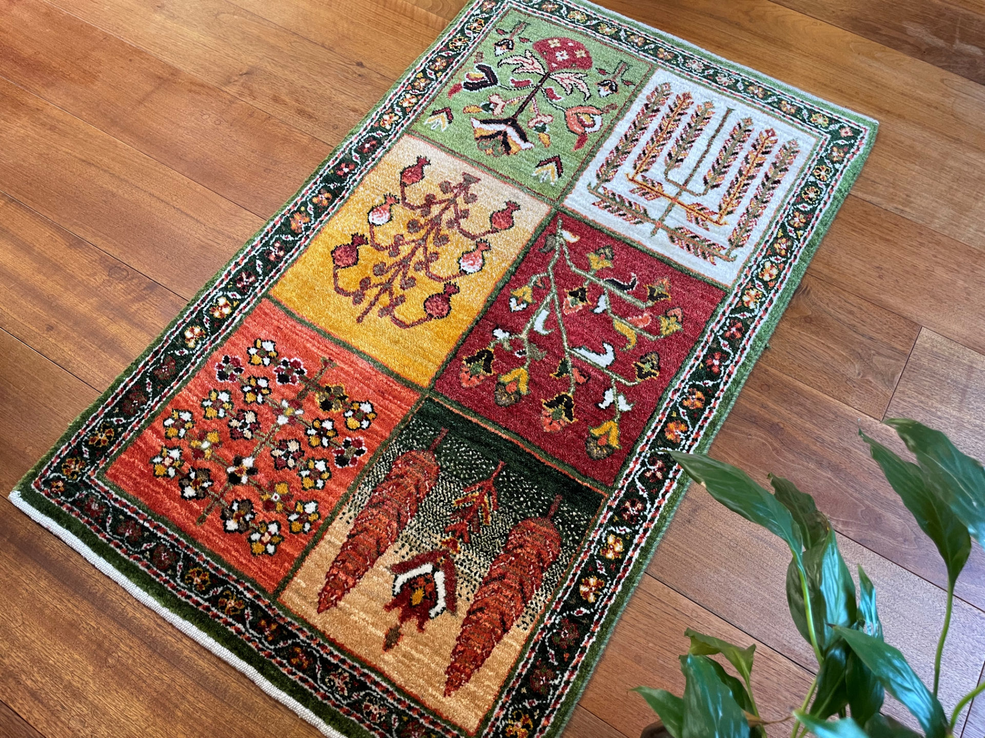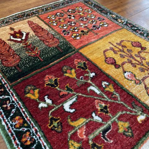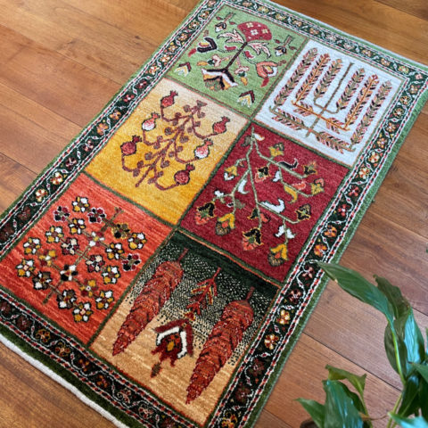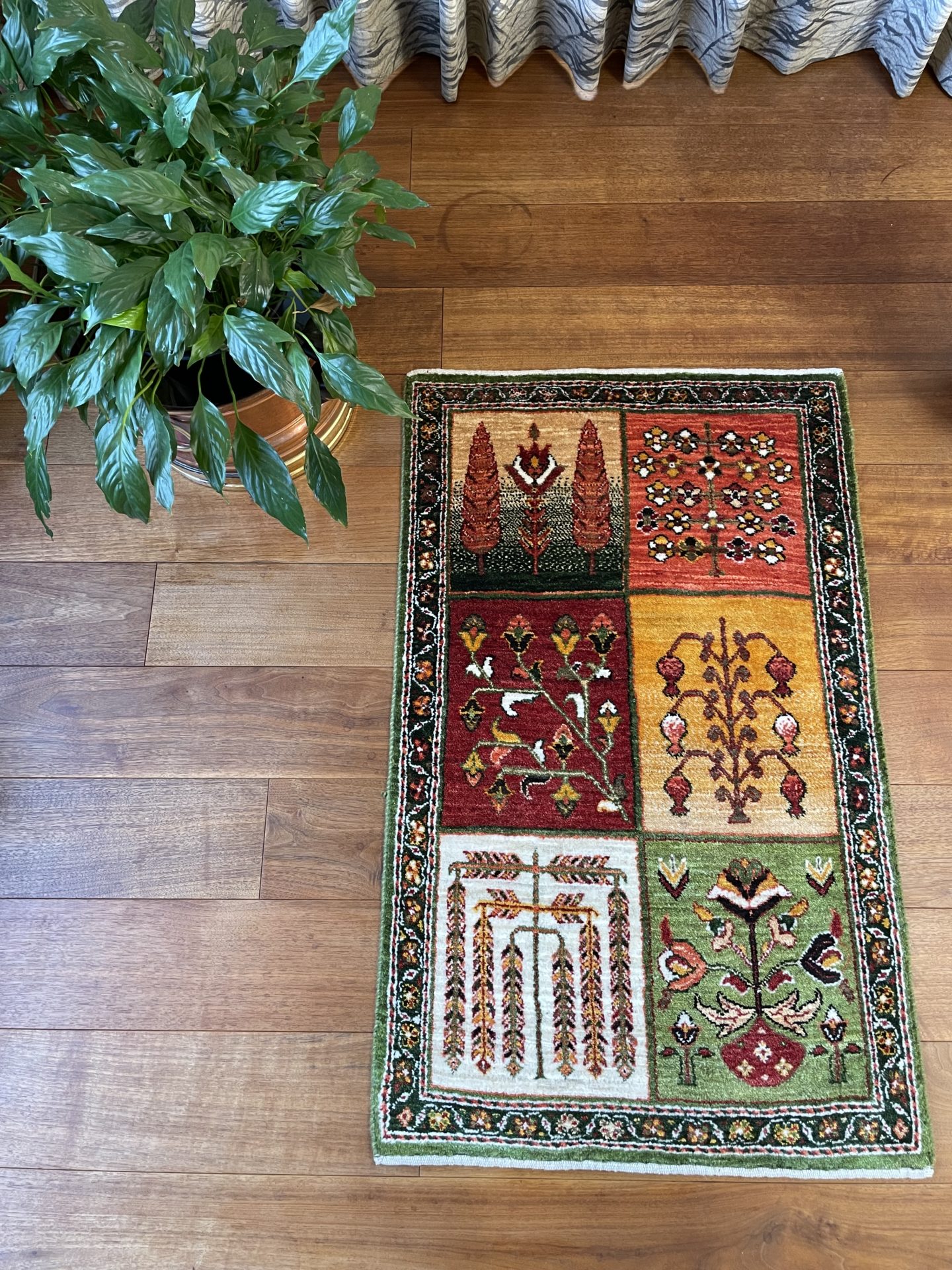 緑やピンク、黄色など沢山の色が使われた多彩で個性的なギャッベ。魔除けを表す狼の足跡で縁取りされ、楽園を表す六つの四角の中には子孫繫栄のザクロや永遠の命の糸杉が描かれています。六つの四角の中にはそれぞれ違う文様が一つ一つ丁寧にえがかれており、まるで絵画のように美しく高級感のある贅沢な一枚ですね^^壁掛はもちろん玄関やソファーサイドにあるだけでお家のが華やかになる存在感のある作品です。