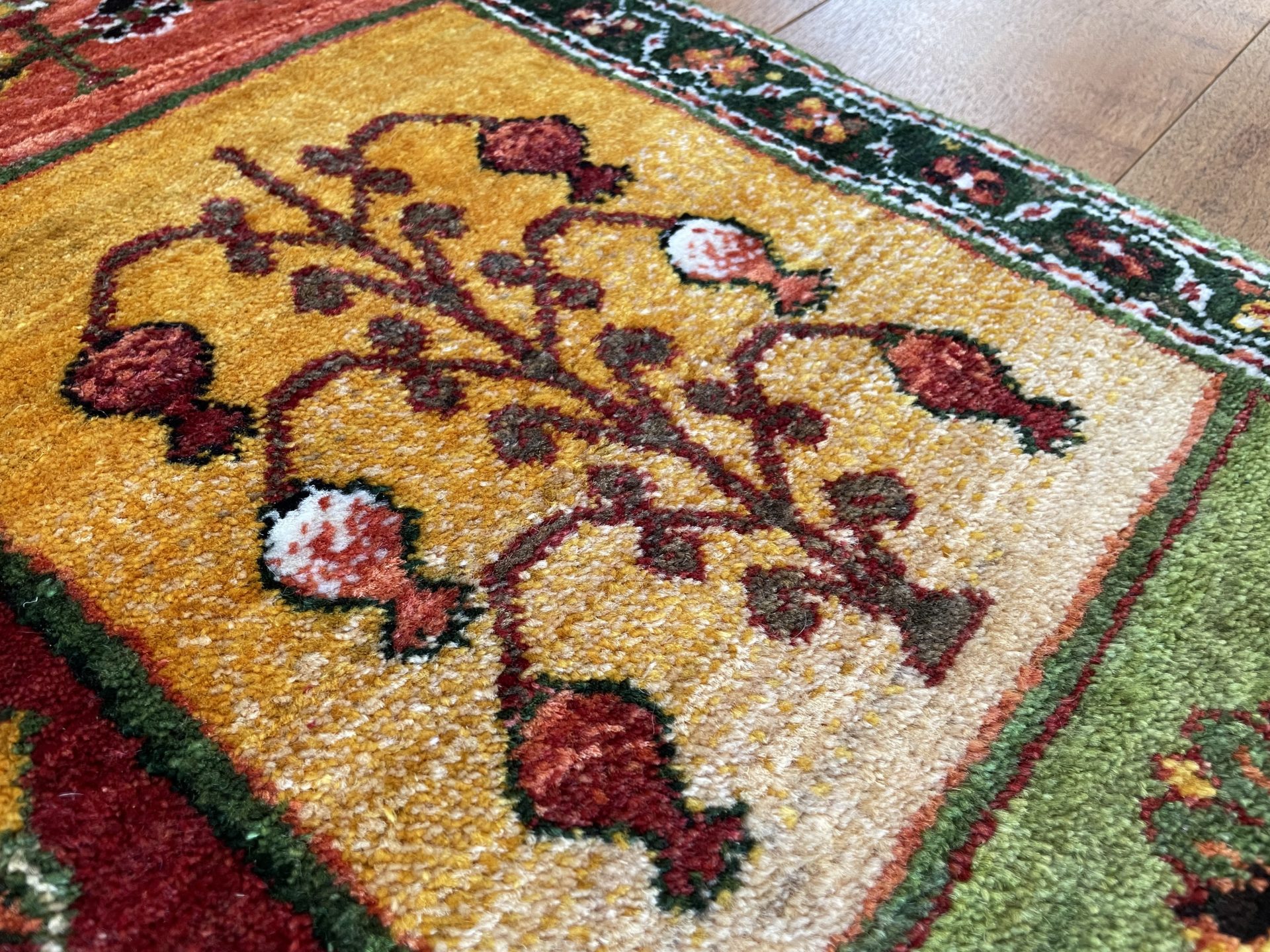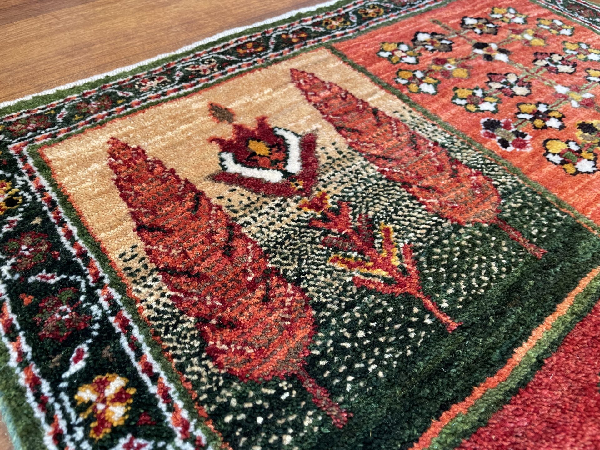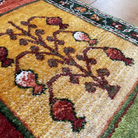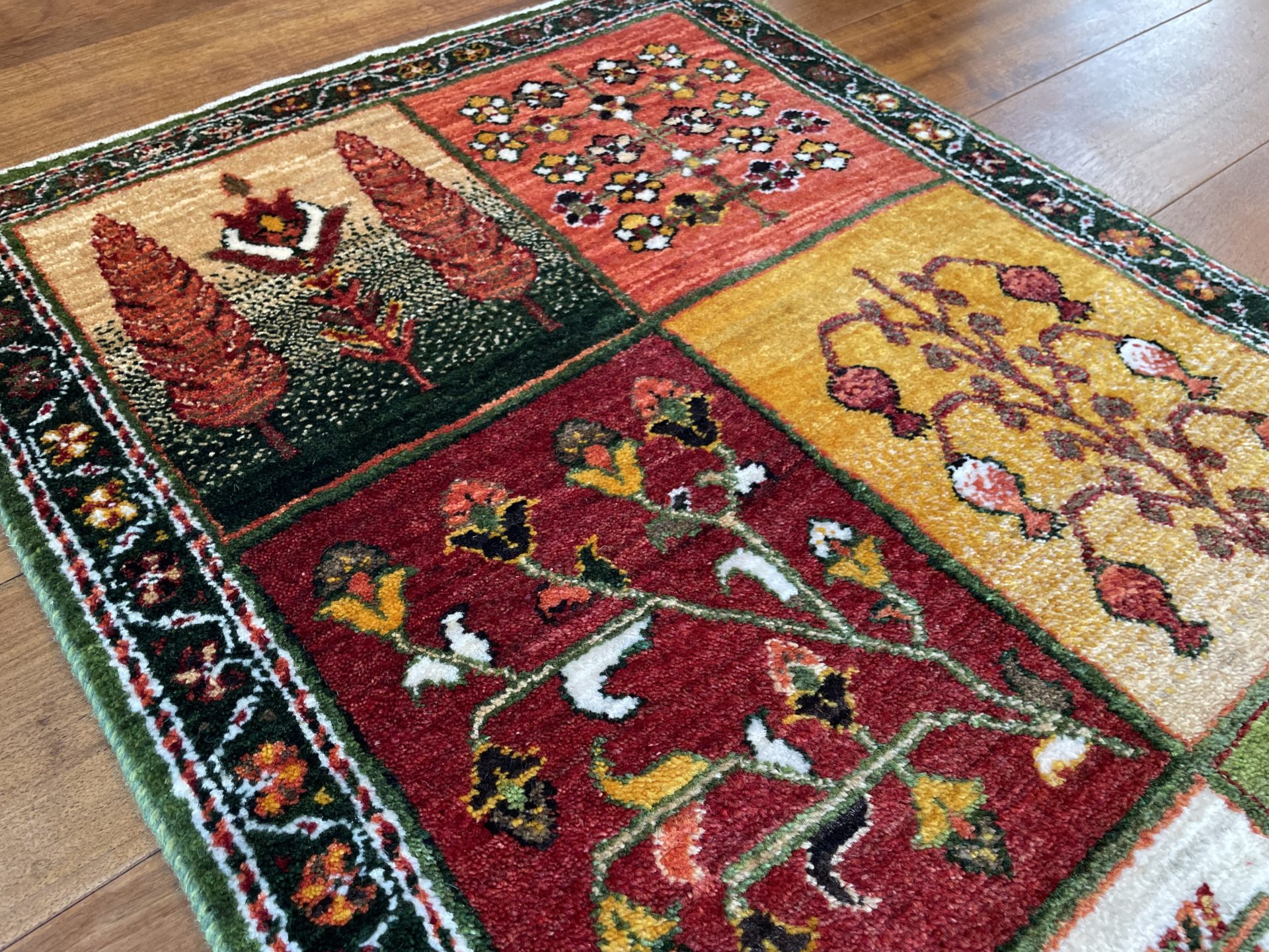 緑やピンク、黄色など沢山の色が使われた多彩で個性的なギャッベ。魔除けを表す狼の足跡で縁取りされ、楽園を表す六つの四角の中には子孫繫栄のザクロや永遠の命の糸杉が描かれています。六つの四角の中にはそれぞれ違う文様が一つ一つ丁寧にえがかれており、まるで絵画のように美しく高級感のある贅沢な一枚ですね^^壁掛はもちろん玄関やソファーサイドにあるだけでお家のが華やかになる存在感のある作品です。