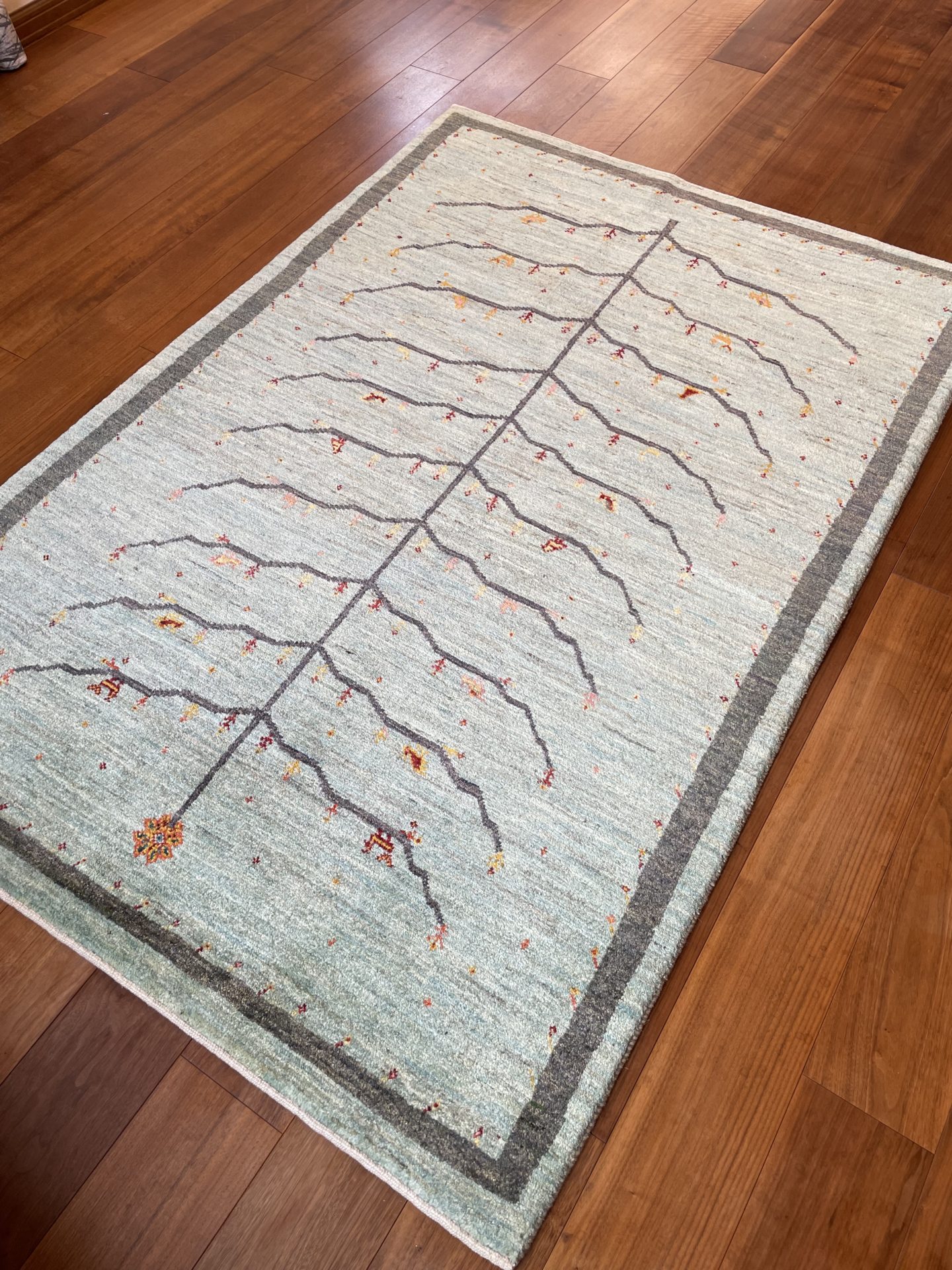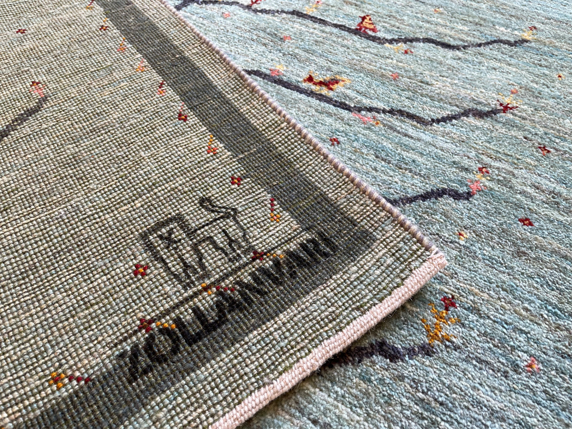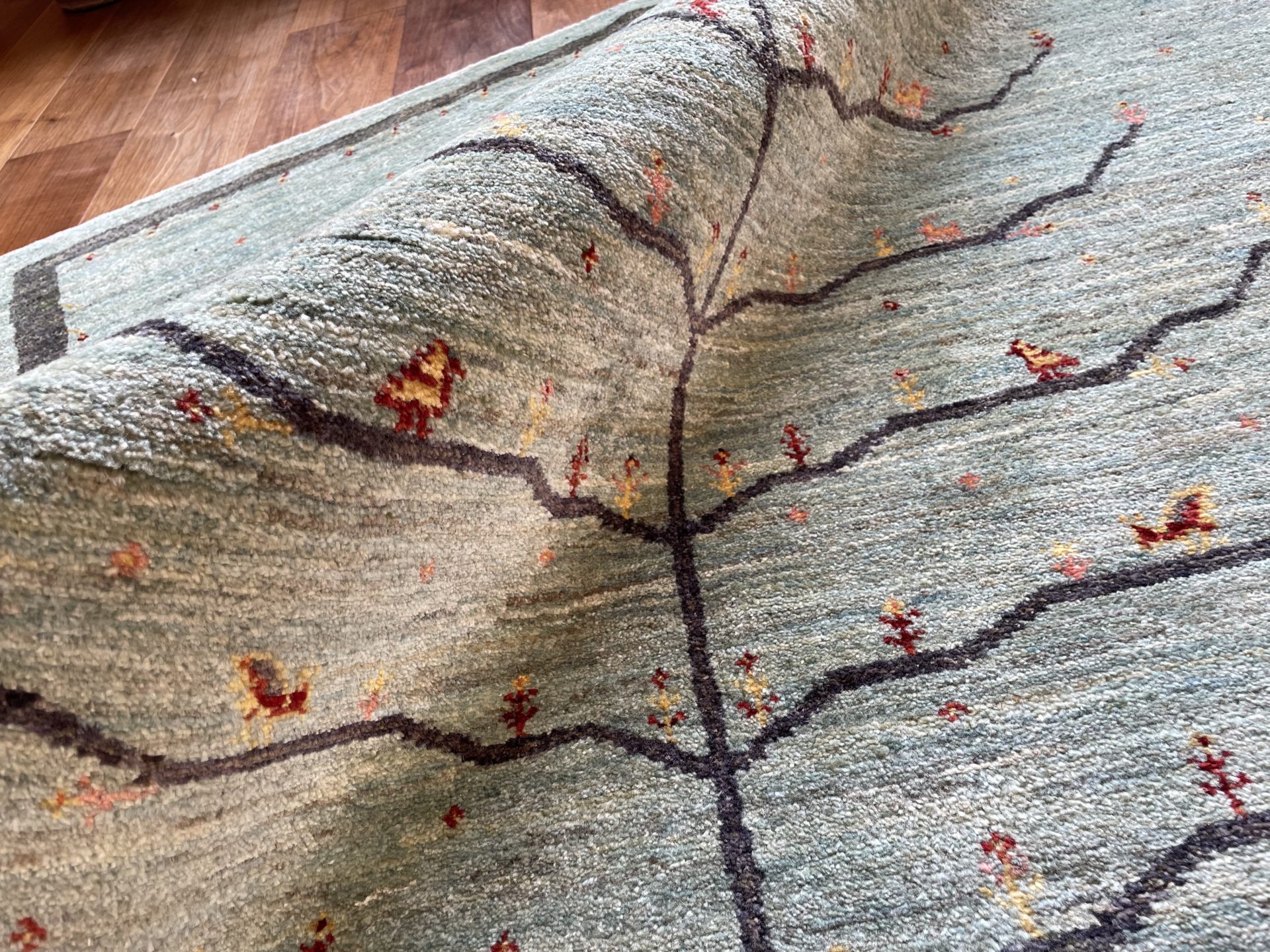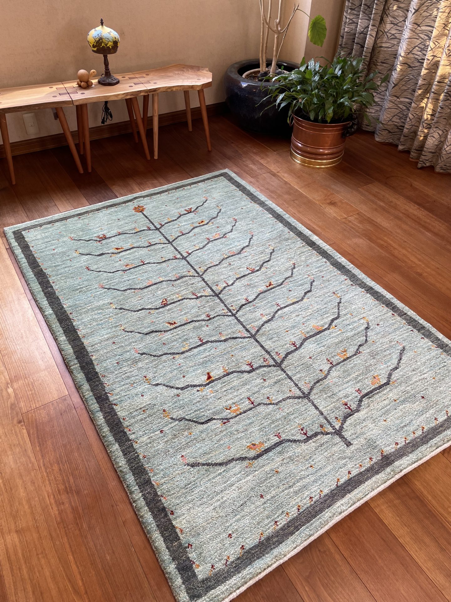 少しグレーがかった水色がとてもお洒落な作品。中央には1本の大きく立派な「生命の木」。遊牧民の女性たちが「家族みんなが末永く健康でいられますように」と思い込めて織りあげた、愛溢れるデザインです。近くによって見てみると、枝には小さな鳥さんがとまっています。春の訪れを祝って歌を歌っているのでしょうか♪
