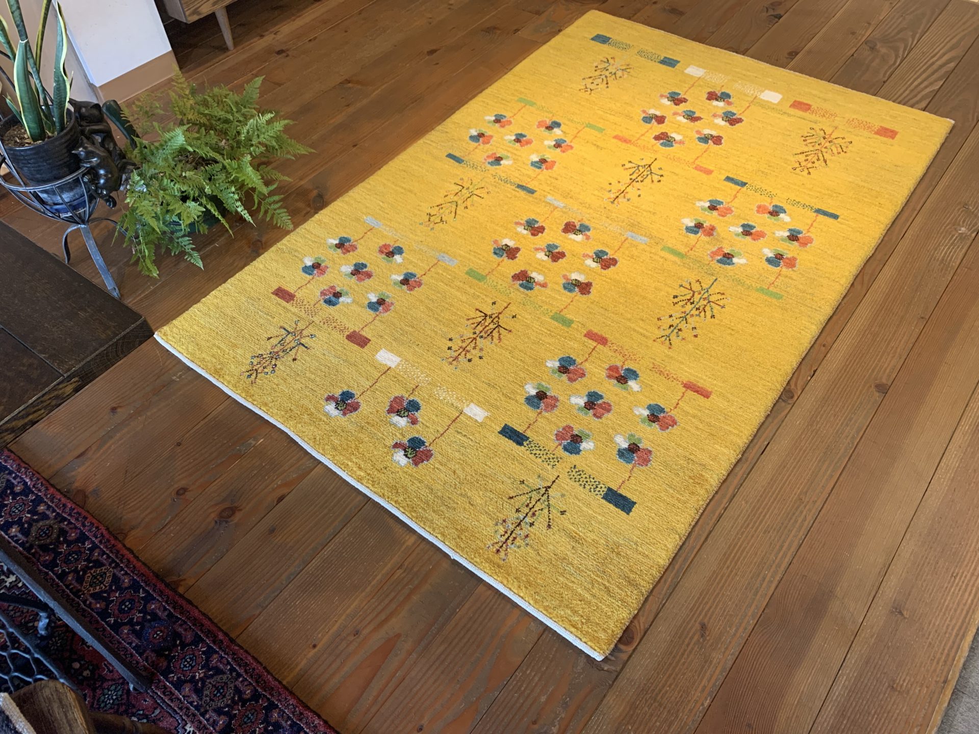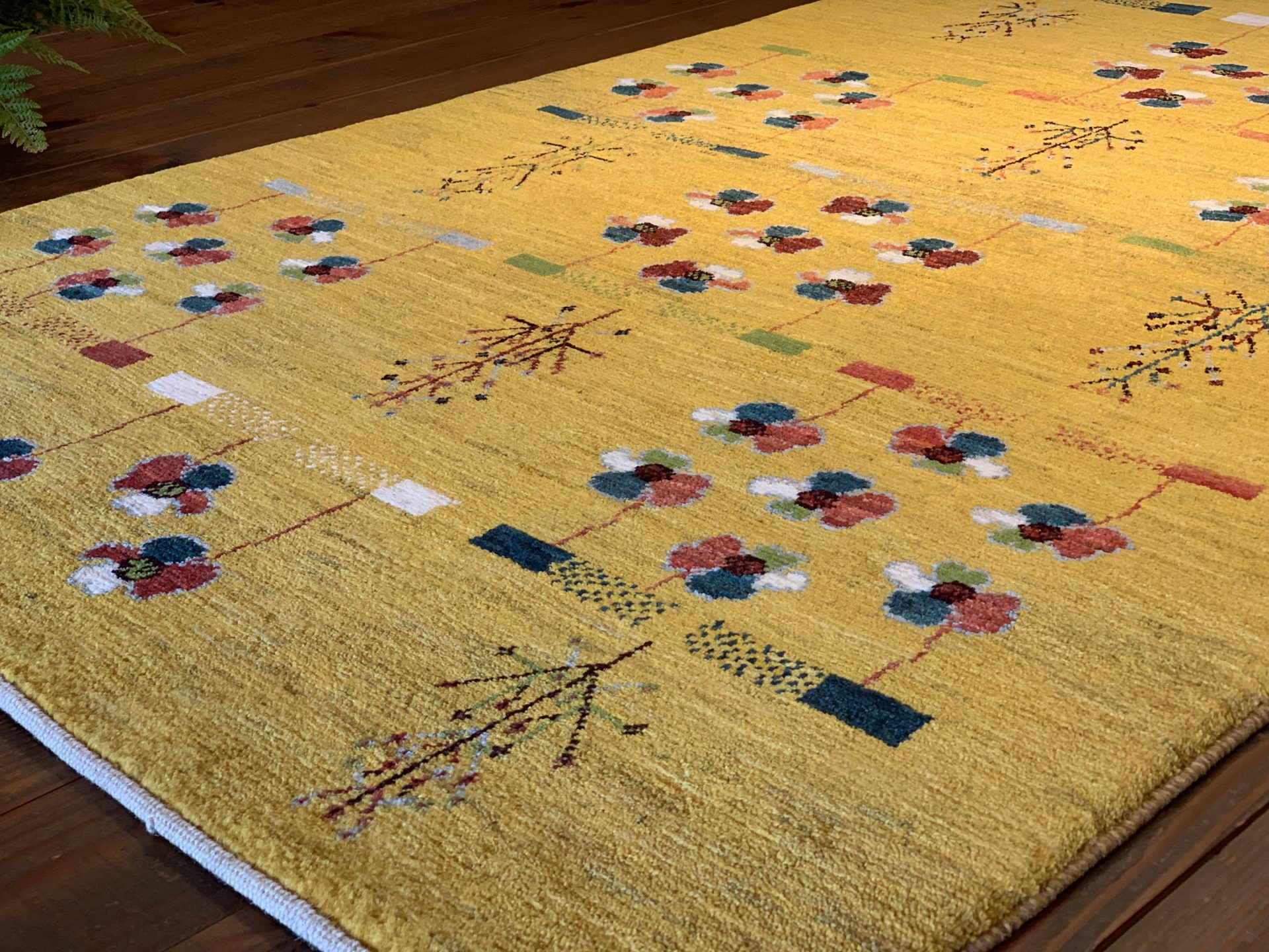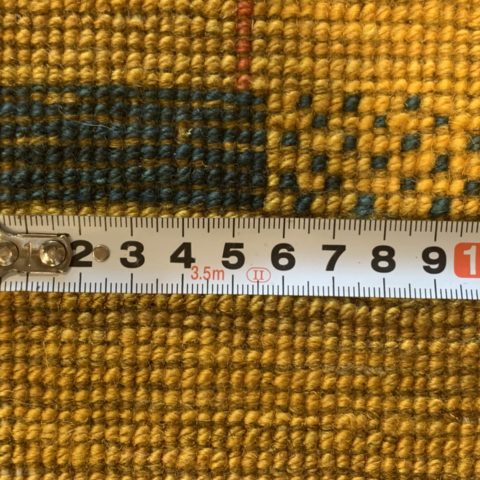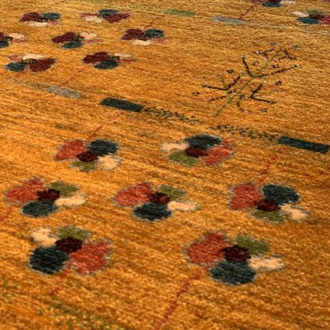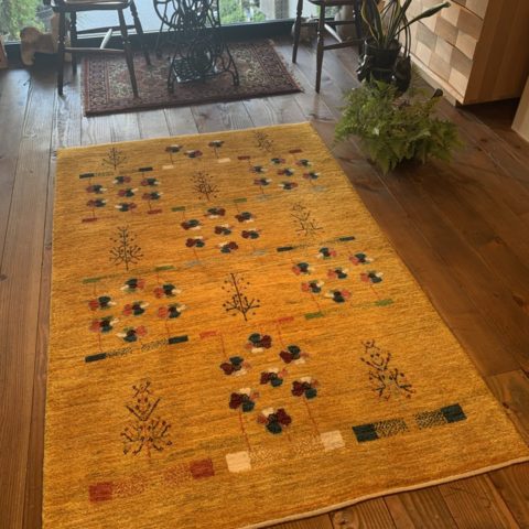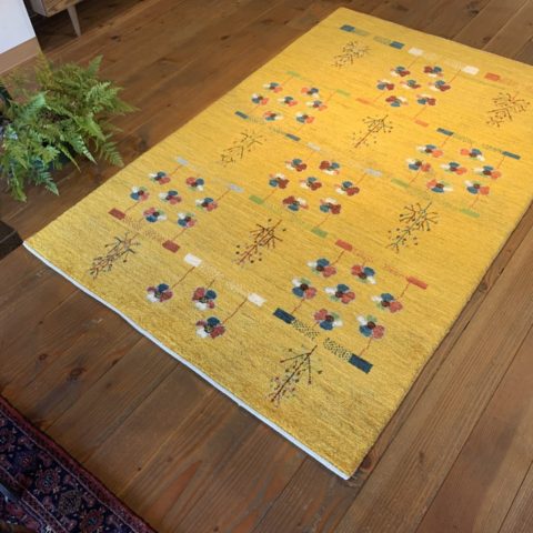 ビタミンカラーの黄色は【ザクロの皮】や【ウコン】を染料にして染色されています。フィールドには、ポピーのような可愛らしいお花が咲いていますね♪お花は遊牧民の女性たちの【春へのあこがれ】【自然への感謝】を表しているんですよ(^^)乾燥地帯でなかなかお花が咲かないシラーズの山の上では、遊牧民たちが温かい春を待ちながらギャッベを織っているのです。