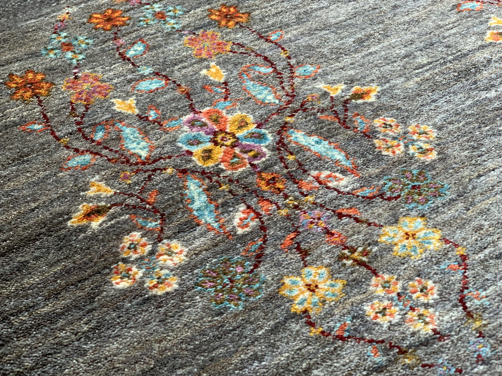 シックなグレーと華やかな花模様がとってもお洒落な一枚♪中央に置かれたお花はよく見ると『花瓶文様』で、ペルシャでは古来から【水】は生命の源として大切にされ、そこから花が咲き誇る様は『オアシス(楽園)』を表現しており、ペルシャ絨毯に多く見られる吉兆文様です。敷くだけでお部屋の雰囲気がグンとおしゃれになりそうですね^^