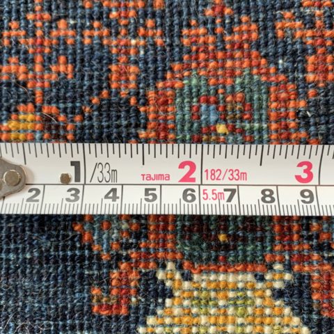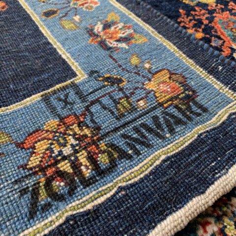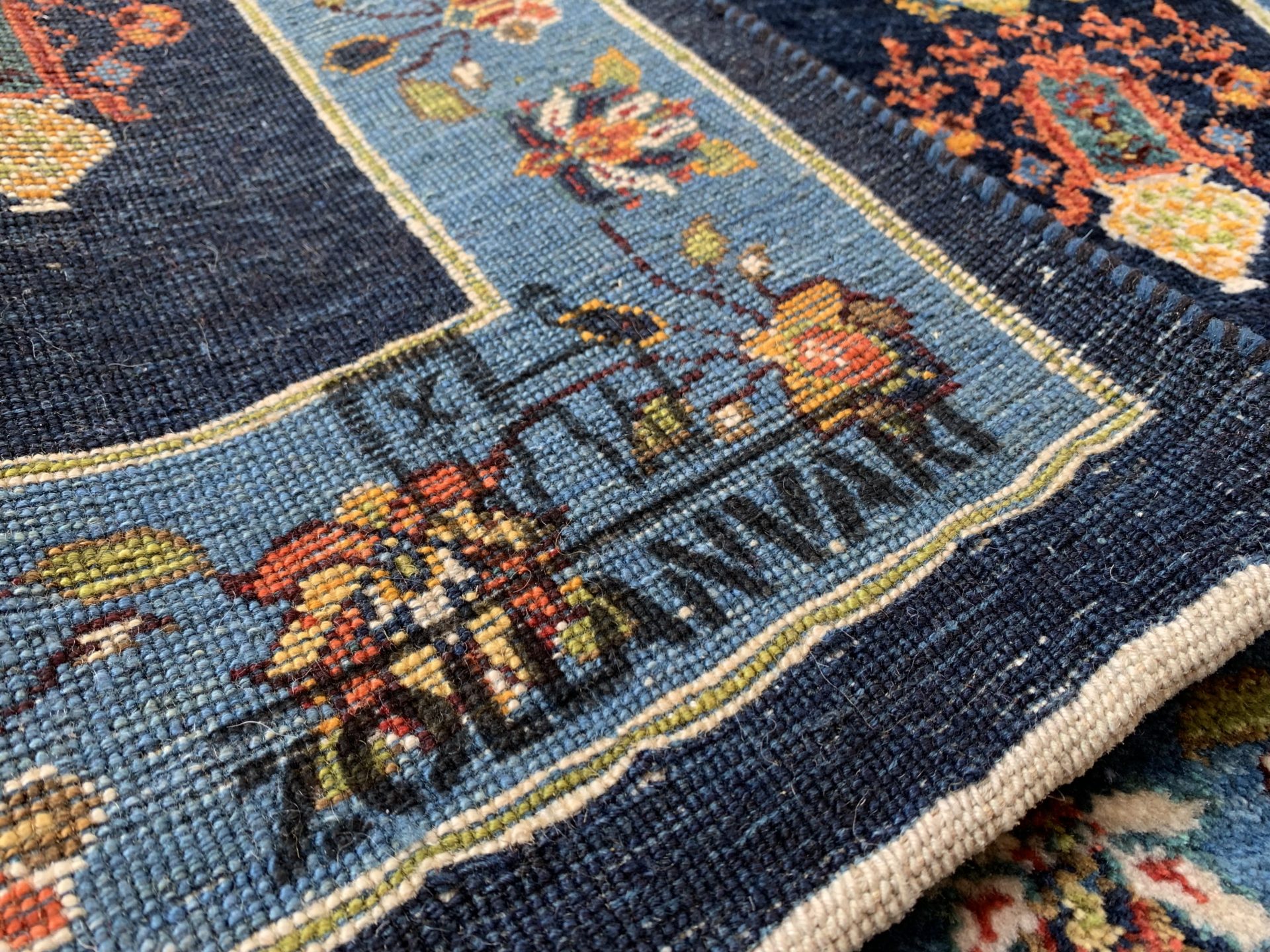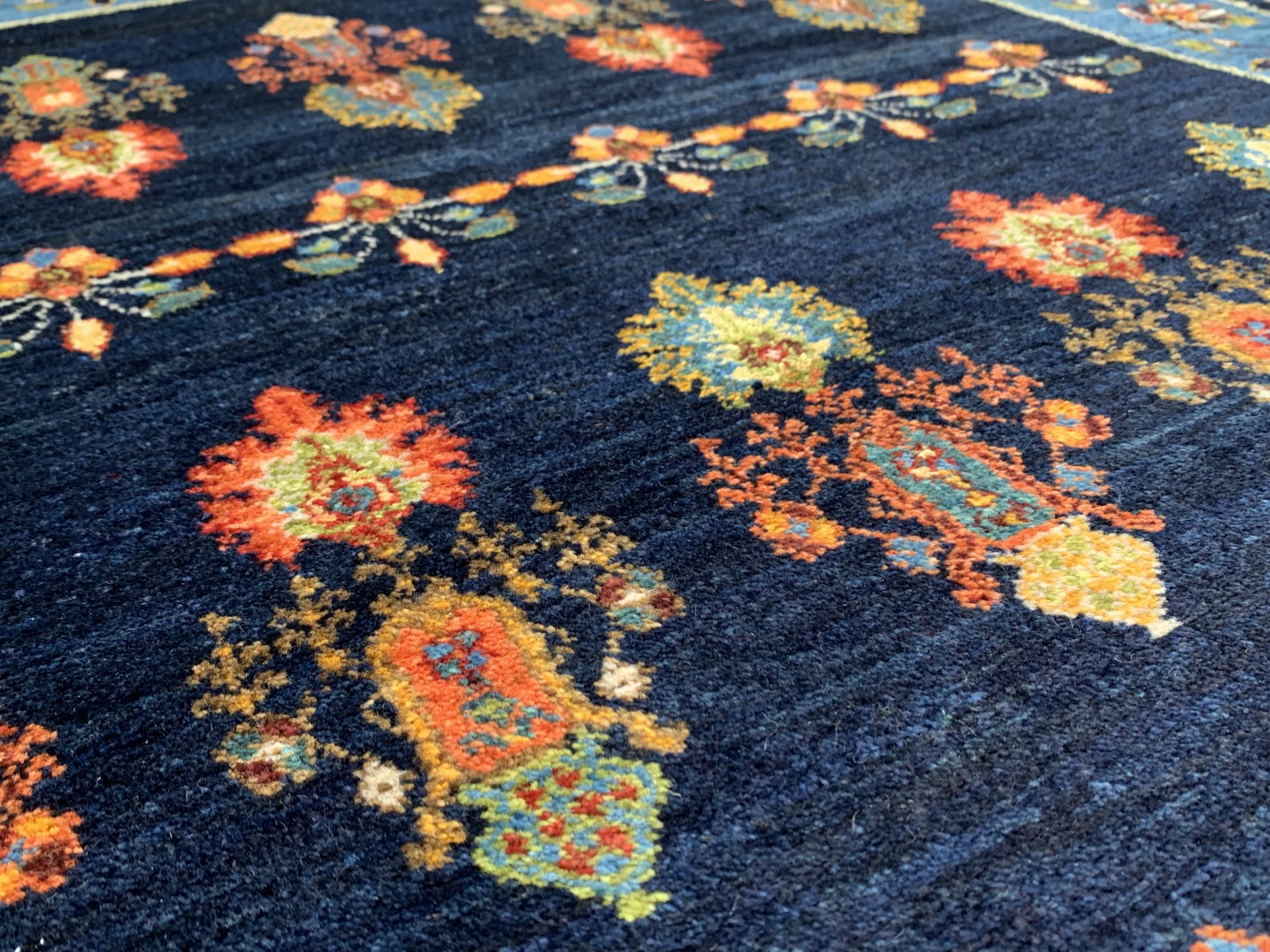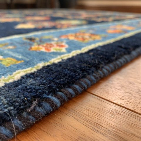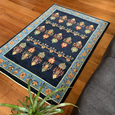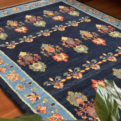 藍染のブルーのコントラストが上品で、ギャッベの最高ランクであるルリバフギャッベならではの高級感と風格が感じられますね。フィールドには【花瓶文様】が描かれており、生命を象徴する『水』から花や草木が伸びるすがたは『楽園』を表現しているのだそう。しっとりなめらかな肌触りで光沢のある美しいギャッベは、まさに【使える芸術品】の名にふさわしい一枚です。