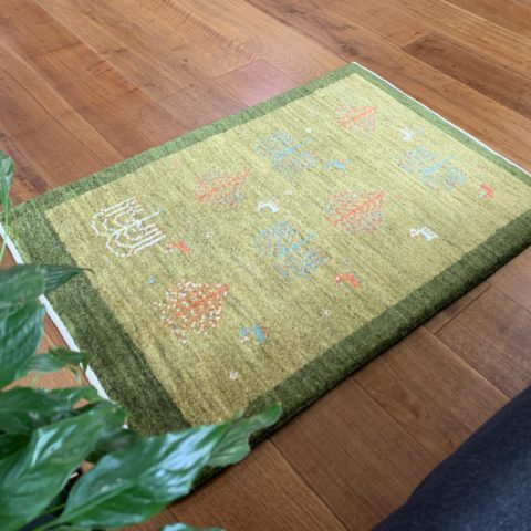100%天然草木染ならではの深みのある優しいグリーンのギャッベ。オレンジや水色のカラフルな糸で描かれた【生命の樹】や、財産を表す【羊】のモチーフが、可愛らしい彩りを添えてくれます♪玄関やベッドサイドなどのアクセントに、手作りのぬくもりを感じる素朴なギャッベが体も心も温かく包んでくれますよ^^