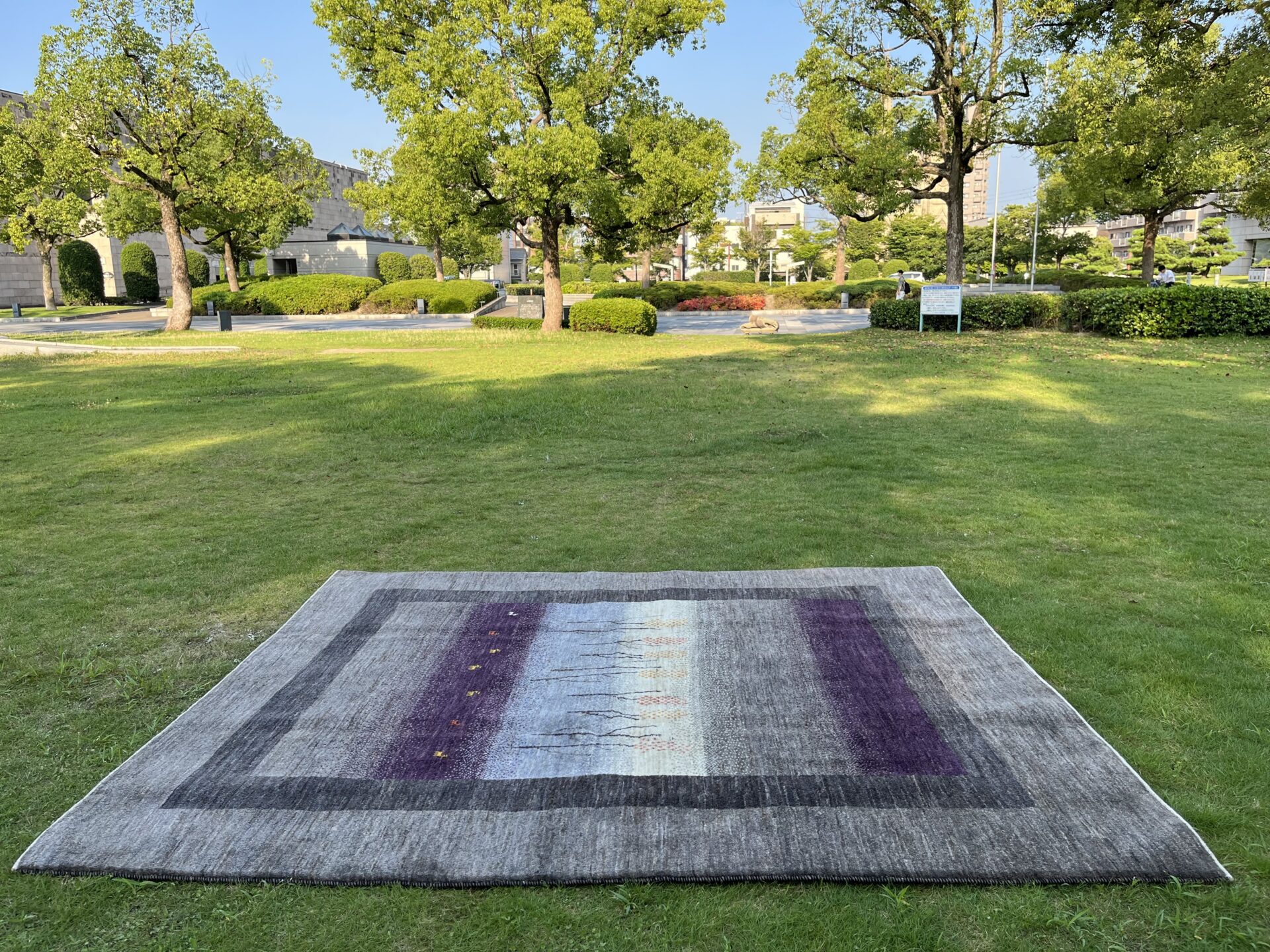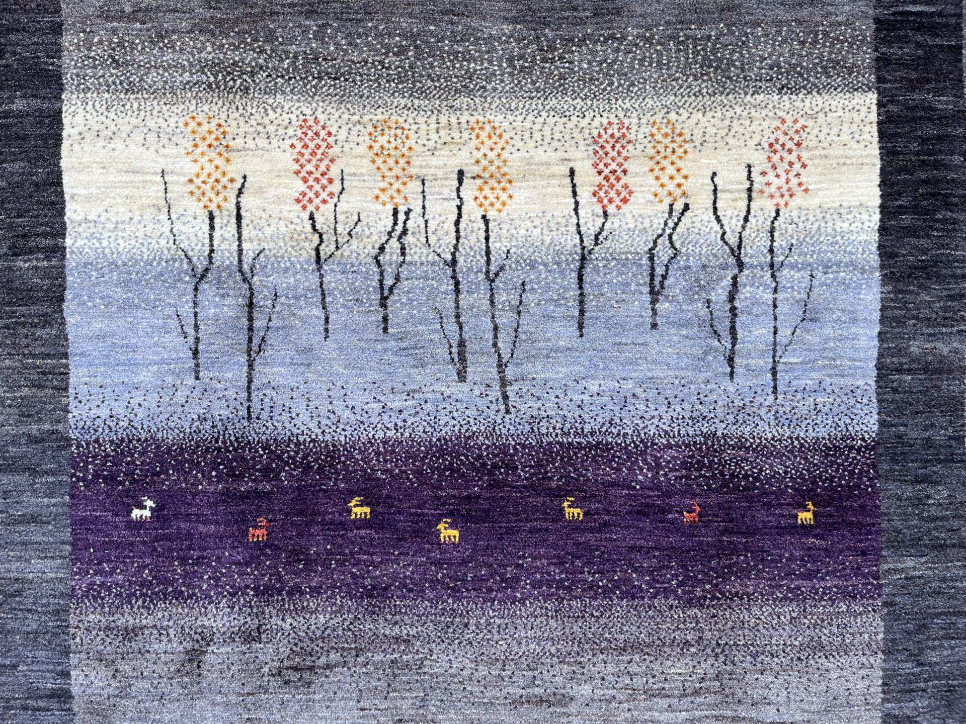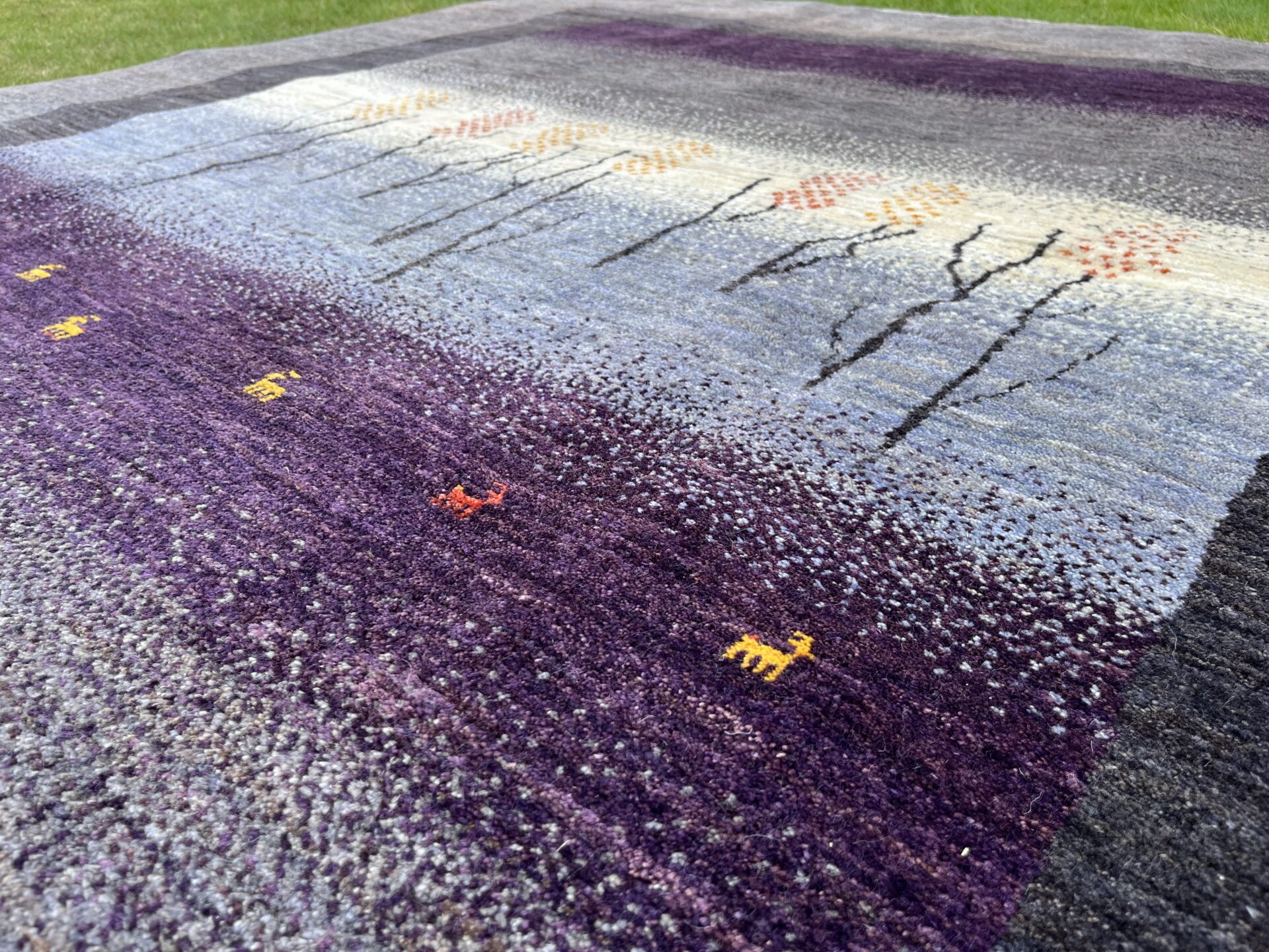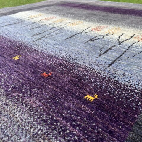 グレーとパープルの組み合わせで、何とも神秘的な雰囲気漂う珍しい特大サイズです。個性的な生命の木のそばで羊さんが歩く風景は、まるで異世界に迷い込んだかのよう。落ち着きのある色彩の中に光る織子さんの美術的感性に、自然と奥深さを感じ魅せられてしまう…そんな不思議なギャッベです。