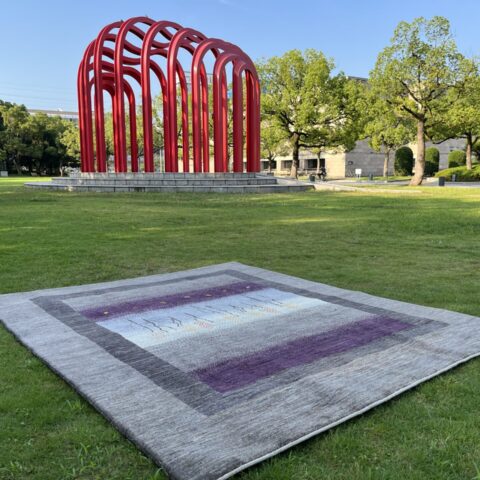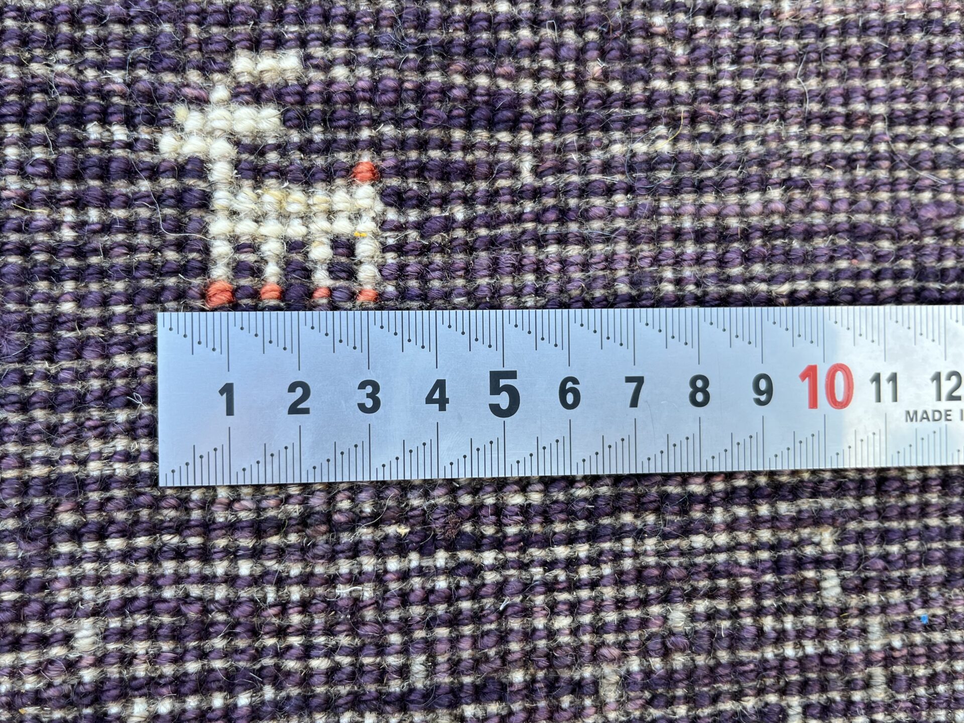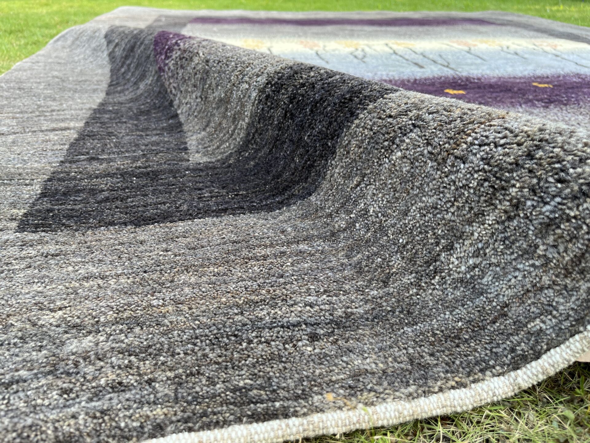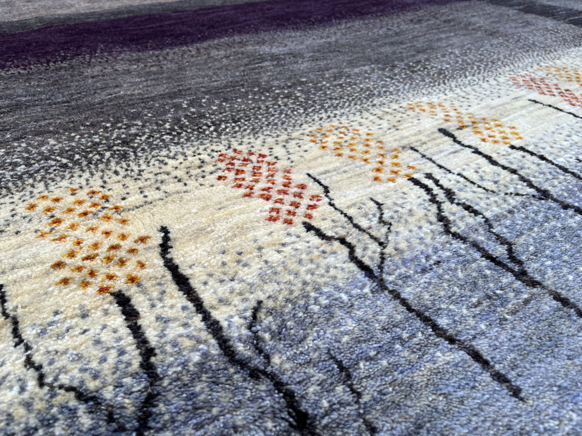 グレーとパープルの組み合わせで、何とも神秘的な雰囲気漂う珍しい特大サイズです。個性的な生命の木のそばで羊さんが歩く風景は、まるで異世界に迷い込んだかのよう。落ち着きのある色彩の中に光る織子さんの美術的感性に、自然と奥深さを感じ魅せられてしまう…そんな不思議なギャッベです。