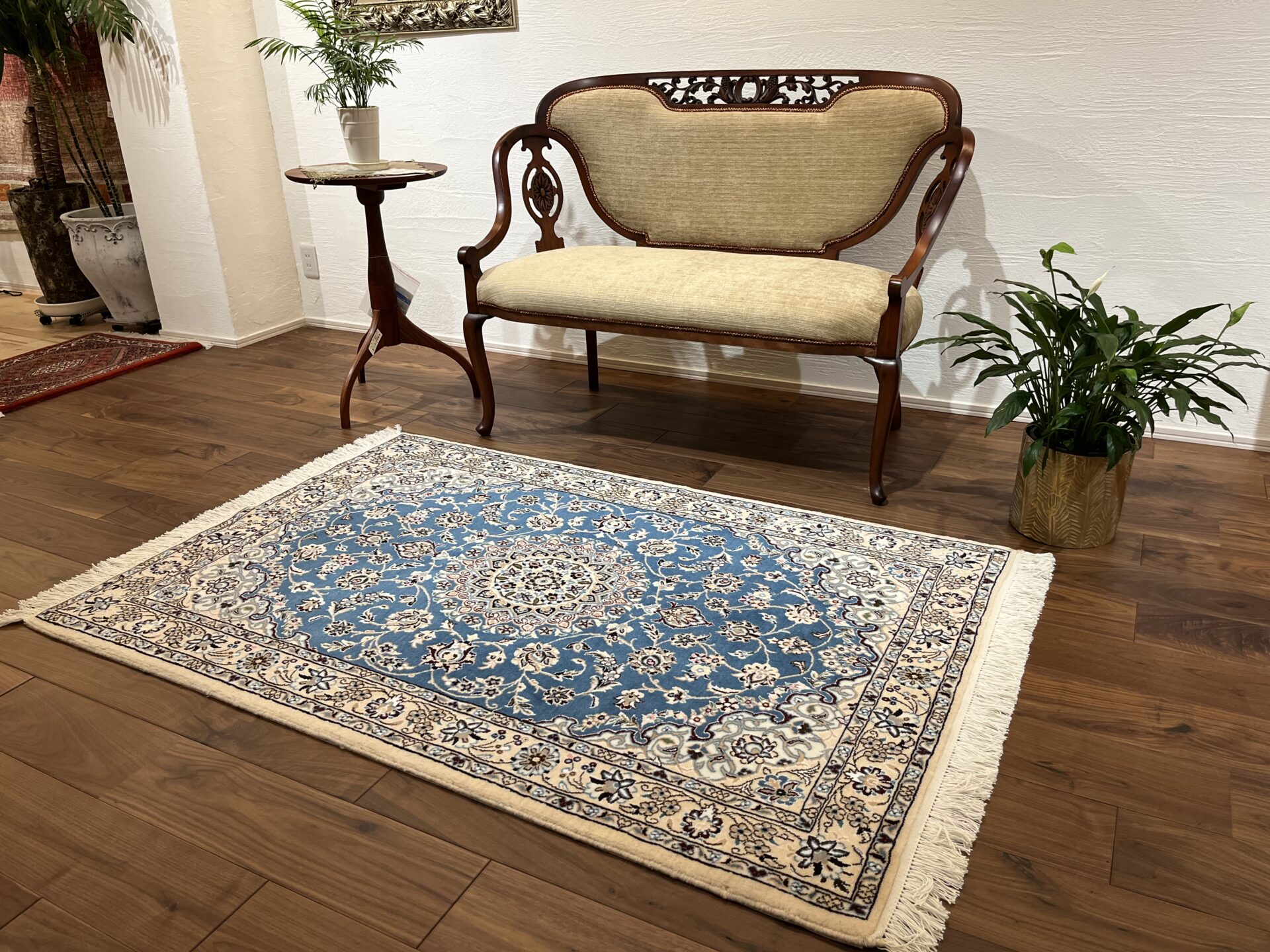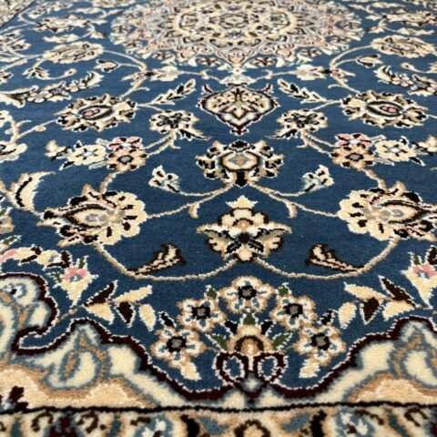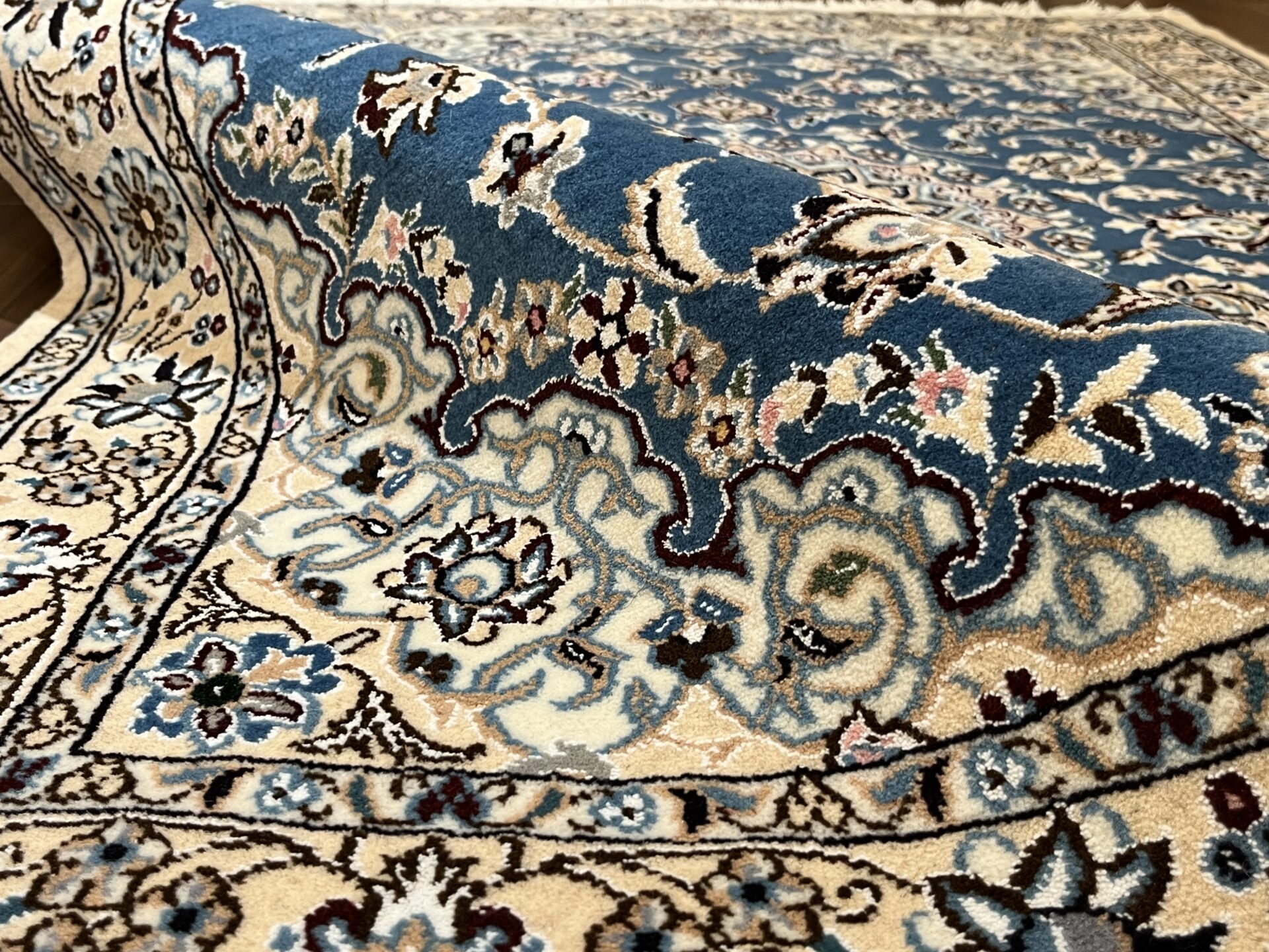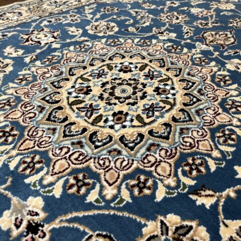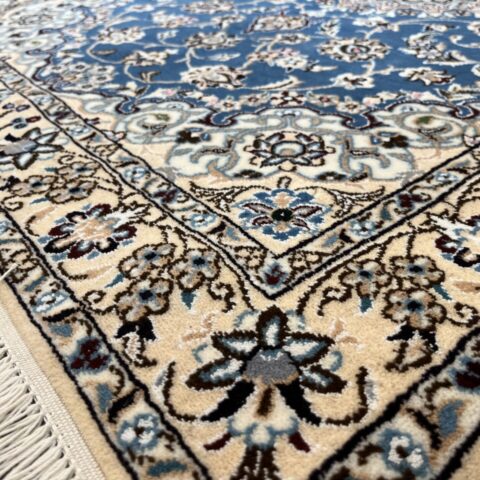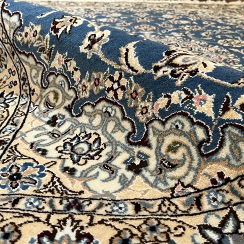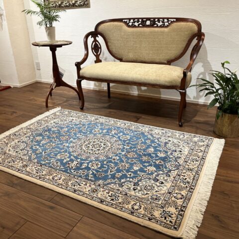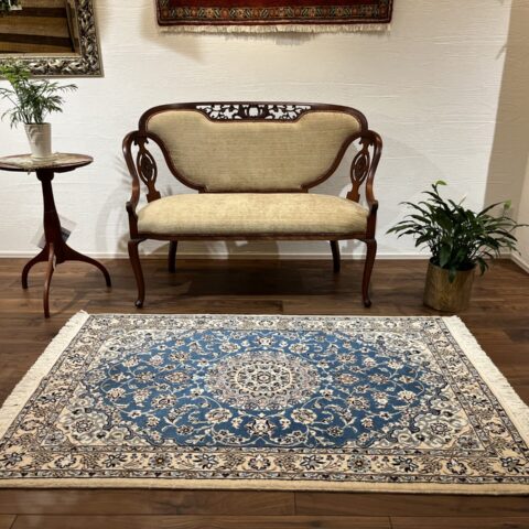落ち着きと気品のある一枚。ナインペルシャの代表的なカラー、ベージュとブルーの組み合わせがお部屋を一段と格調高くしてくれますよ♪ナインは産地の名前でかつては男性用手織りマントの産地で高い手織りの技術を持っていたことから絨毯業に転換後も急速に有名な絨毯の産地として成長した都市です。落ち着きのある色味のものが多く、昨今日本での人気も高まってきています。