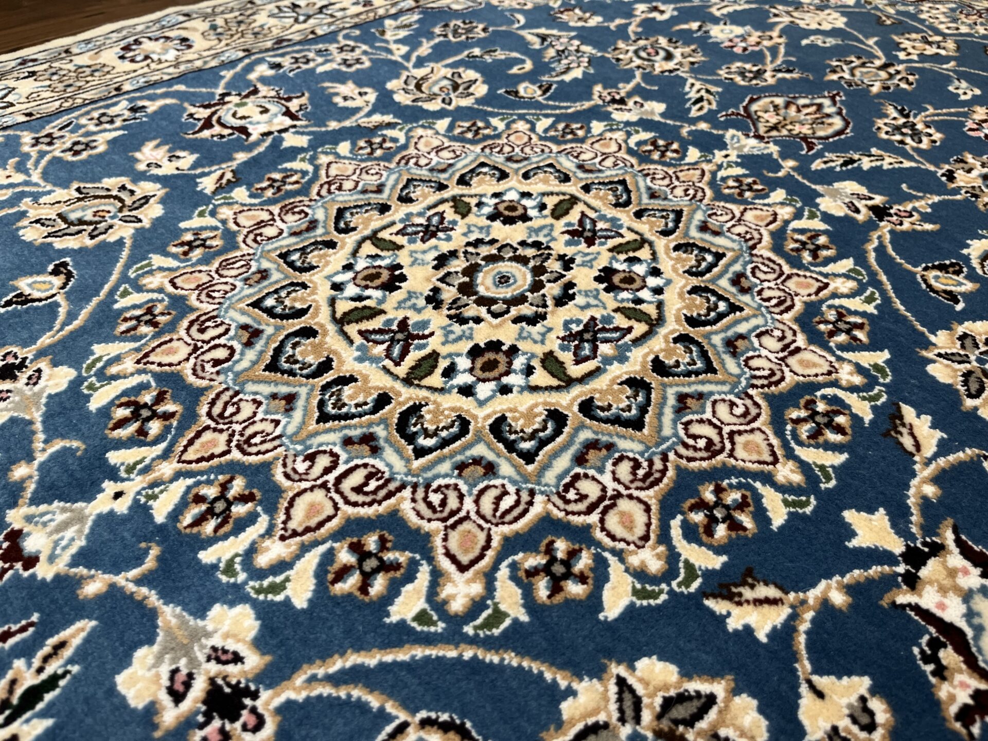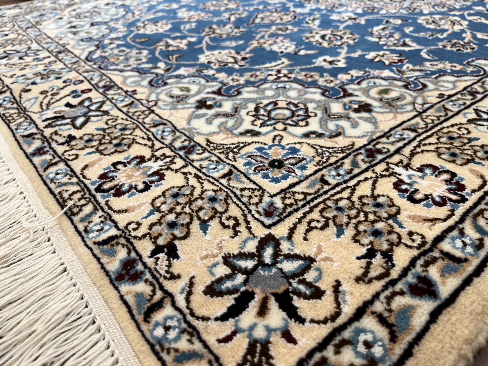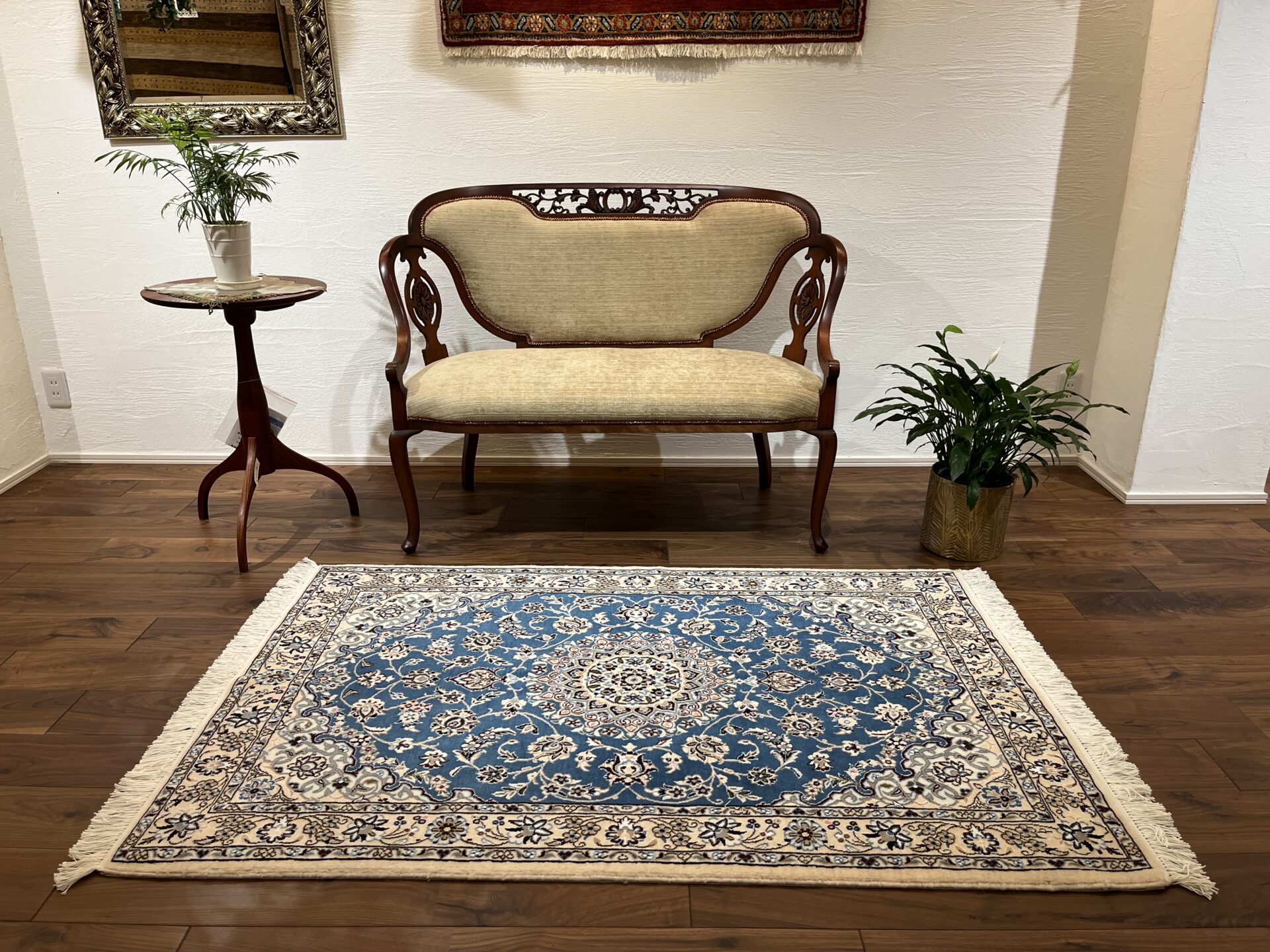 落ち着きと気品のある一枚。ナインペルシャの代表的なカラー、ベージュとブルーの組み合わせがお部屋を一段と格調高くしてくれますよ♪ナインは産地の名前でかつては男性用手織りマントの産地で高い手織りの技術を持っていたことから絨毯業に転換後も急速に有名な絨毯の産地として成長した都市です。落ち着きのある色味のものが多く、昨今日本での人気も高まってきています。