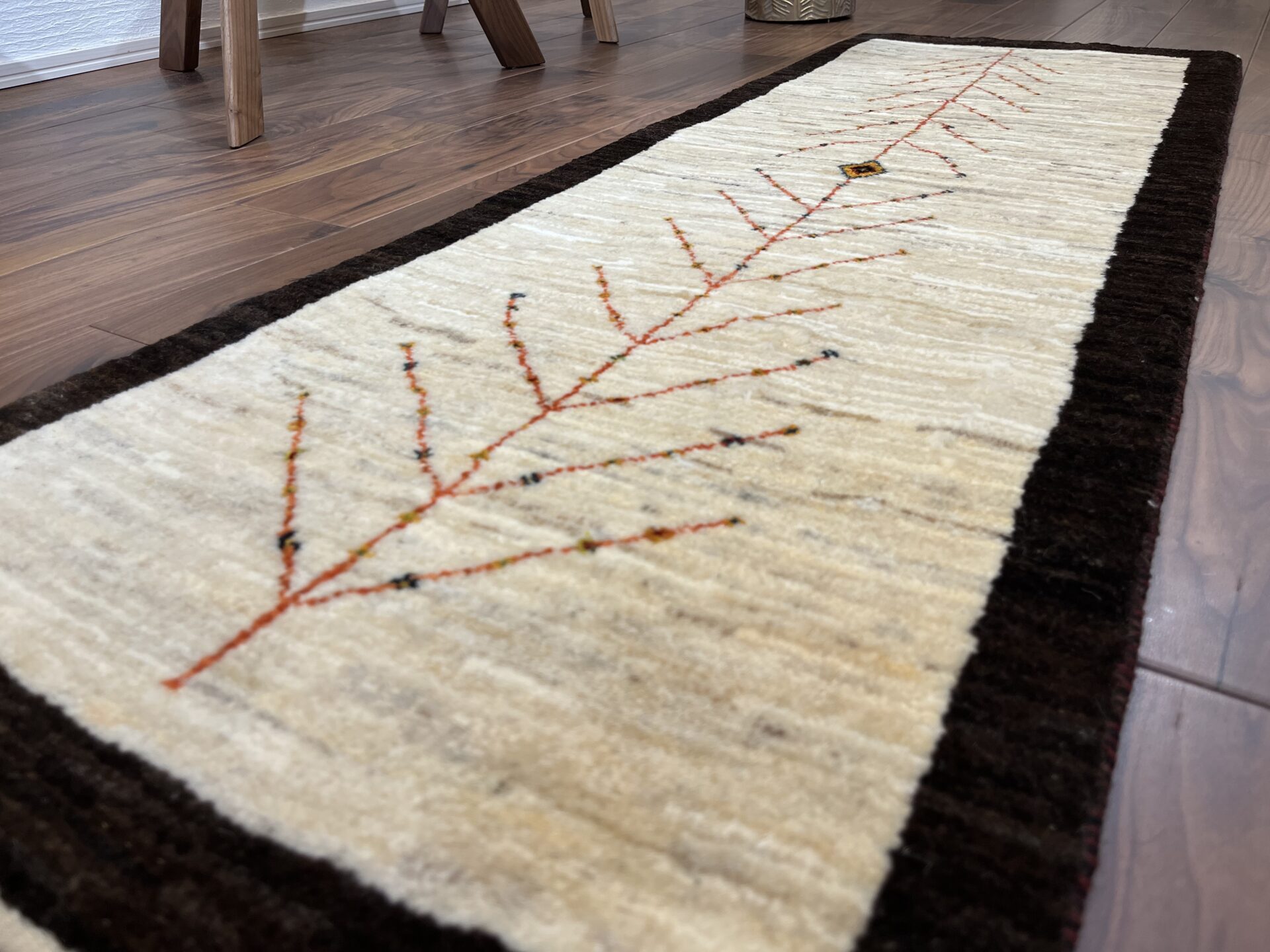 シンプルな無染色の原毛ギャッベは、どんなお部屋にも馴染みやすいのでとても人気です。天地から伸びた生命の木は「家族がいつまでも健康でいられますように」という想いが込められており、中央のひし形は「魔除け」の象徴なんですよ♪ささやかに、お家をあたため守ってくれそうな素敵なギャッベです。