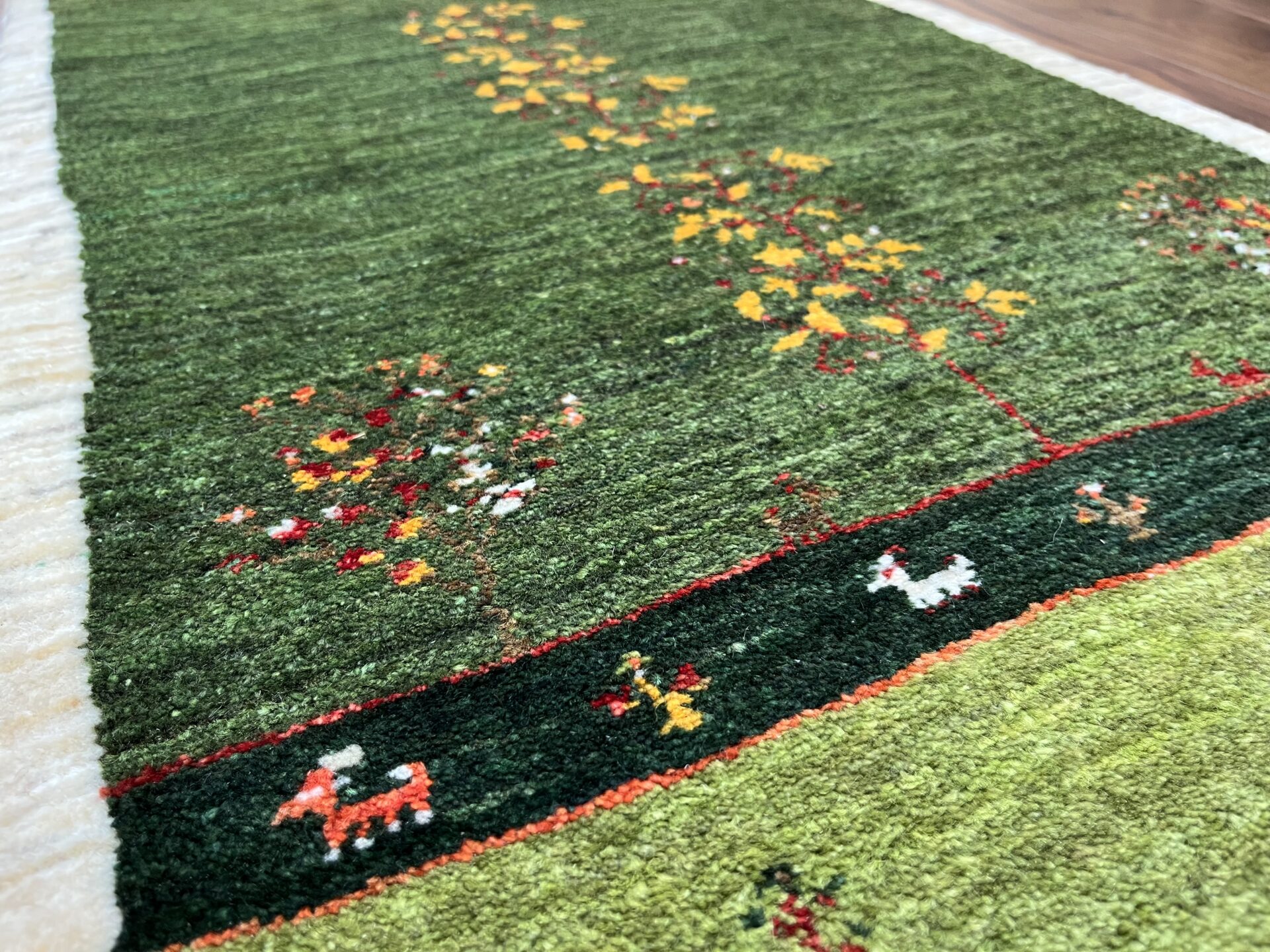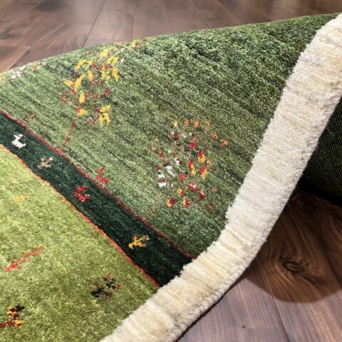 草原のような青々とした緑が見ているだけで清々しい気持ちにしてくれるカシュクリギャッベ。カシュクリギャッベは、糸が細いものを使用するため、織りが細かく、より密度の高い品質の良い絨毯になります。まわりの原毛(無染色の毛)が額縁のようになって、まるで絵画のような一枚です。
