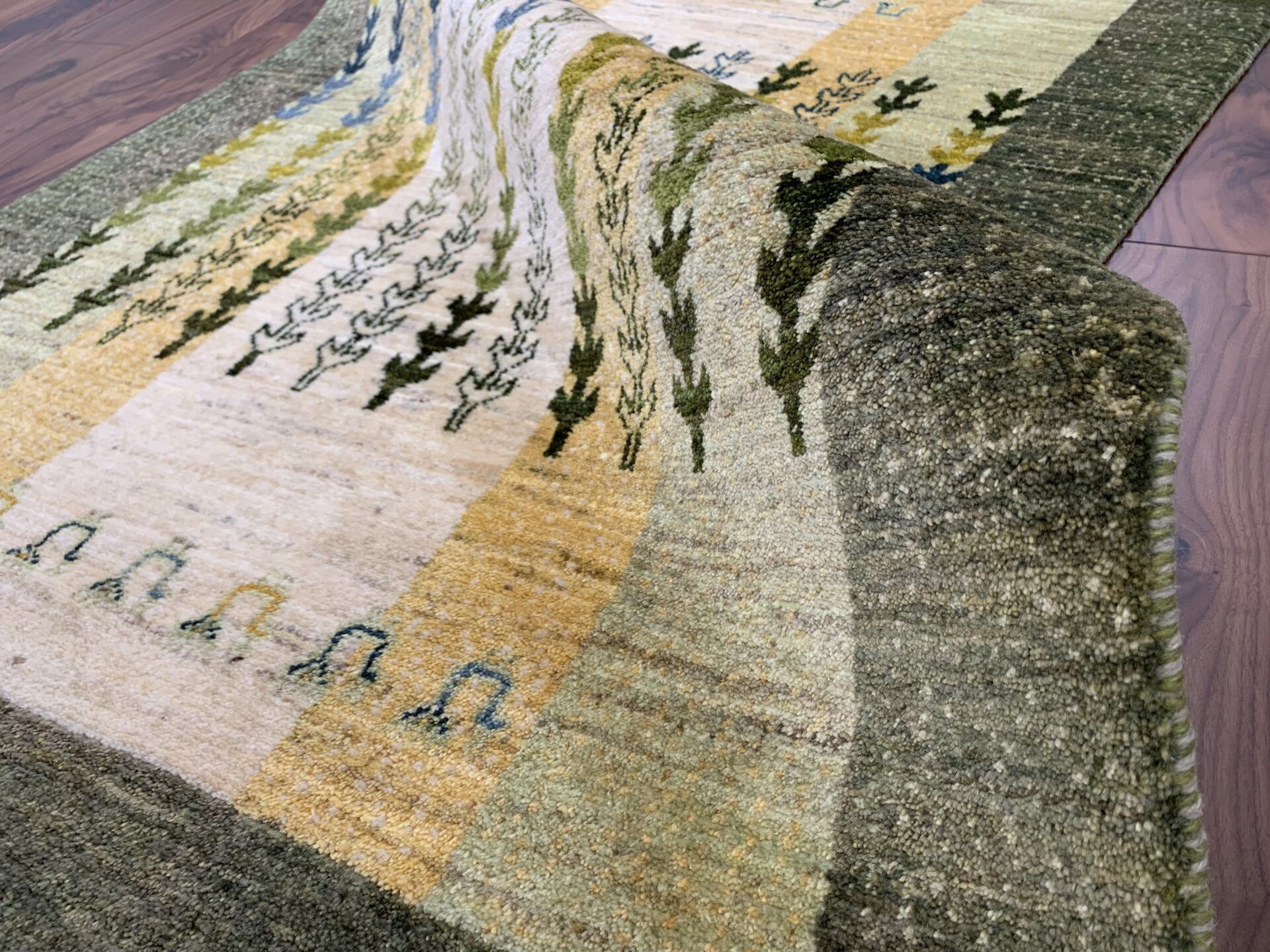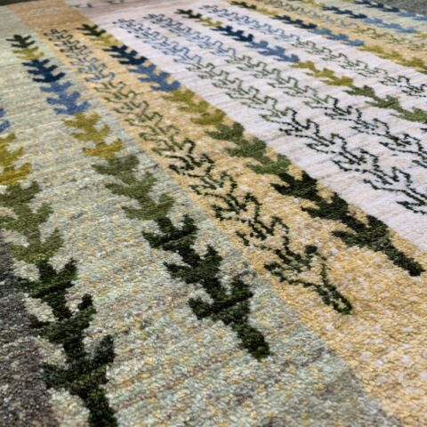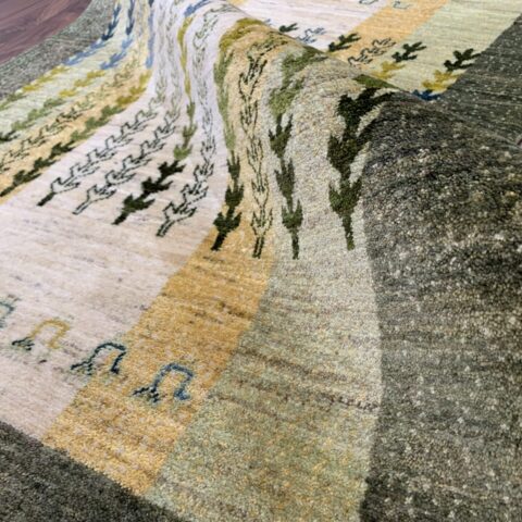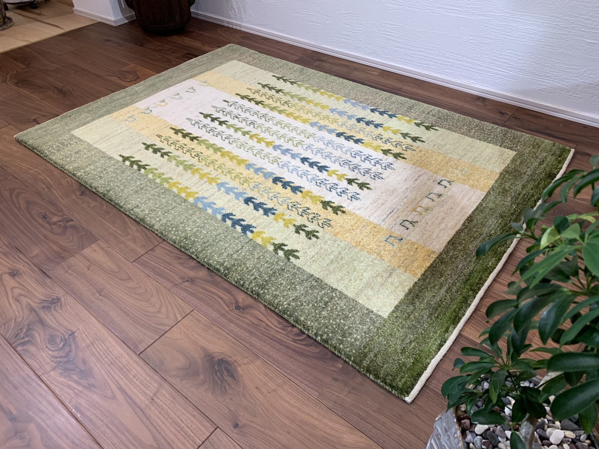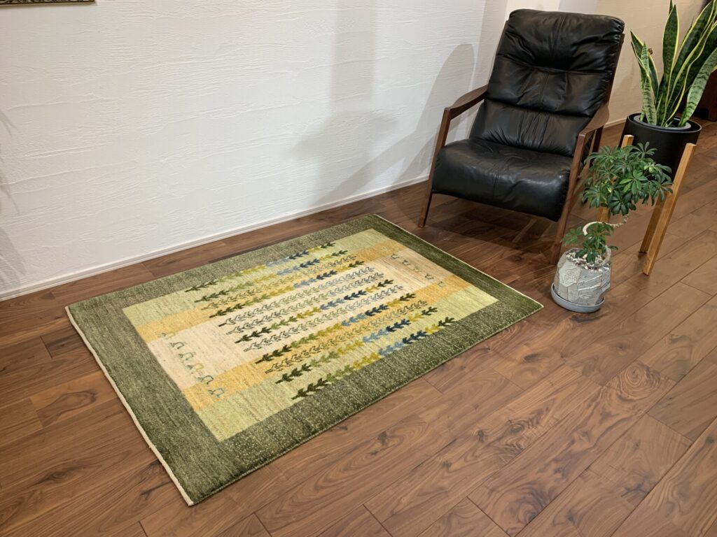 中央に並ぶのは「子孫繫栄」を願う「生命の木」の文様です。蔓のように簡素なデザインで天地を気にせず敷けますね!生命の木の上下にあるのは実は「孔雀」の文様です。孔雀は女性の「美の象徴」ともいわれ、いつまでも美しくいられますようにという願いが込められています。ギャッベの向きを変えると、色の濃淡に変化があり雰囲気がガラリと変わりますよ!これは織子さんが一定方向から織り進めることにより順目と逆目ができるからなんです。季節によって敷く向きを変えて変化も楽しんで下さいね。