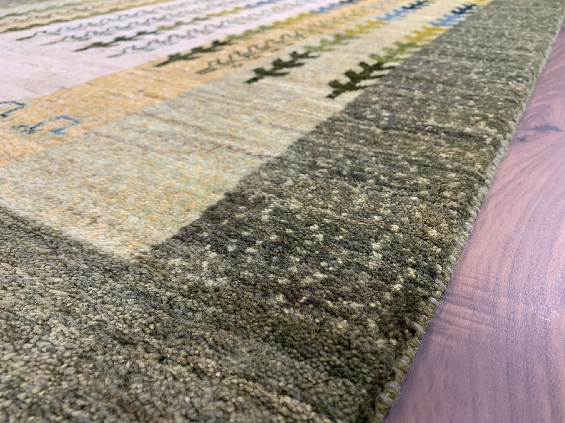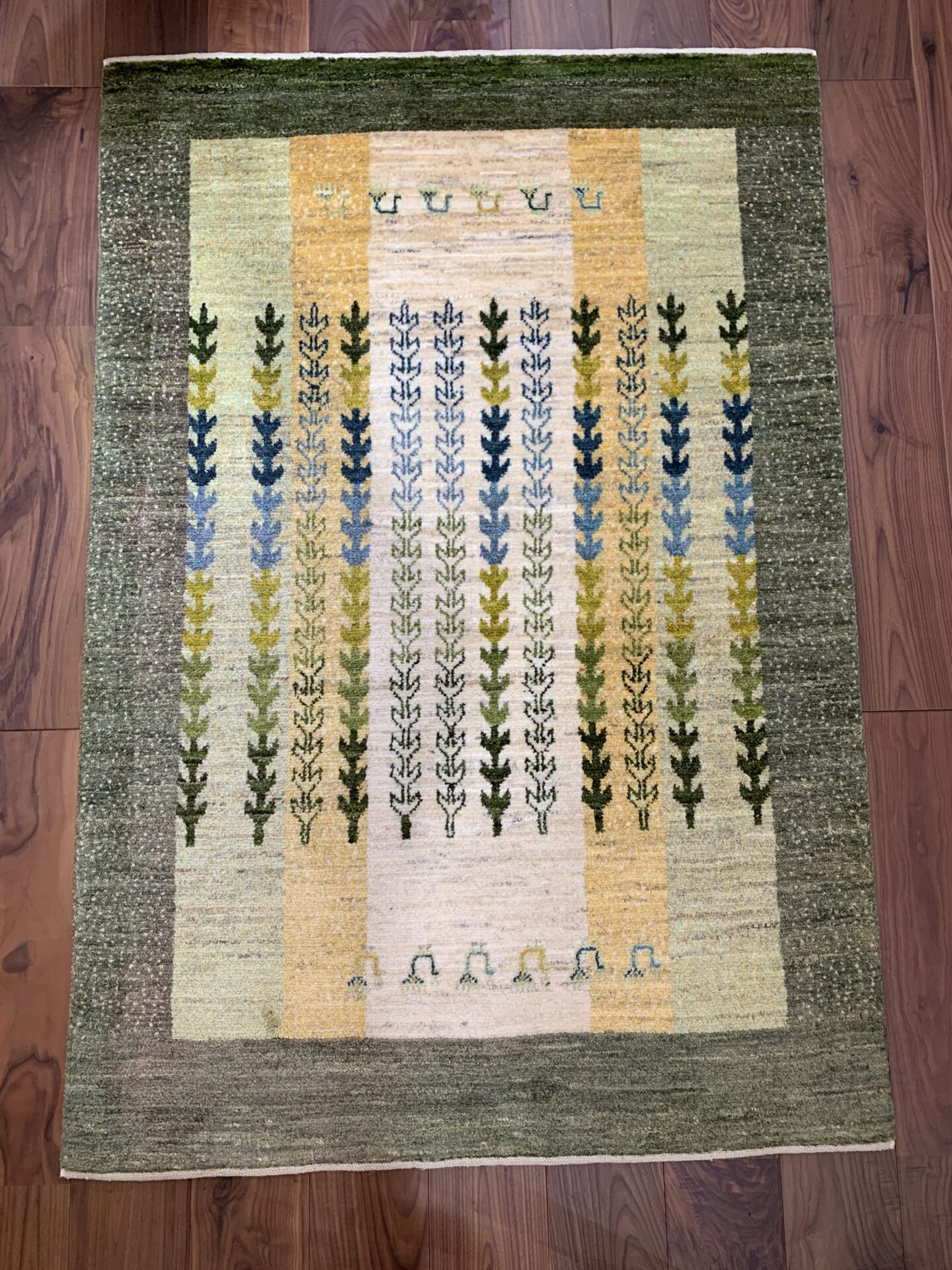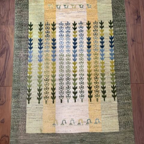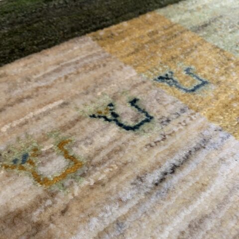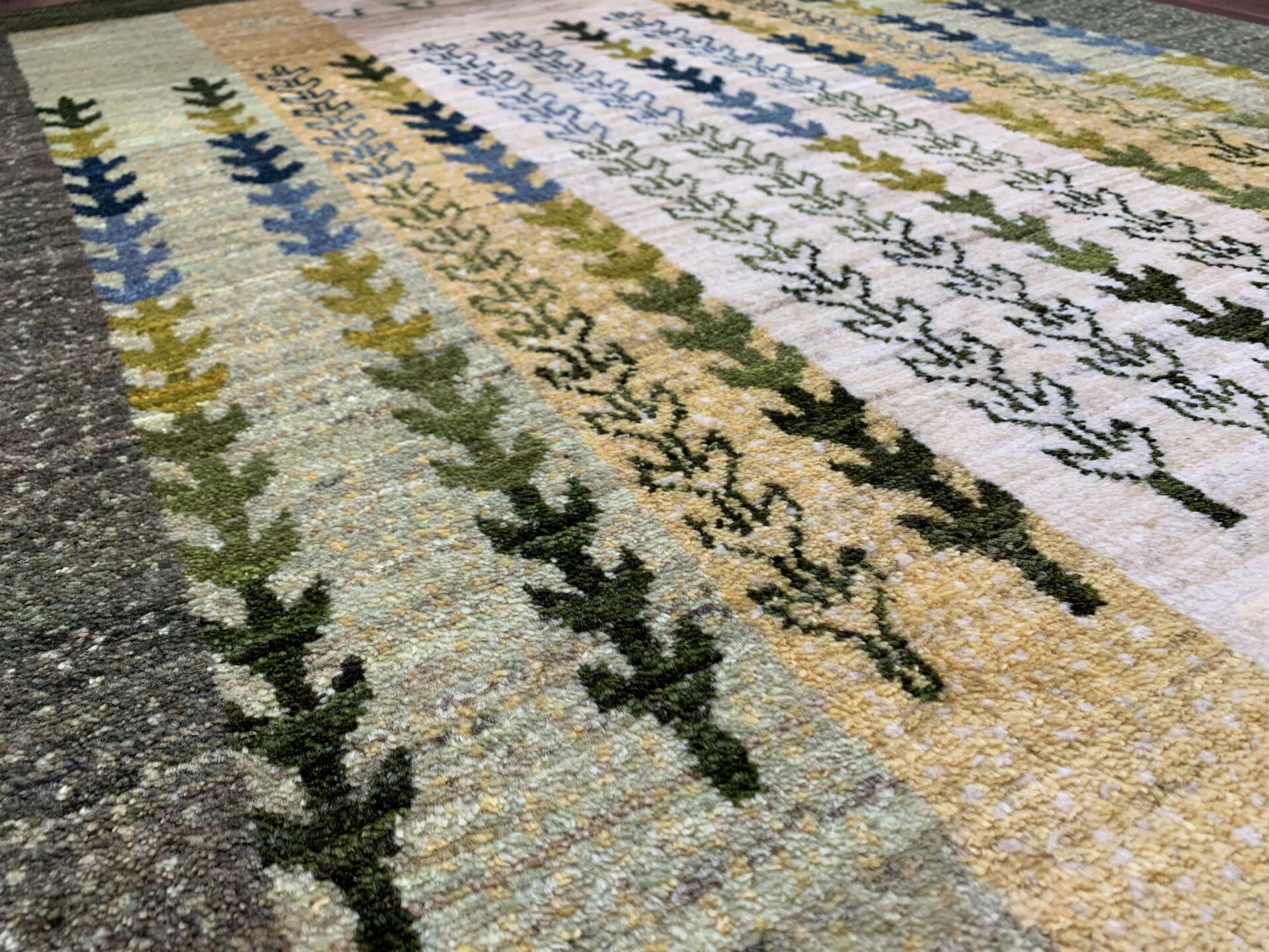中央に並ぶのは「子孫繫栄」を願う「生命の木」の文様です。蔓のように簡素なデザインで天地を気にせず敷けますね!生命の木の上下にあるのは実は「孔雀」の文様です。孔雀は女性の「美の象徴」ともいわれ、いつまでも美しくいられますようにという願いが込められています。ギャッベの向きを変えると、色の濃淡に変化があり雰囲気がガラリと変わりますよ!これは織子さんが一定方向から織り進めることにより順目と逆目ができるからなんです。季節によって敷く向きを変えて変化も楽しんで下さいね。