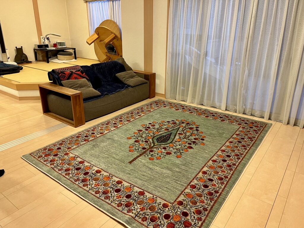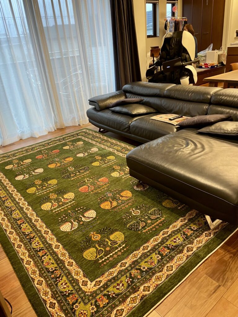以前、お買い上げいただいたペルシャ絨毯を食卓の下に敷き変え、リビングの中央に縁起の良い孔雀柄でますますおうちが繁栄しそうですねぇ〜🦚🌟