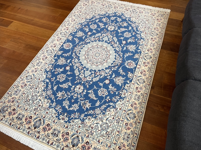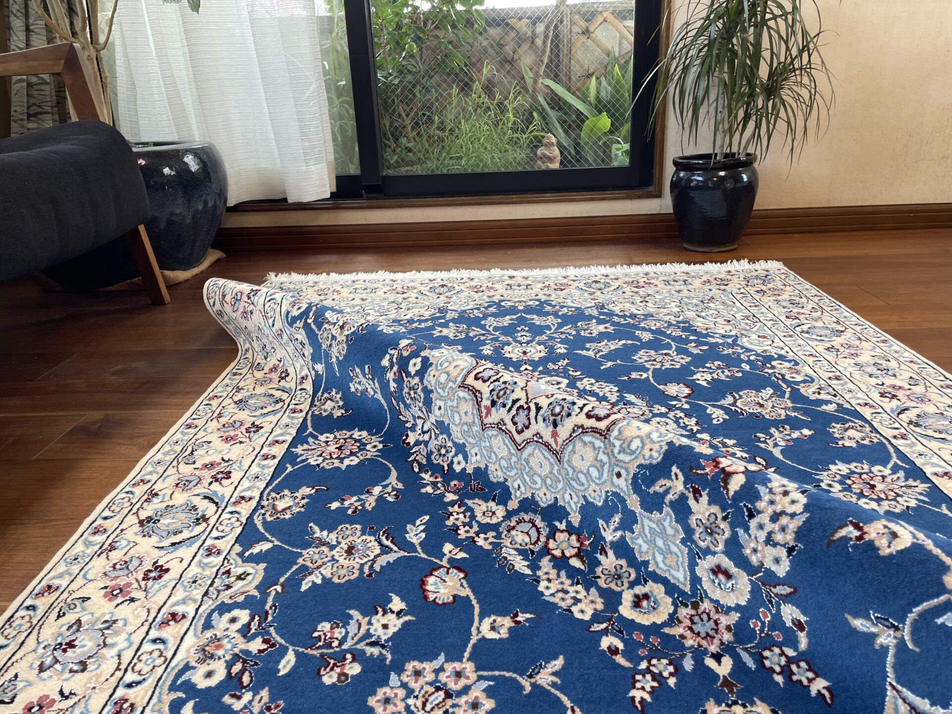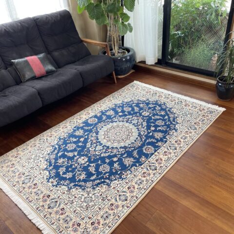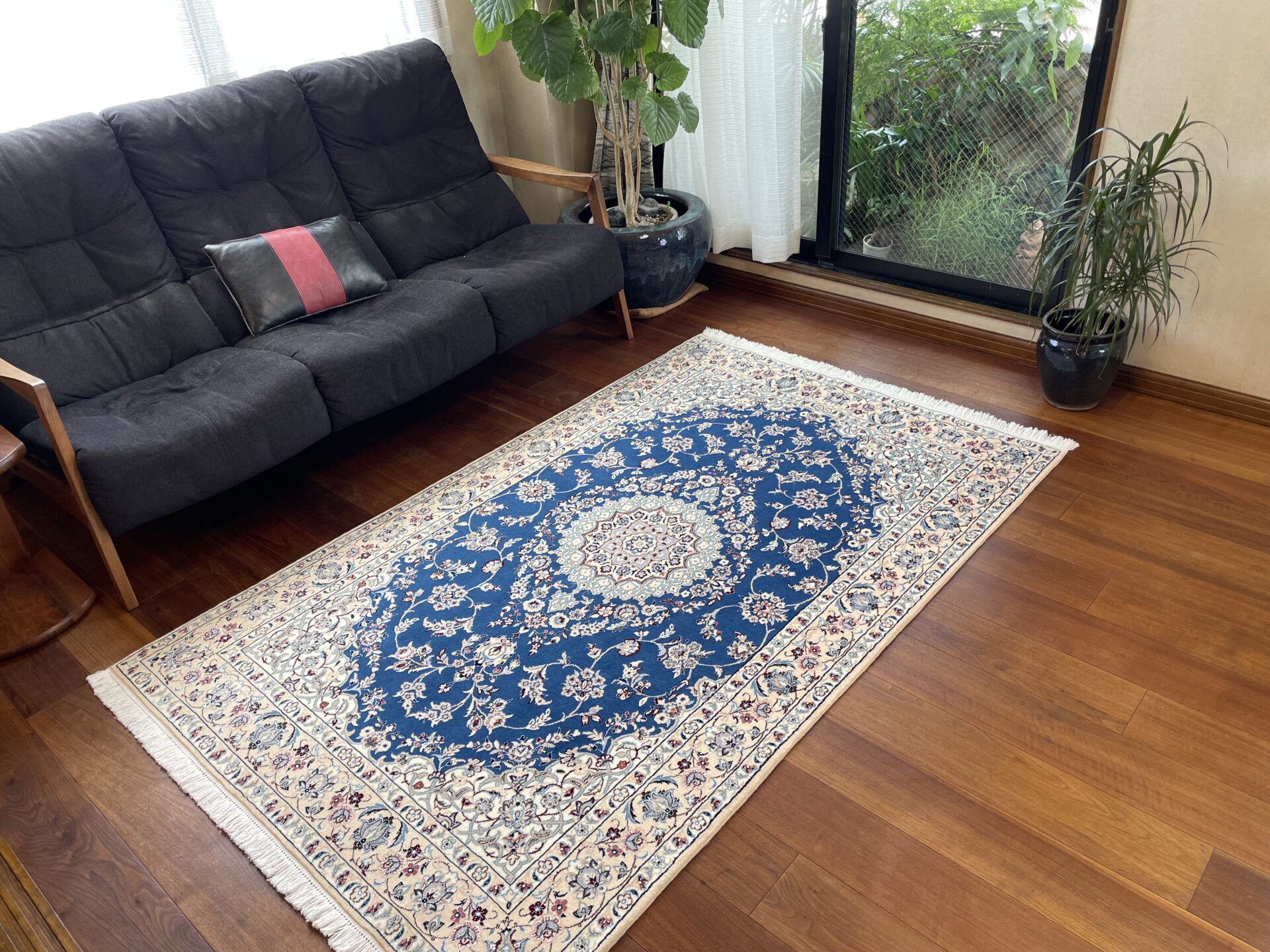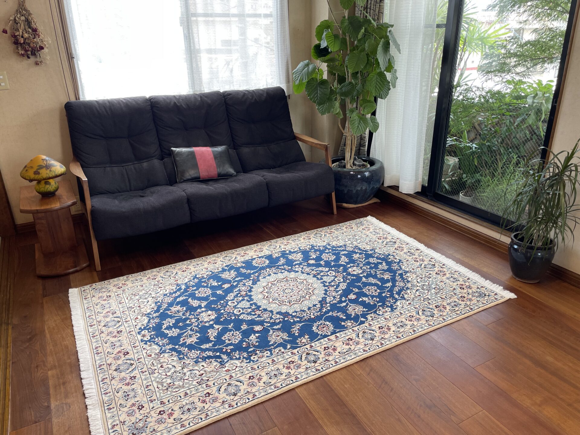 ペルシャ絨毯の五大産地でもある【ナイン】は、ベージュ系のベースカラーでお部屋に合わせやすいと人気の高い産地です。たて糸に綿を使用しているため、ギャッベよりも織り目が細かく、密度も高いため、ゴミが中まで入り込まないのも良い点。日々のメンテナンスは、掃除機だけで十分です。中央のブルーとベージュのコントラストがユニークな作品ですね。