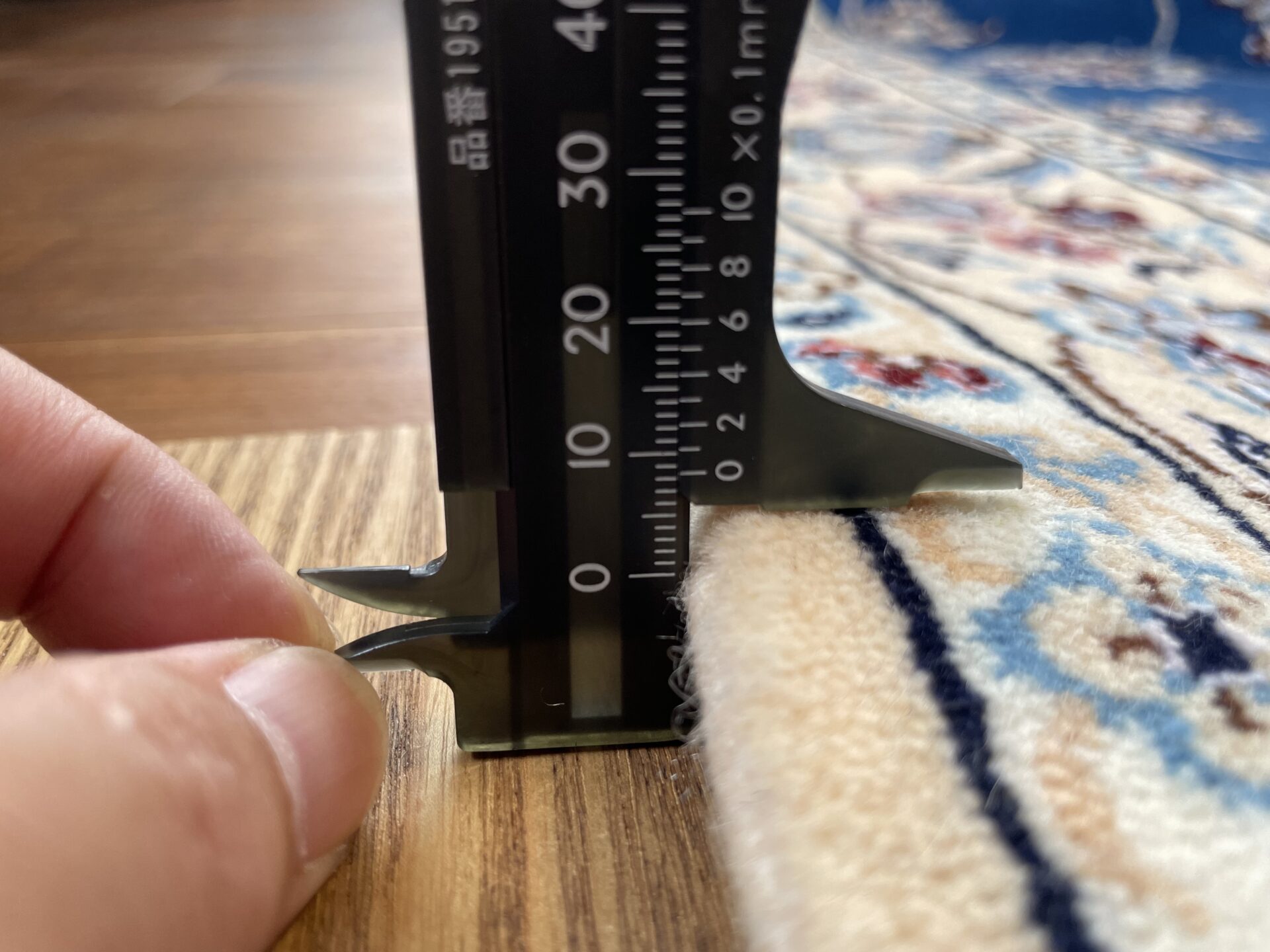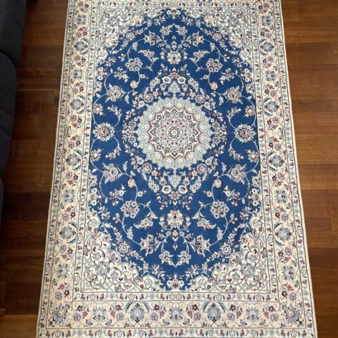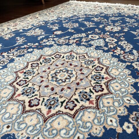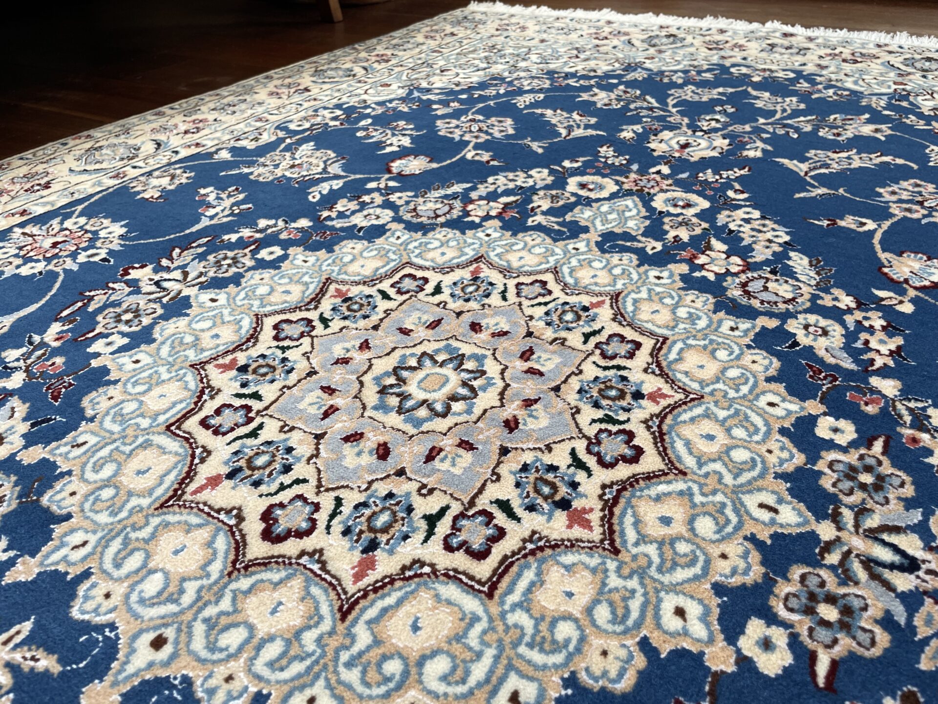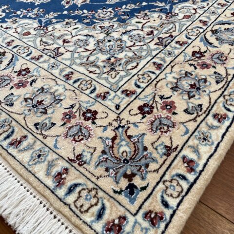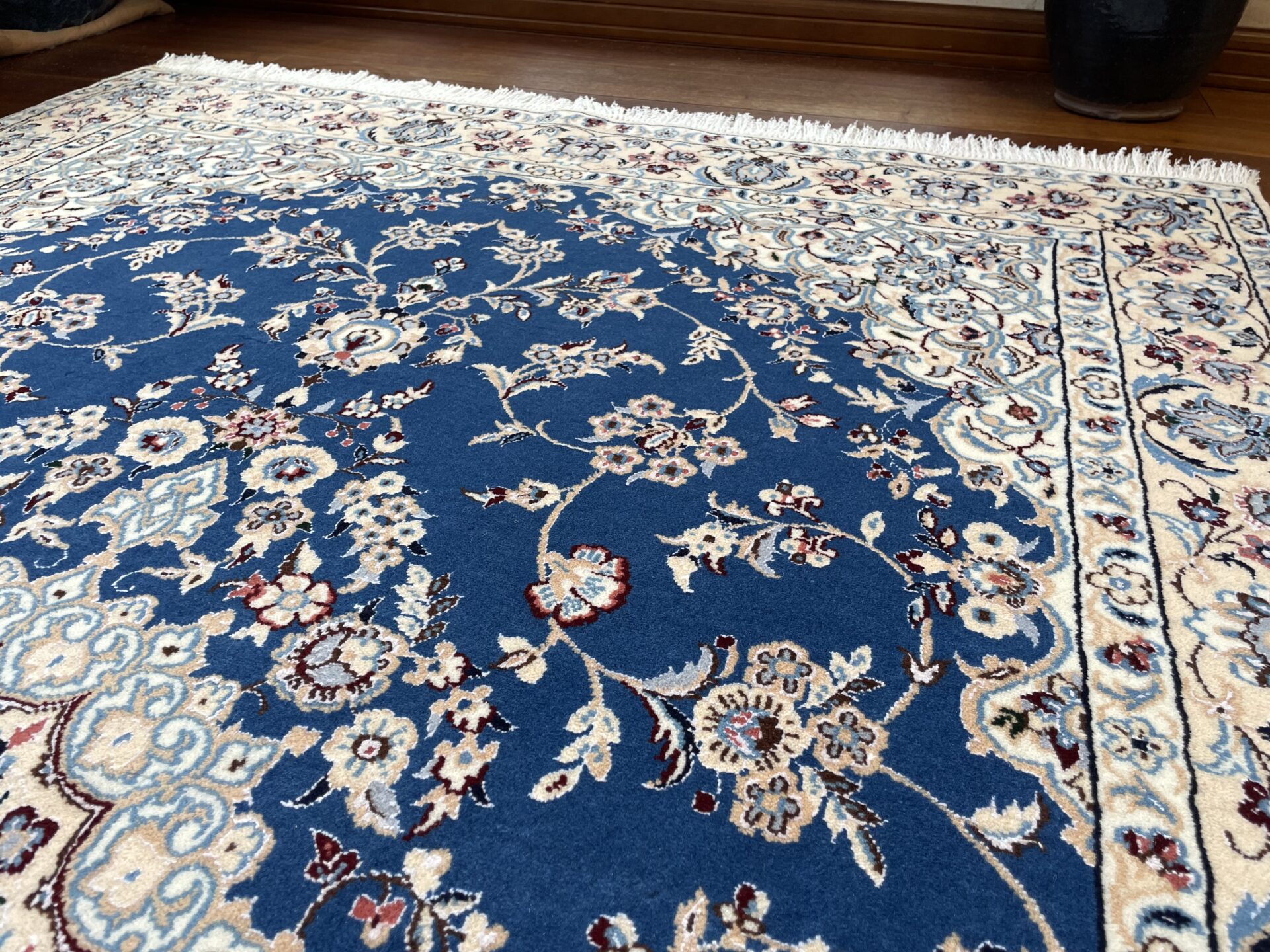 ペルシャ絨毯の五大産地でもある【ナイン】は、ベージュ系のベースカラーでお部屋に合わせやすいと人気の高い産地です。たて糸に綿を使用しているため、ギャッベよりも織り目が細かく、密度も高いため、ゴミが中まで入り込まないのも良い点。日々のメンテナンスは、掃除機だけで十分です。中央のブルーとベージュのコントラストがユニークな作品ですね。