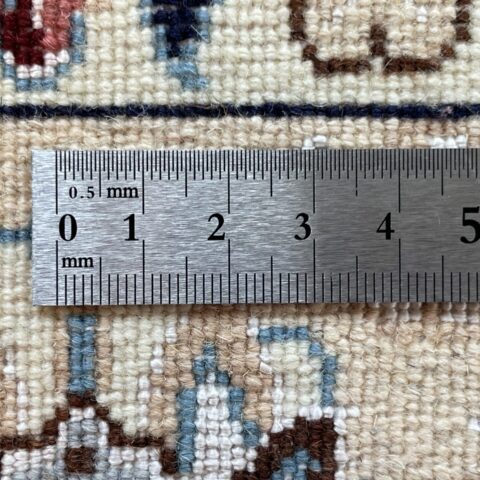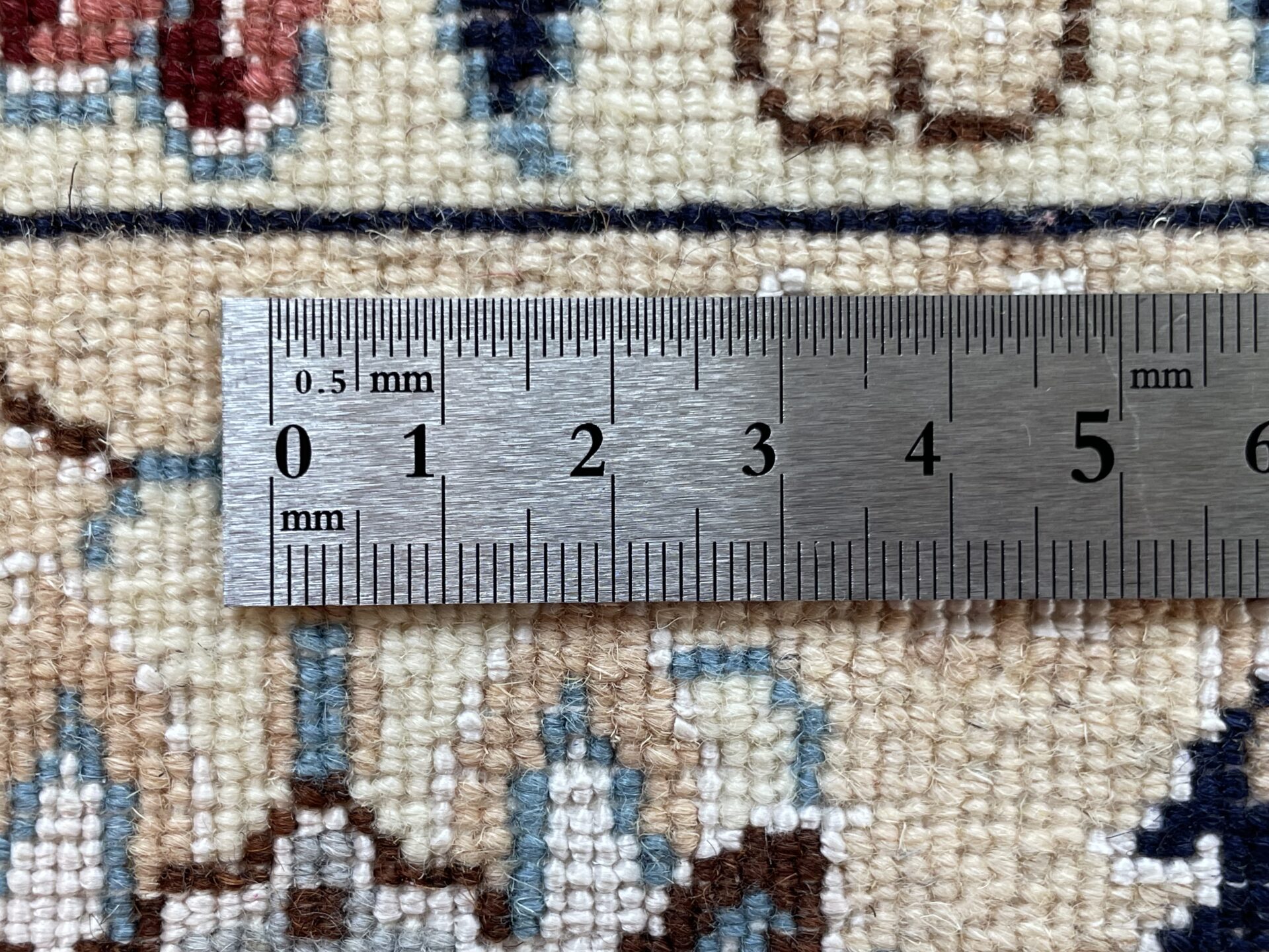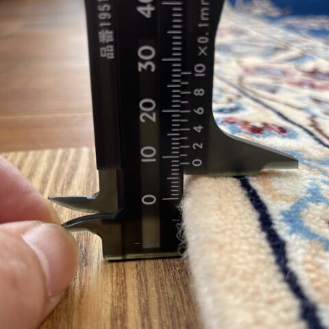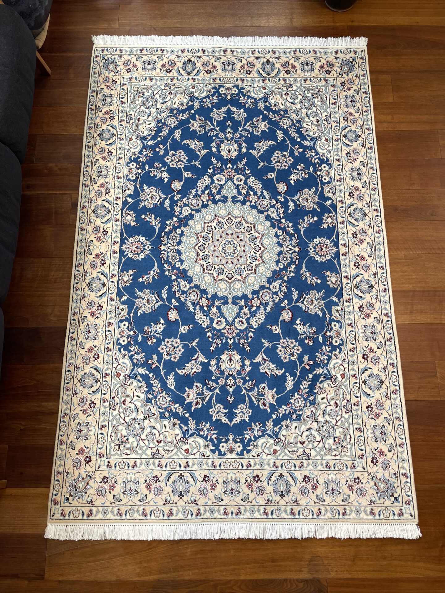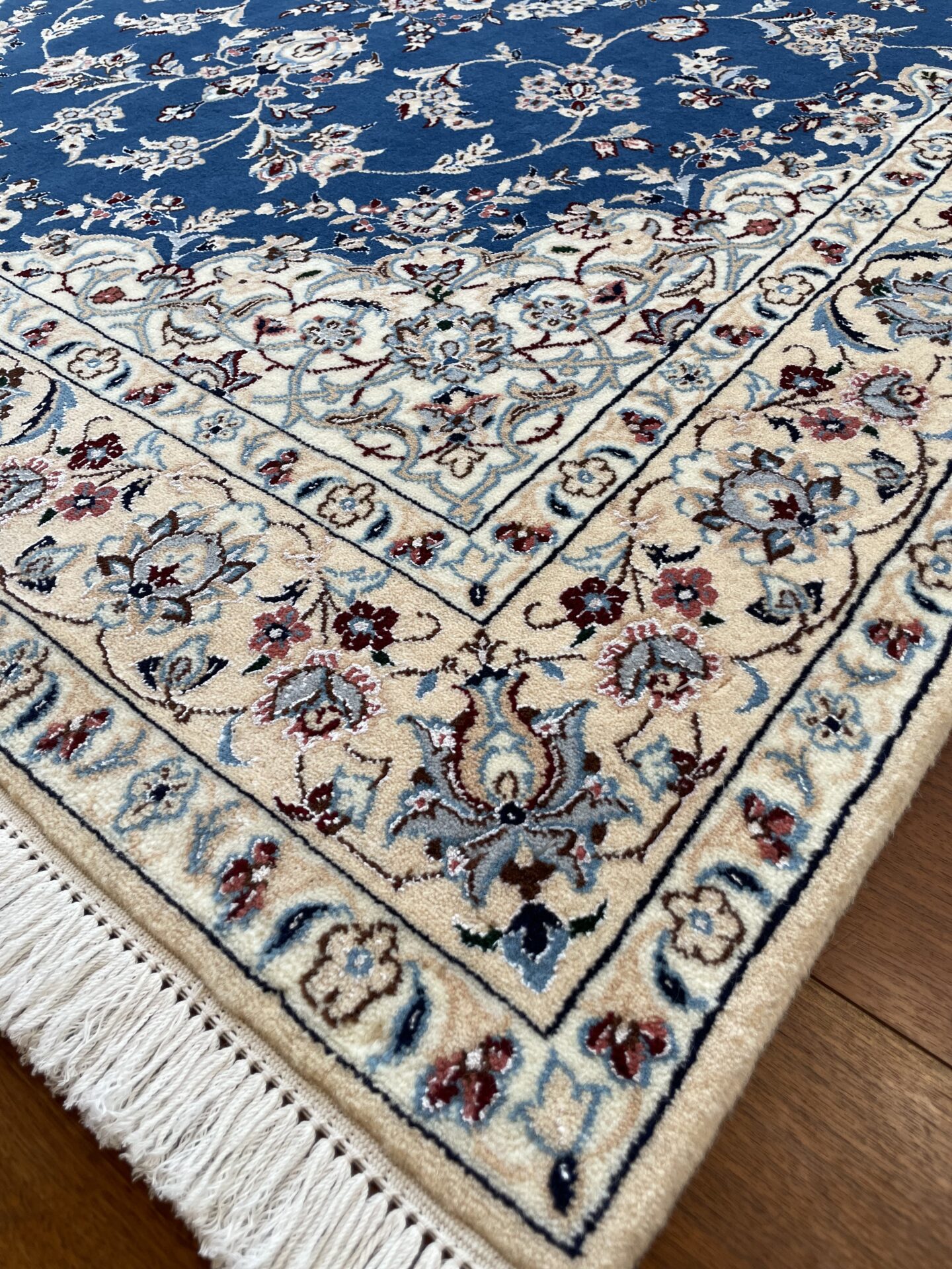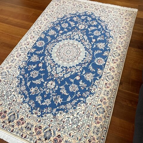 ペルシャ絨毯の五大産地でもある【ナイン】は、ベージュ系のベースカラーでお部屋に合わせやすいと人気の高い産地です。たて糸に綿を使用しているため、ギャッベよりも織り目が細かく、密度も高いため、ゴミが中まで入り込まないのも良い点。日々のメンテナンスは、掃除機だけで十分です。中央のブルーとベージュのコントラストがユニークな作品ですね。