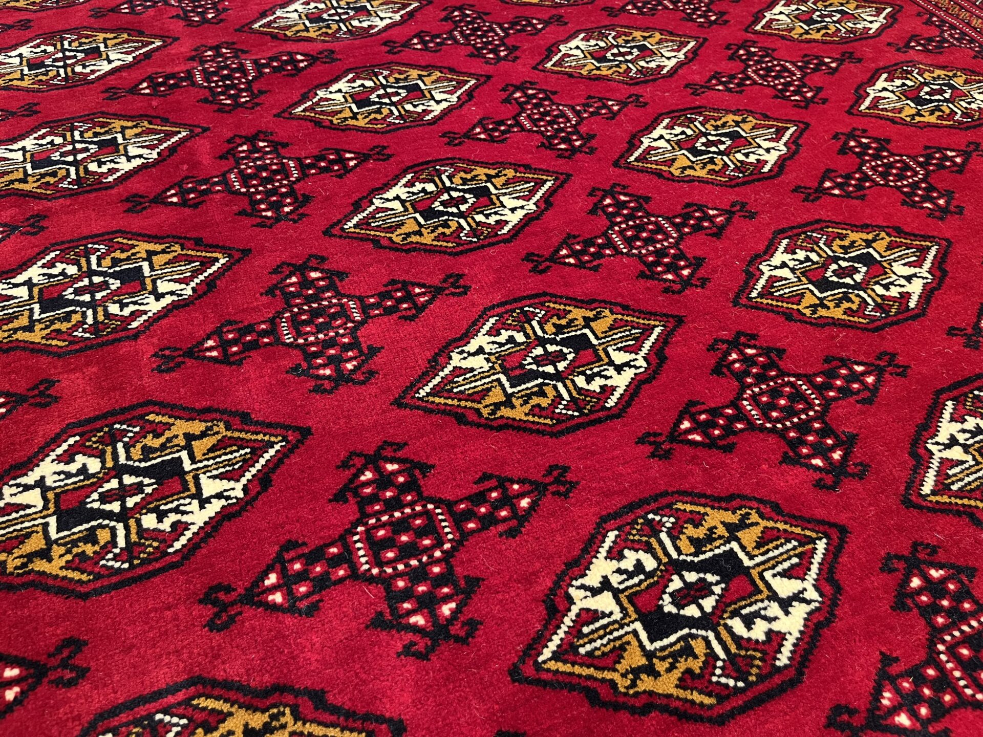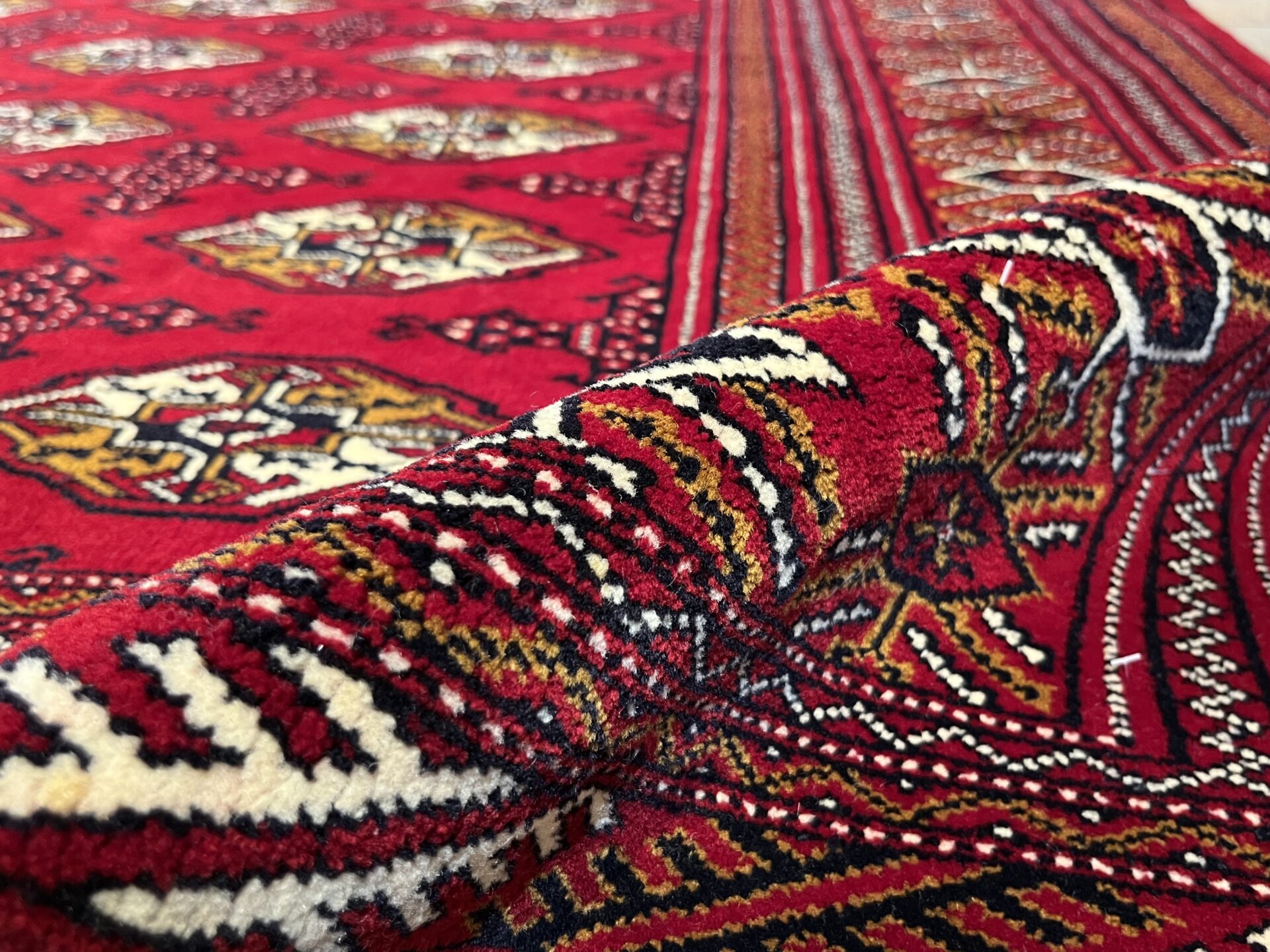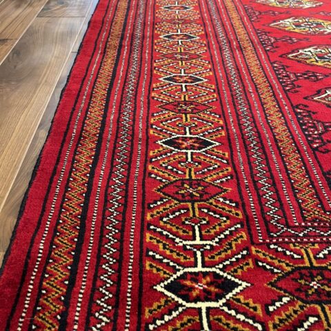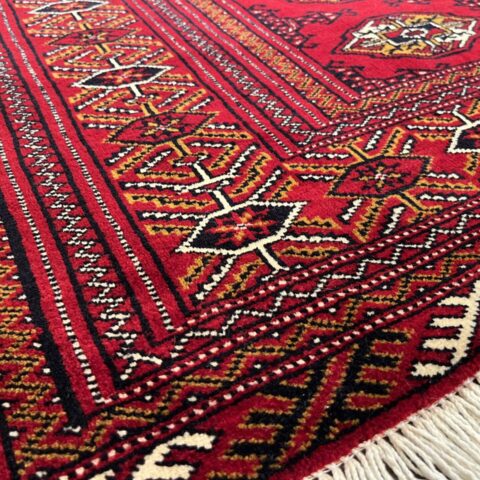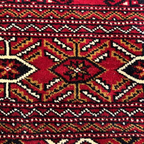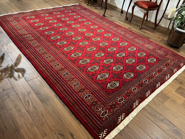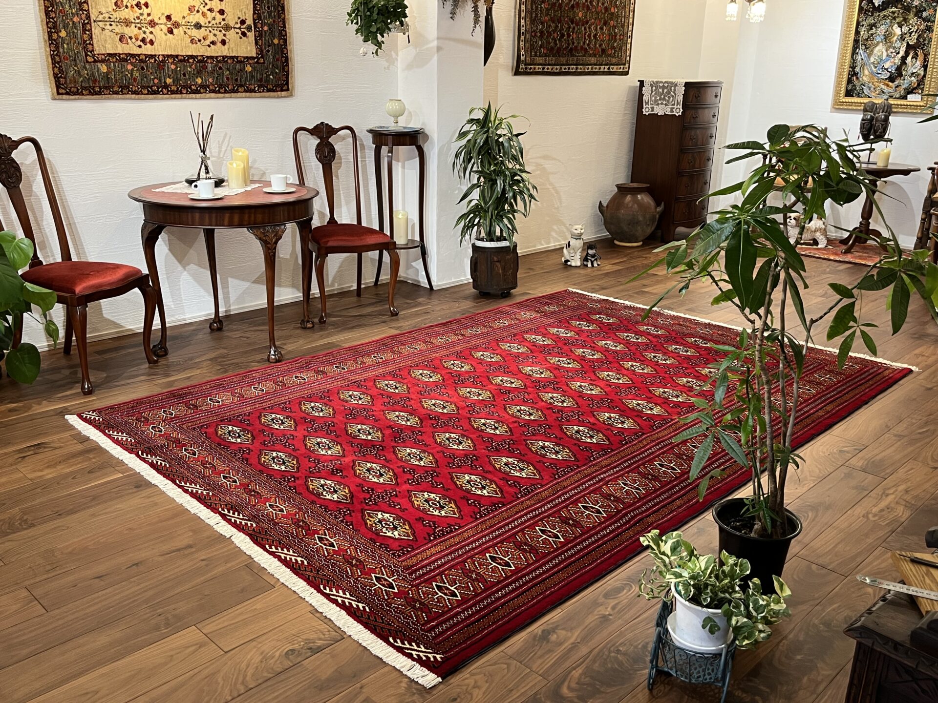 トルクメン絨毯は、イラン近郊のウズベキスタン、トルクメニスタン、アフガニスタンなどの異なる地域で織られたもので、中央に並ぶ【ギュル】と呼ばれる文様を反復してデザインするのが特徴です。ギュルは、地域によって意味が異なり「花」や「魔除け」を意味することが多いようです(^.^)経年変化で渋く深みのある赤色に成長しておりますので、お部屋にも意外と馴染みやすいんですよ。和の空間でも、洋室にもおすすめできる一枚です。
