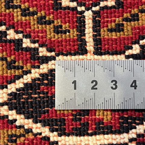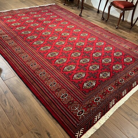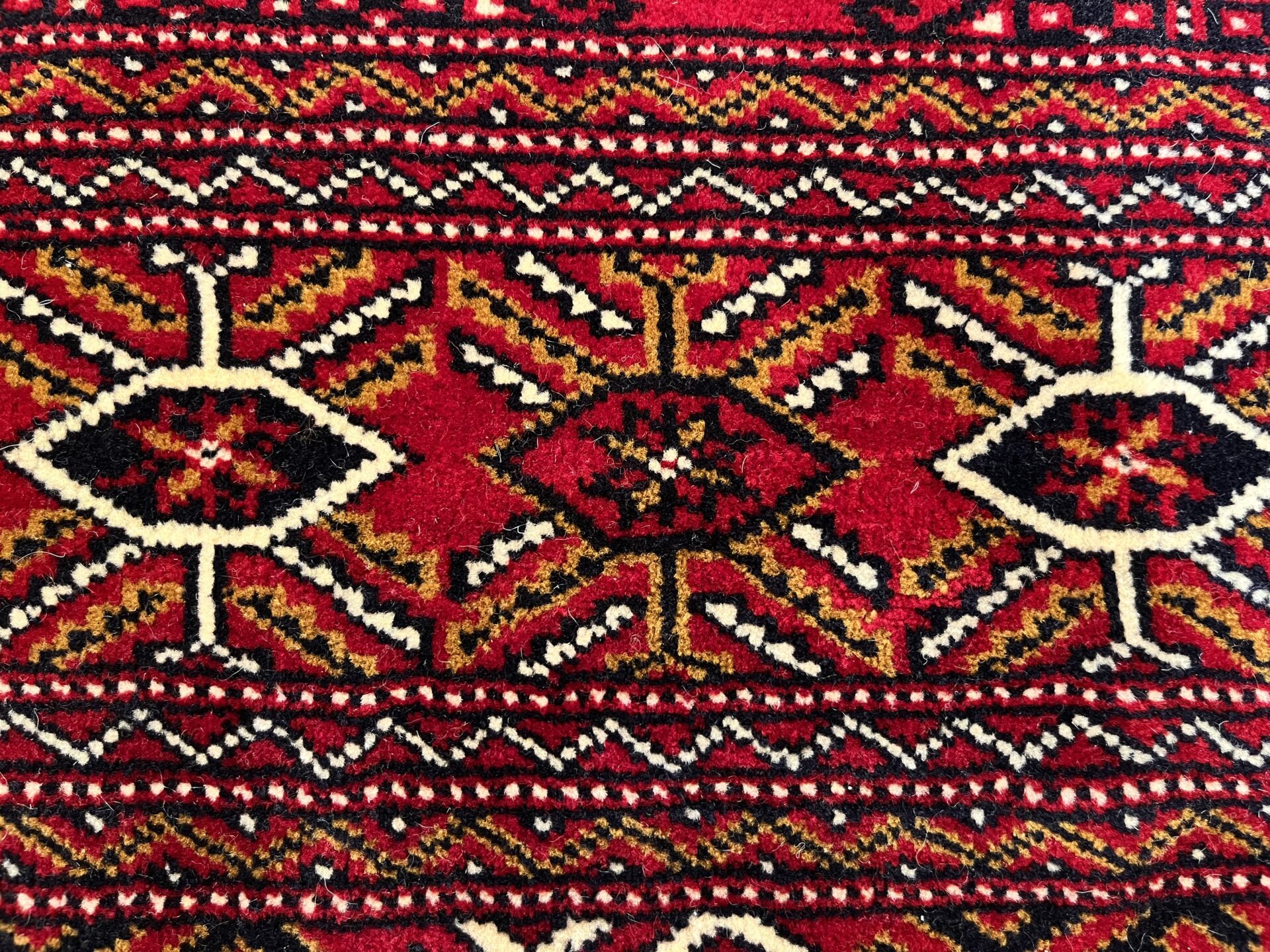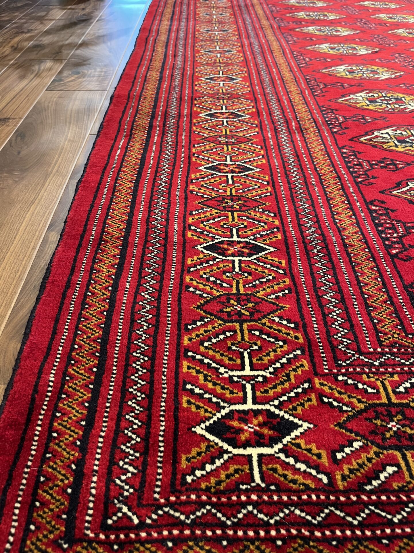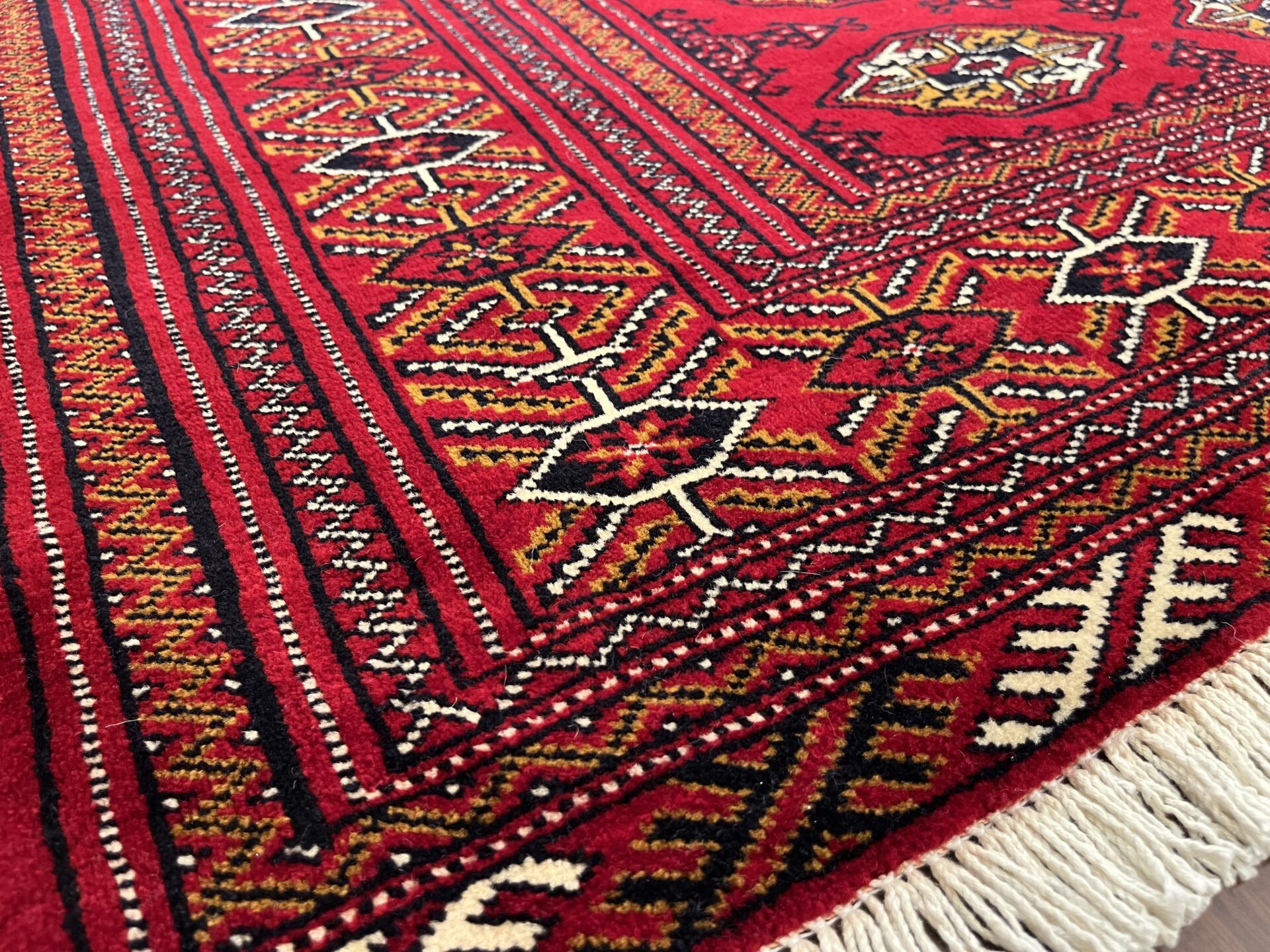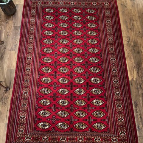 トルクメン絨毯は、イラン近郊のウズベキスタン、トルクメニスタン、アフガニスタンなどの異なる地域で織られたもので、中央に並ぶ【ギュル】と呼ばれる文様を反復してデザインするのが特徴です。ギュルは、地域によって意味が異なり「花」や「魔除け」を意味することが多いようです(^.^)経年変化で渋く深みのある赤色に成長しておりますので、お部屋にも意外と馴染みやすいんですよ。和の空間でも、洋室にもおすすめできる一枚です。