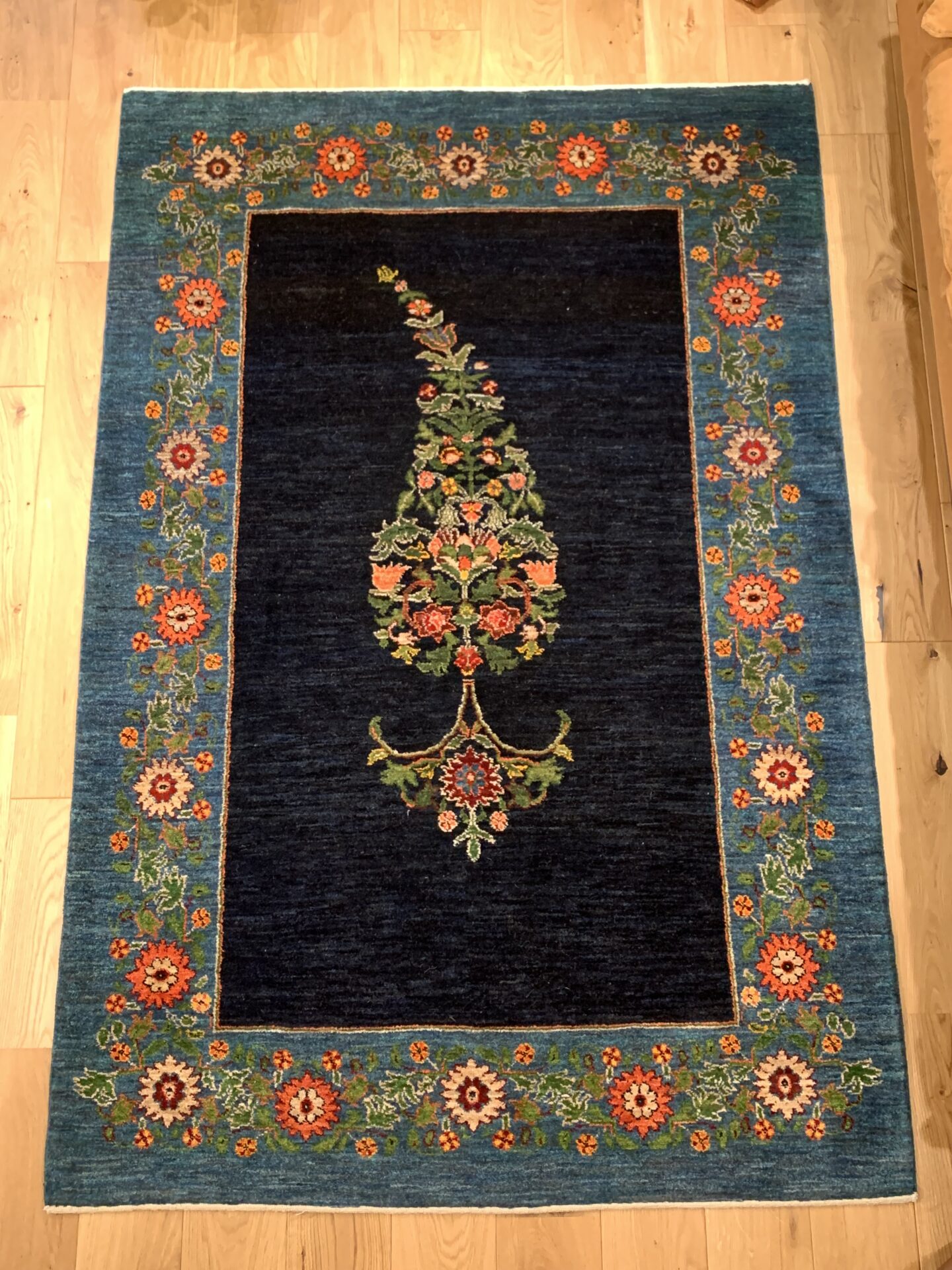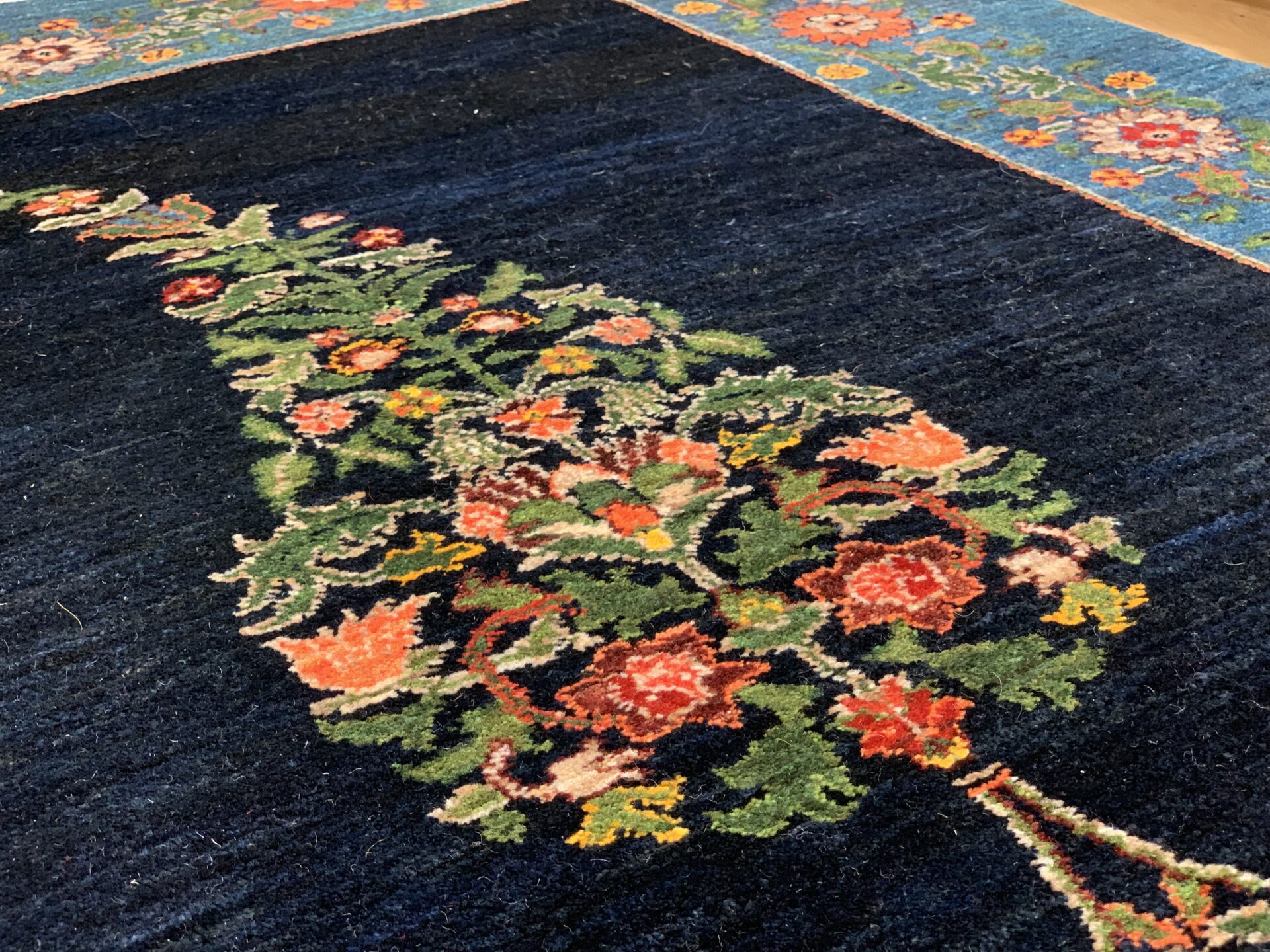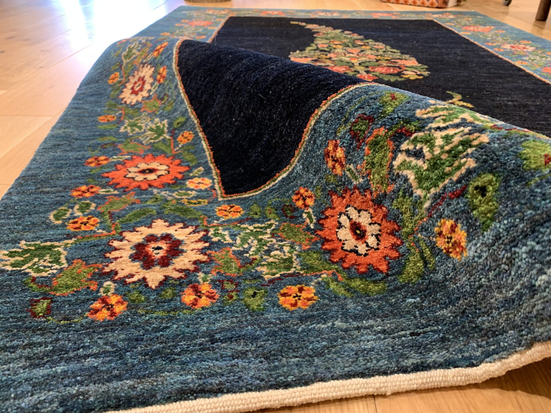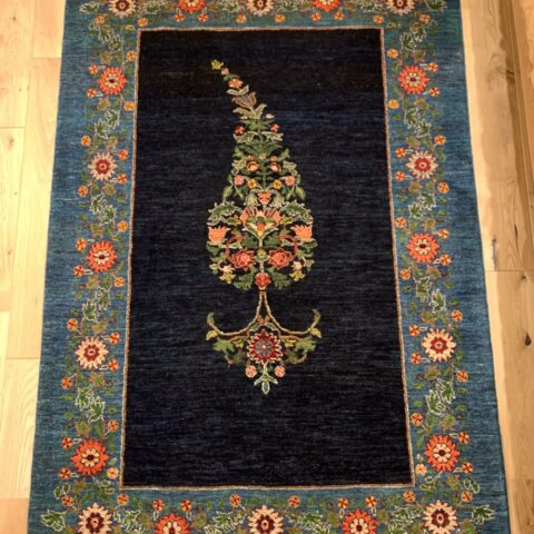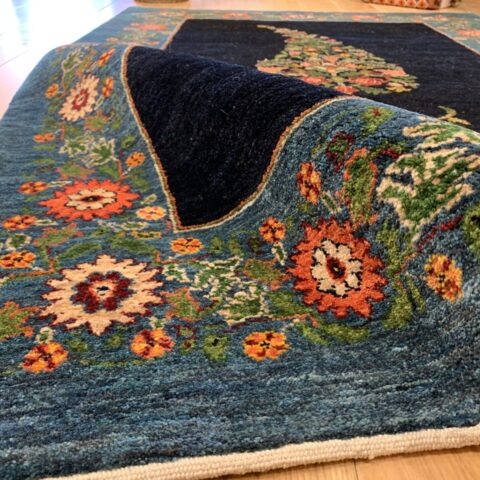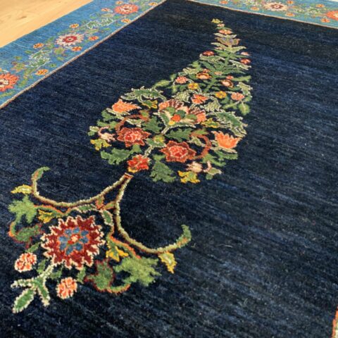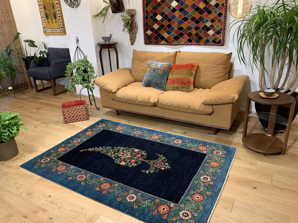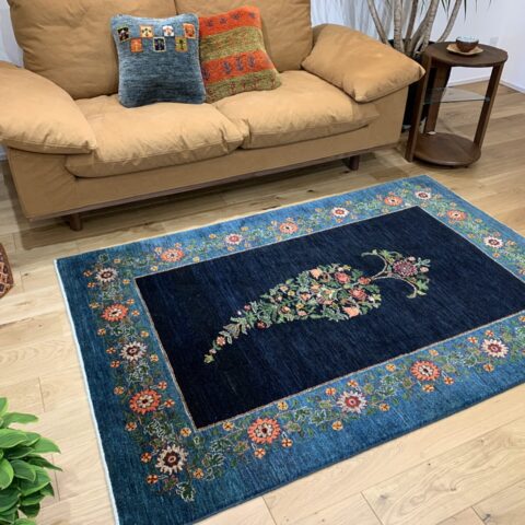 中央のペイズリー文様が、よく見るとすべて植物が絡み合ってできている…まさにアートな逸品。ゾランヴァリ・ギャッベの最高ランク、細い糸を使ったルリバフギャッベだからこそできる技ですね。ちなみに、ペルシャ絨毯用語でペイズリーは【ボテ文様】と呼ばれています。糸杉が風になびいている様子や、ゾロアスター教(拝火教)の火のゆらぎを表したという説があったりもするんです。落ち着きのある藍染ブルーで、お部屋をクラシカルな雰囲気に。
