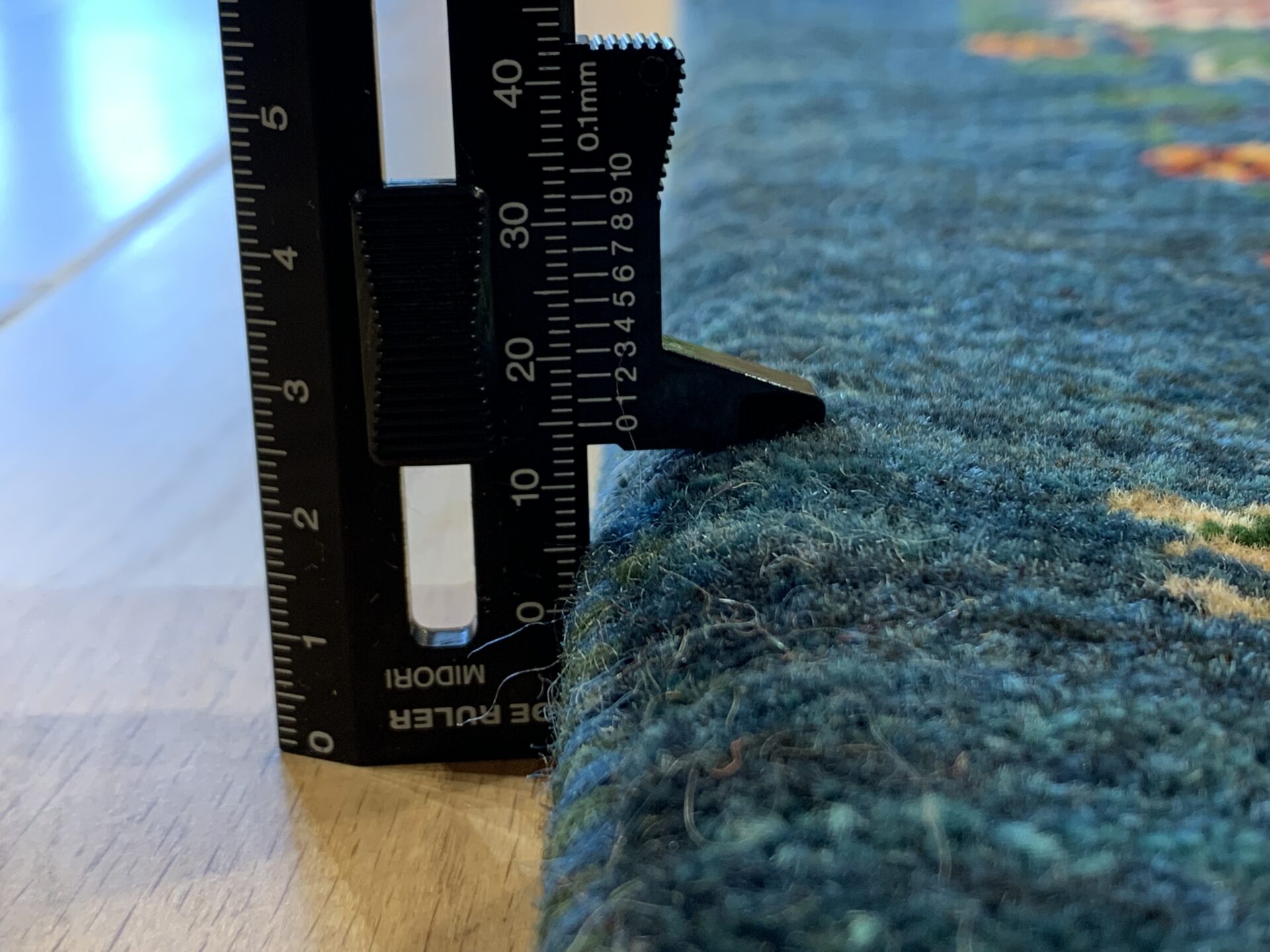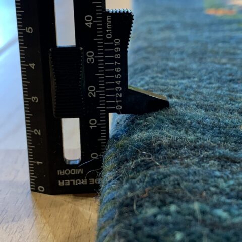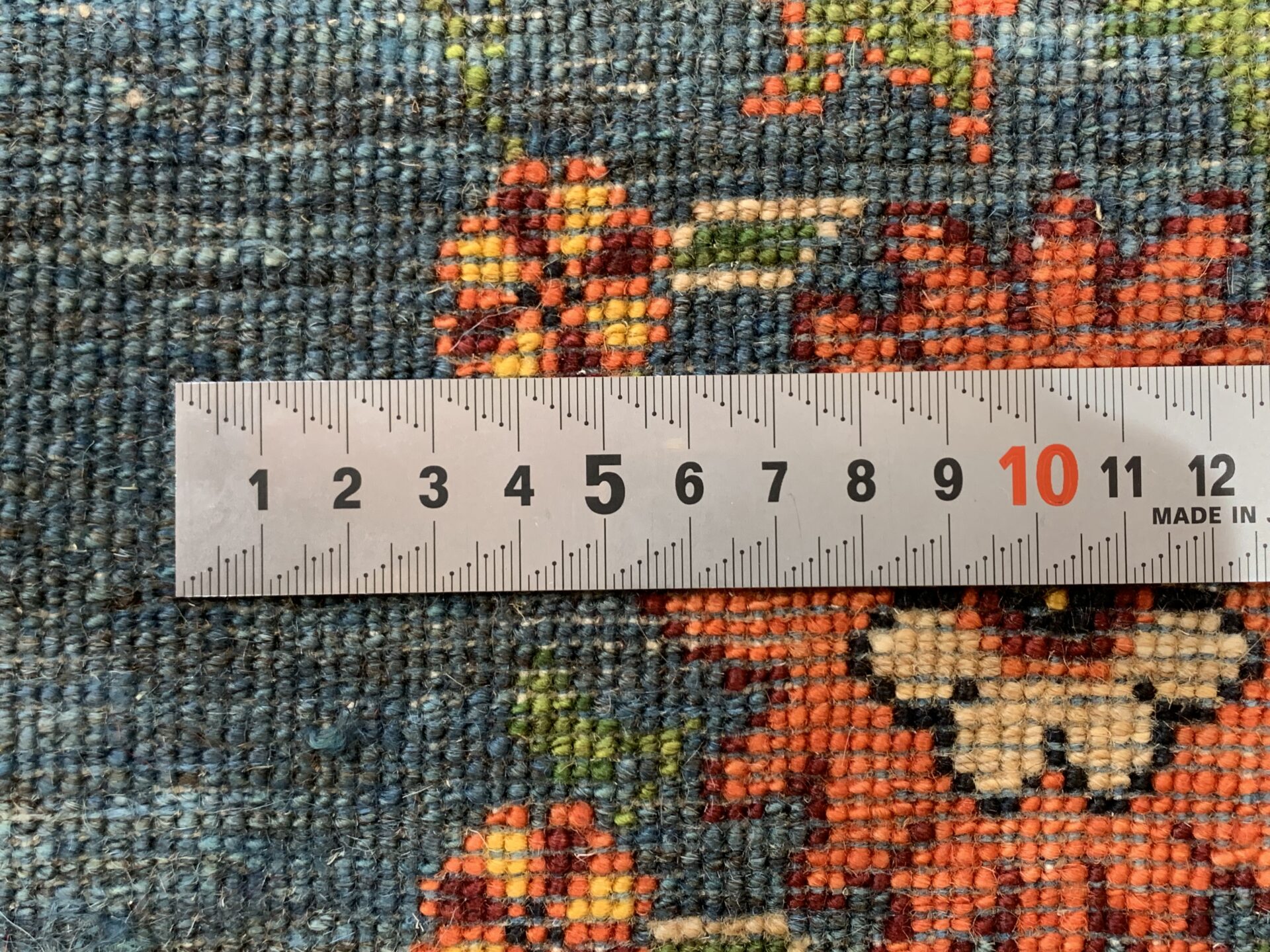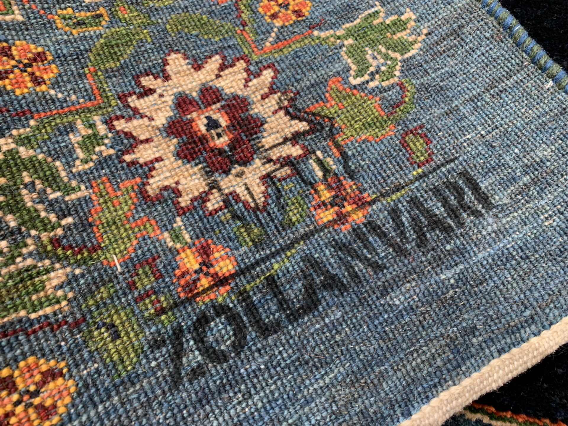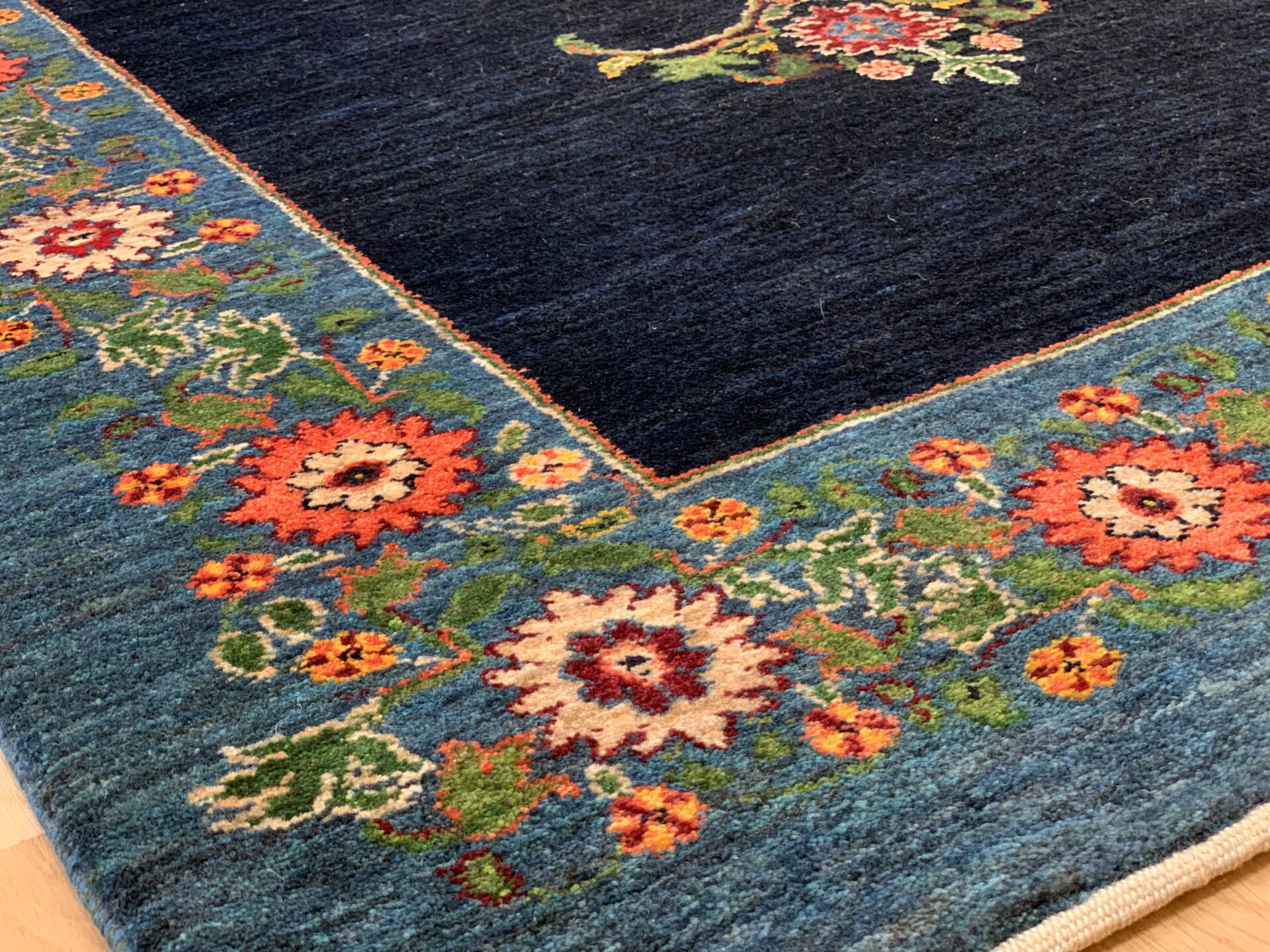 中央のペイズリー文様が、よく見るとすべて植物が絡み合ってできている…まさにアートな逸品。ゾランヴァリ・ギャッベの最高ランク、細い糸を使ったルリバフギャッベだからこそできる技ですね。ちなみに、ペルシャ絨毯用語でペイズリーは【ボテ文様】と呼ばれています。糸杉が風になびいている様子や、ゾロアスター教(拝火教)の火のゆらぎを表したという説があったりもするんです。落ち着きのある藍染ブルーで、お部屋をクラシカルな雰囲気に。
