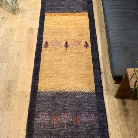 紫と黄色のカラーコンビネーションがユニークなこちらのアマレギャッベ。コントラストが効いていて、ぱっと目を惹くデザインですね。中央には【健康・長寿】を象徴する糸杉と生命の木が仲良く並びんで、さりげない可愛さがたまらない1枚です♪