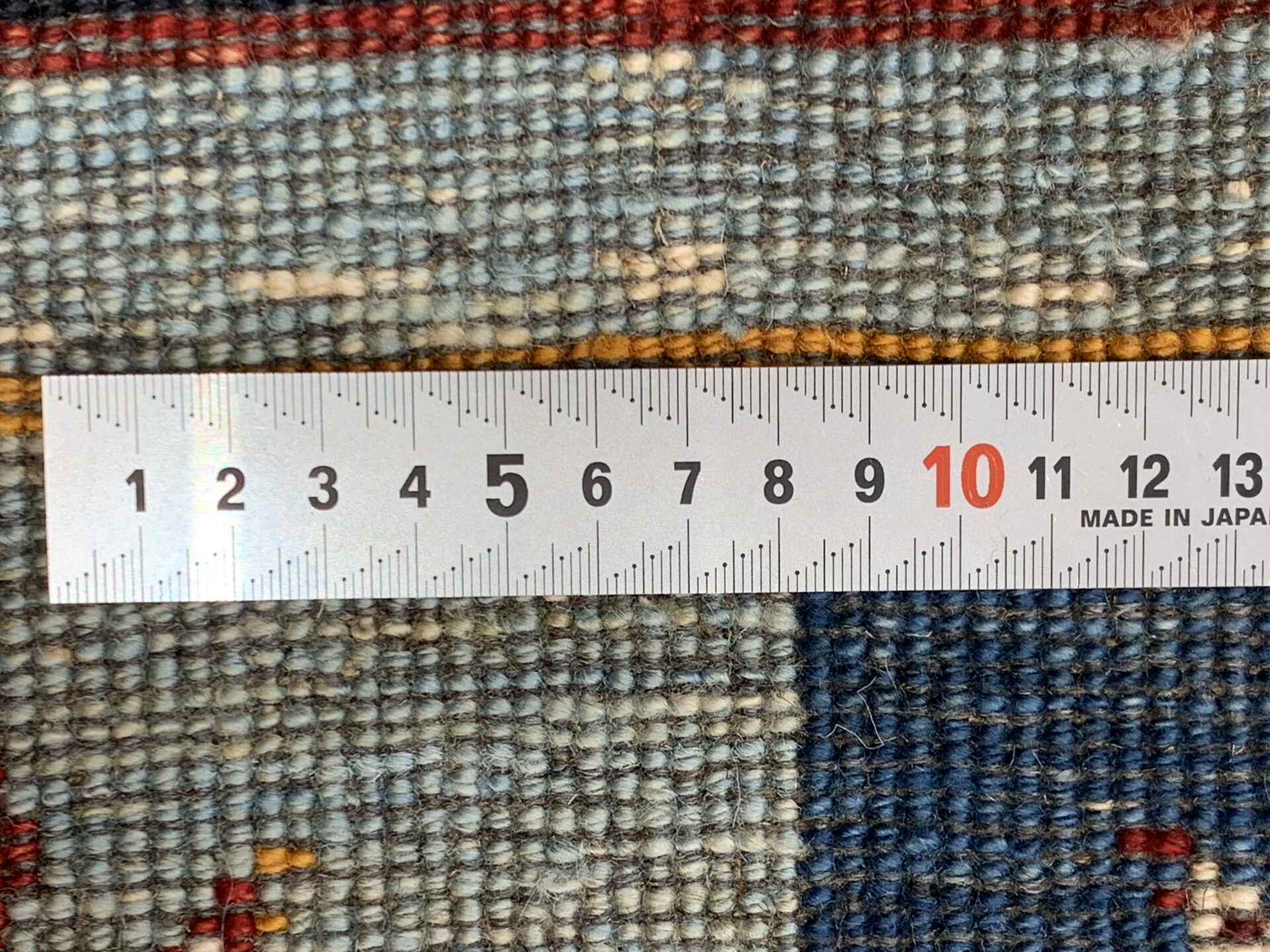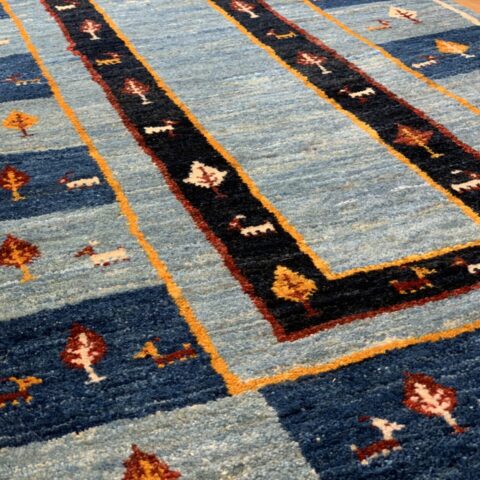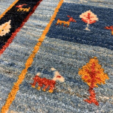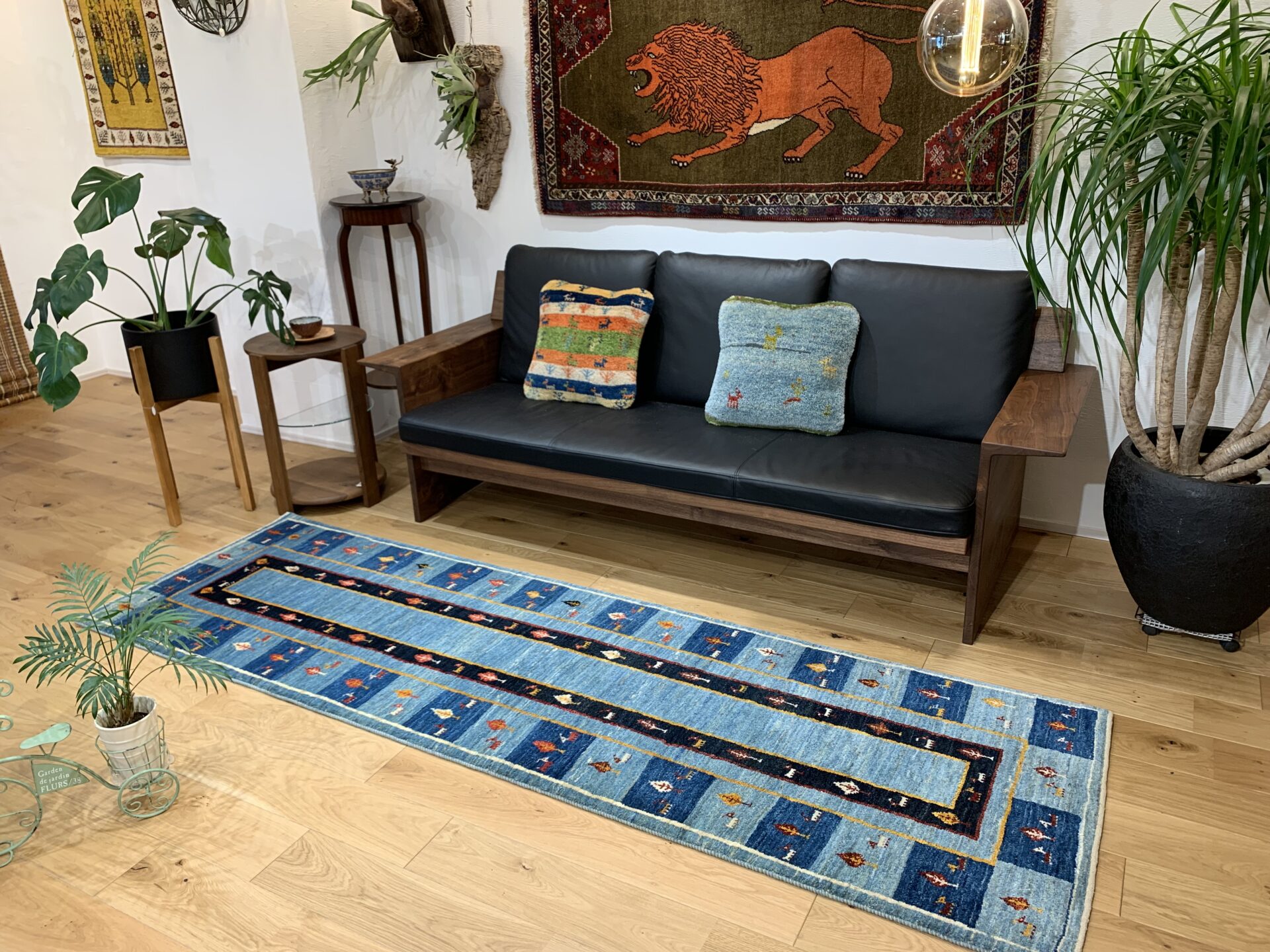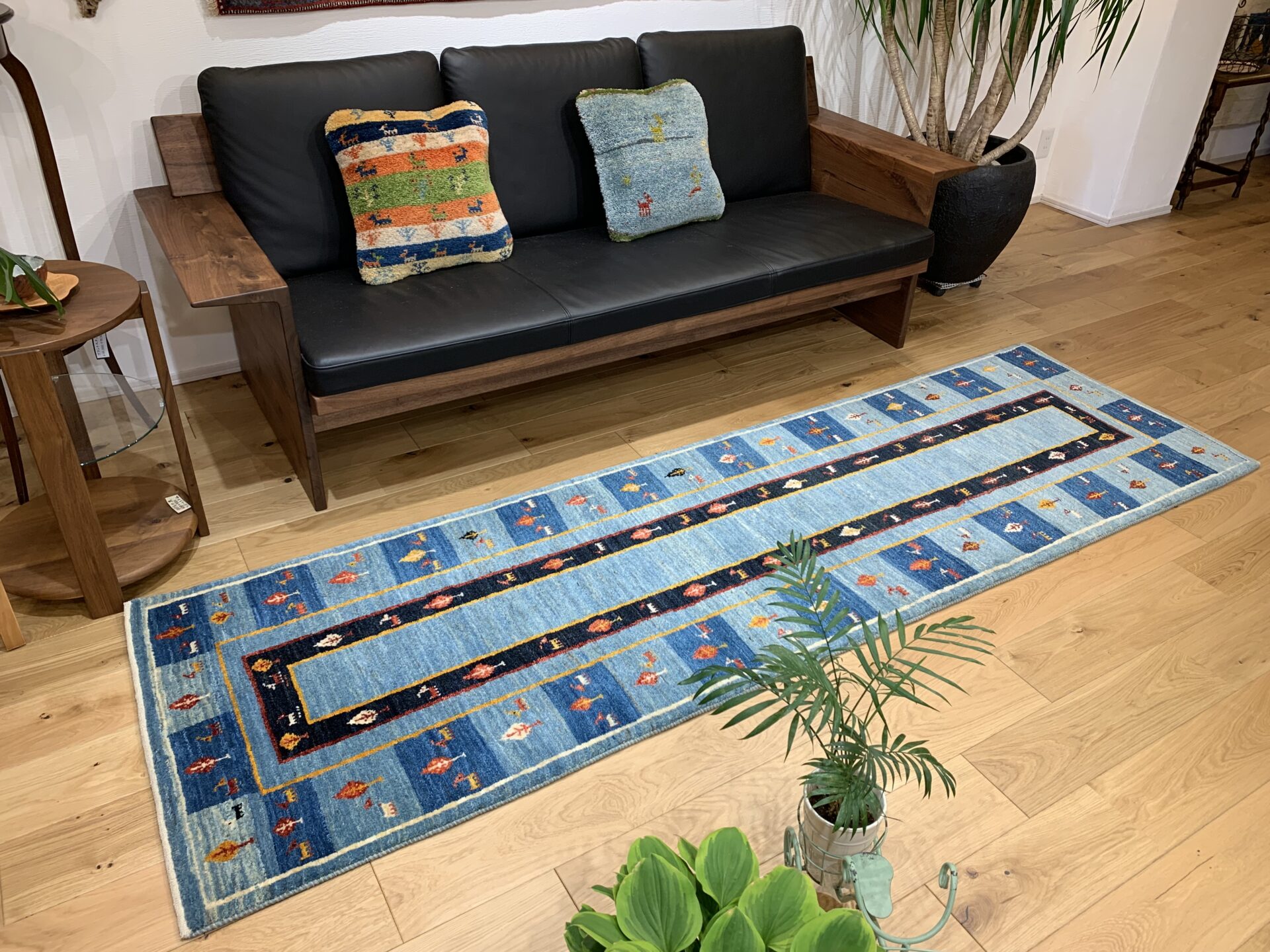 藍染ブルーで落ち着きのある色味ですが、よく見てみるとデザインはとってもキュート!羊さんの頭と体も違う色が使われていたり、細かな部分も織り子さんのこだわりを読み取るのがギャッベのおもしろさでもあります。暖色がアクセントになっているため、寒々しい印象にならず1年中使いやすい作品になっていますよ。