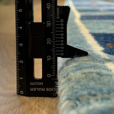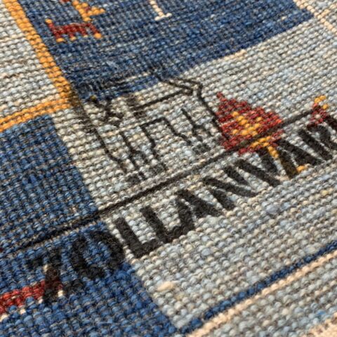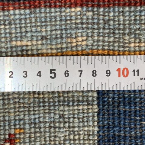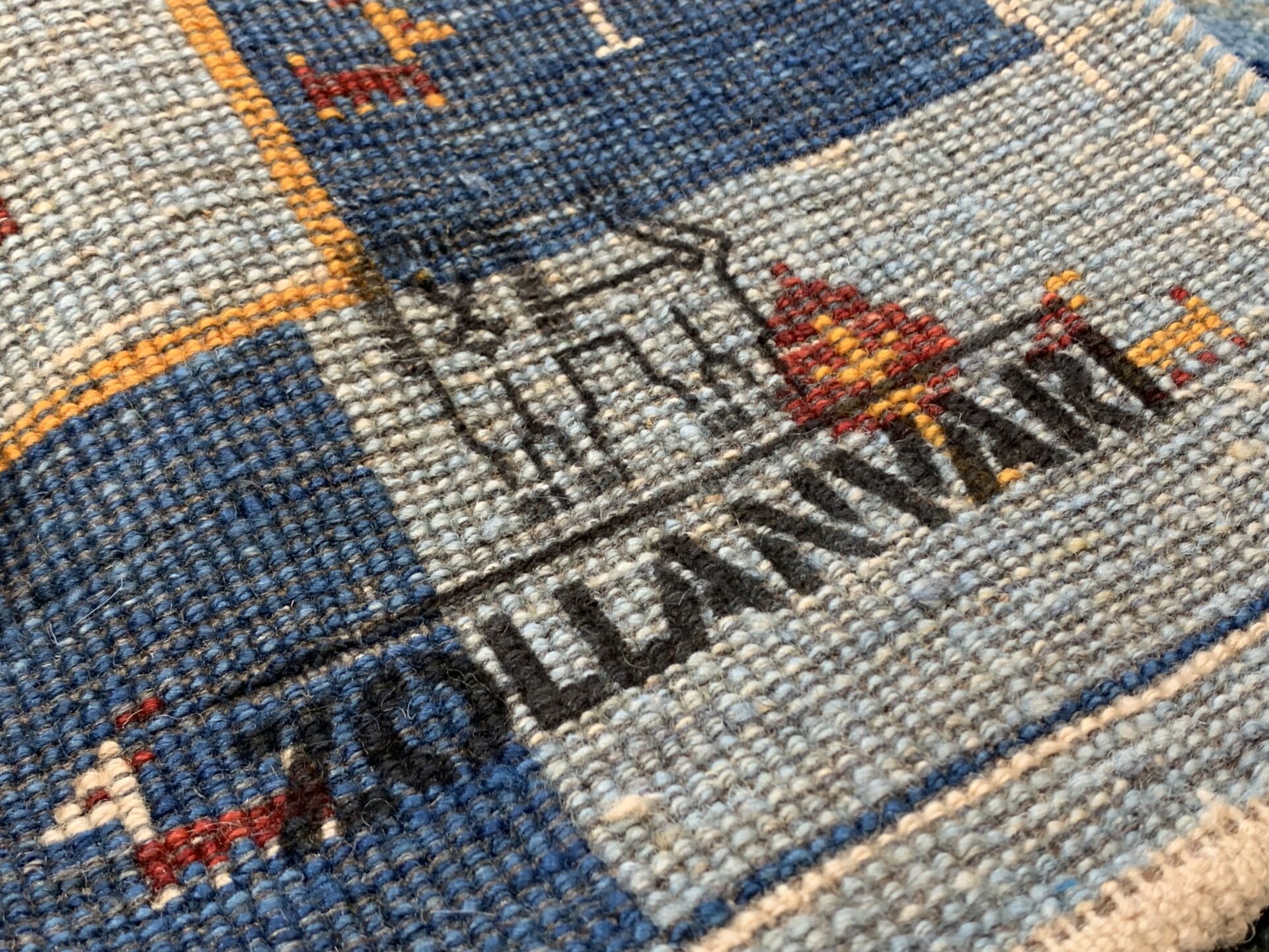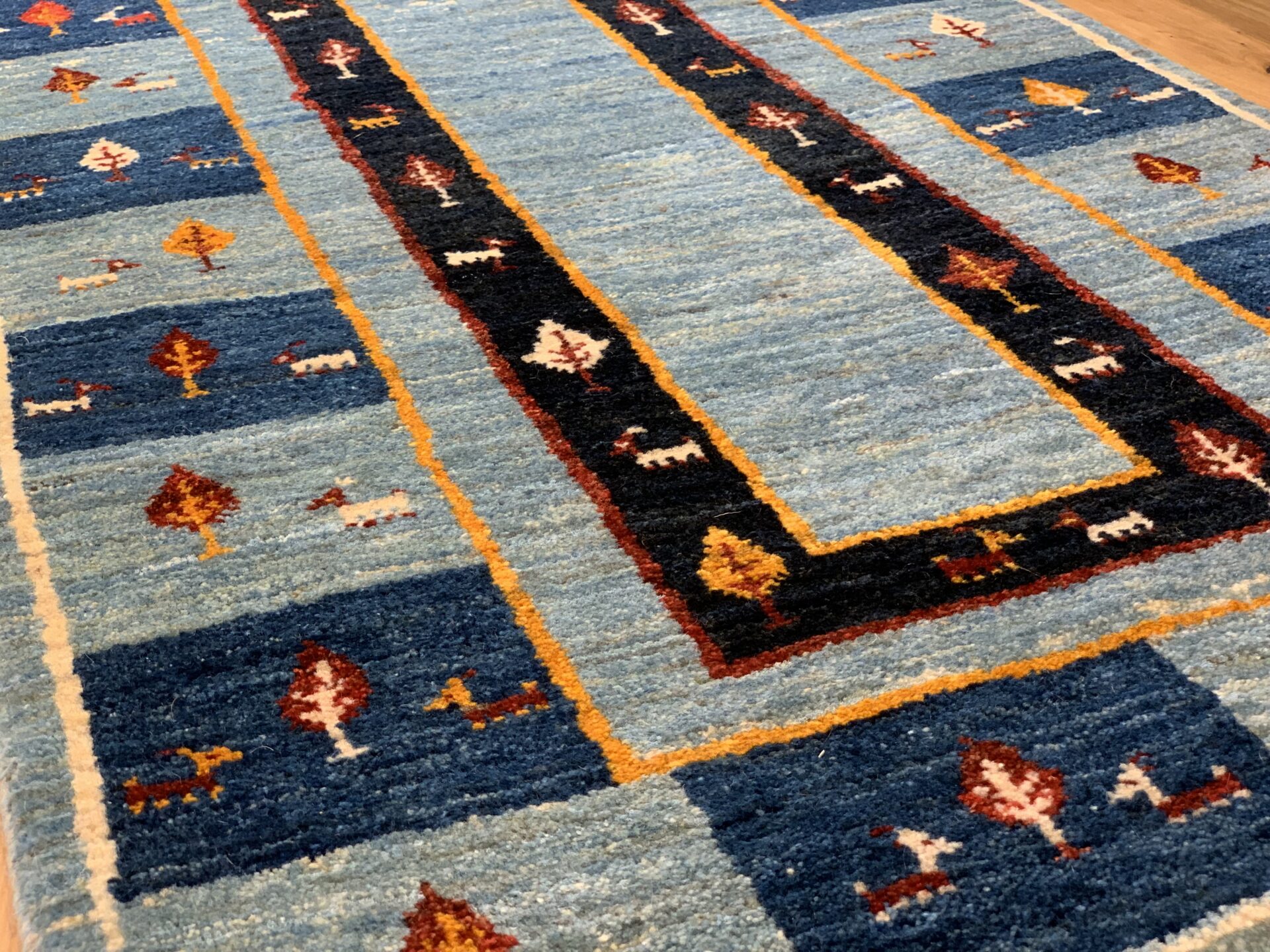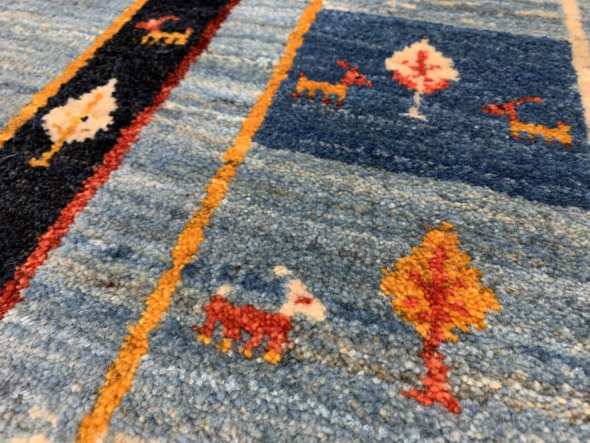 藍染ブルーで落ち着きのある色味ですが、よく見てみるとデザインはとってもキュート!羊さんの頭と体も違う色が使われていたり、細かな部分も織り子さんのこだわりを読み取るのがギャッベのおもしろさでもあります。暖色がアクセントになっているため、寒々しい印象にならず1年中使いやすい作品になっていますよ。