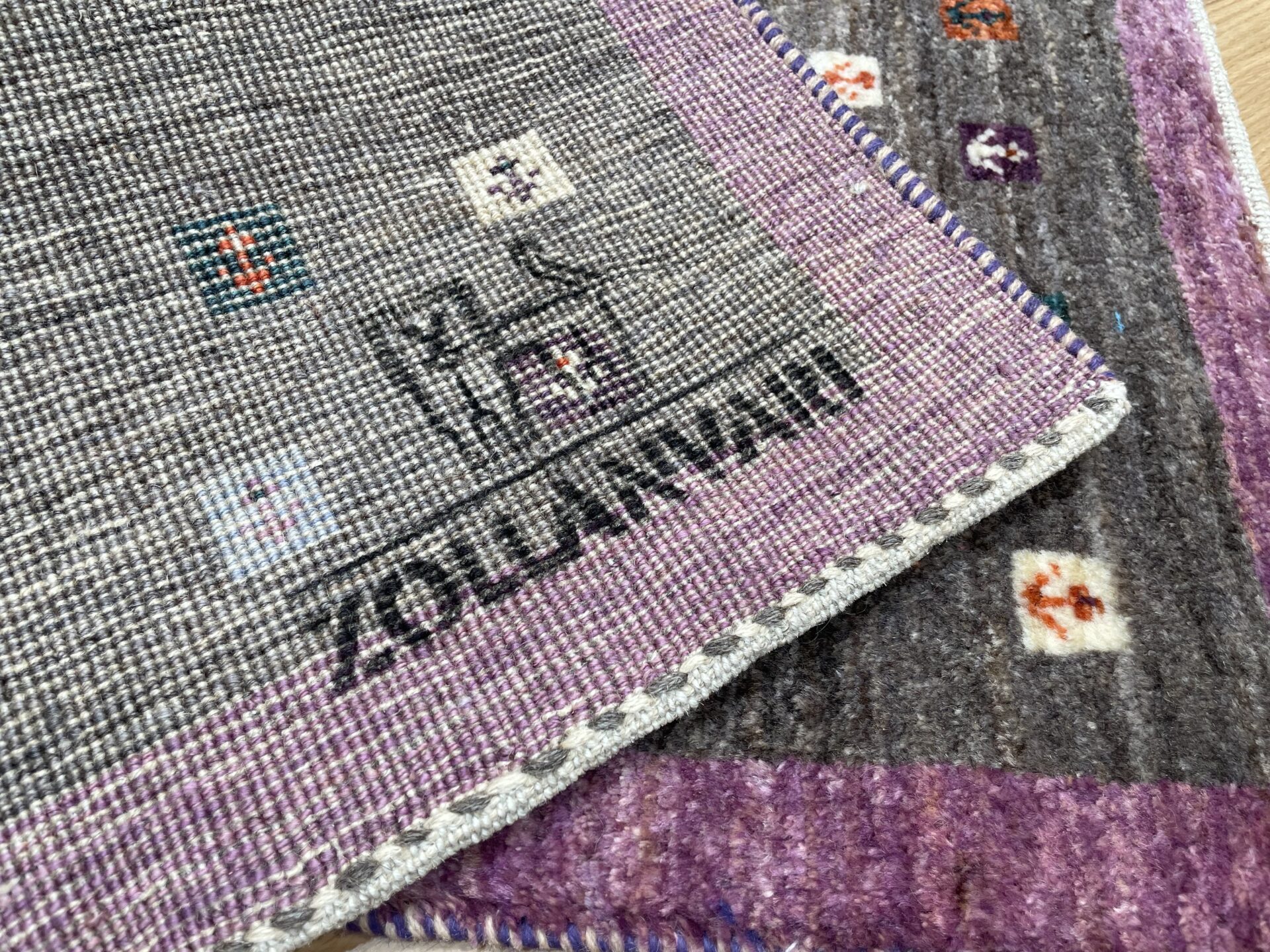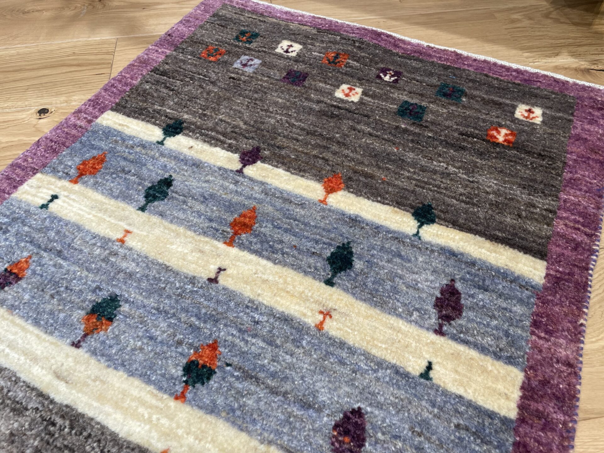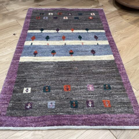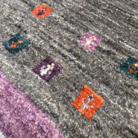 珍しいパープルと、落ち着いたグレーの組み合わせがお洒落なアマレギャッベ。お部屋に合わせやすい色調ですが、お部屋のちょっとしたアクセントになりますよ。こどもがクレヨンで描いたような小さな糸杉がとってもキュートな1枚です。