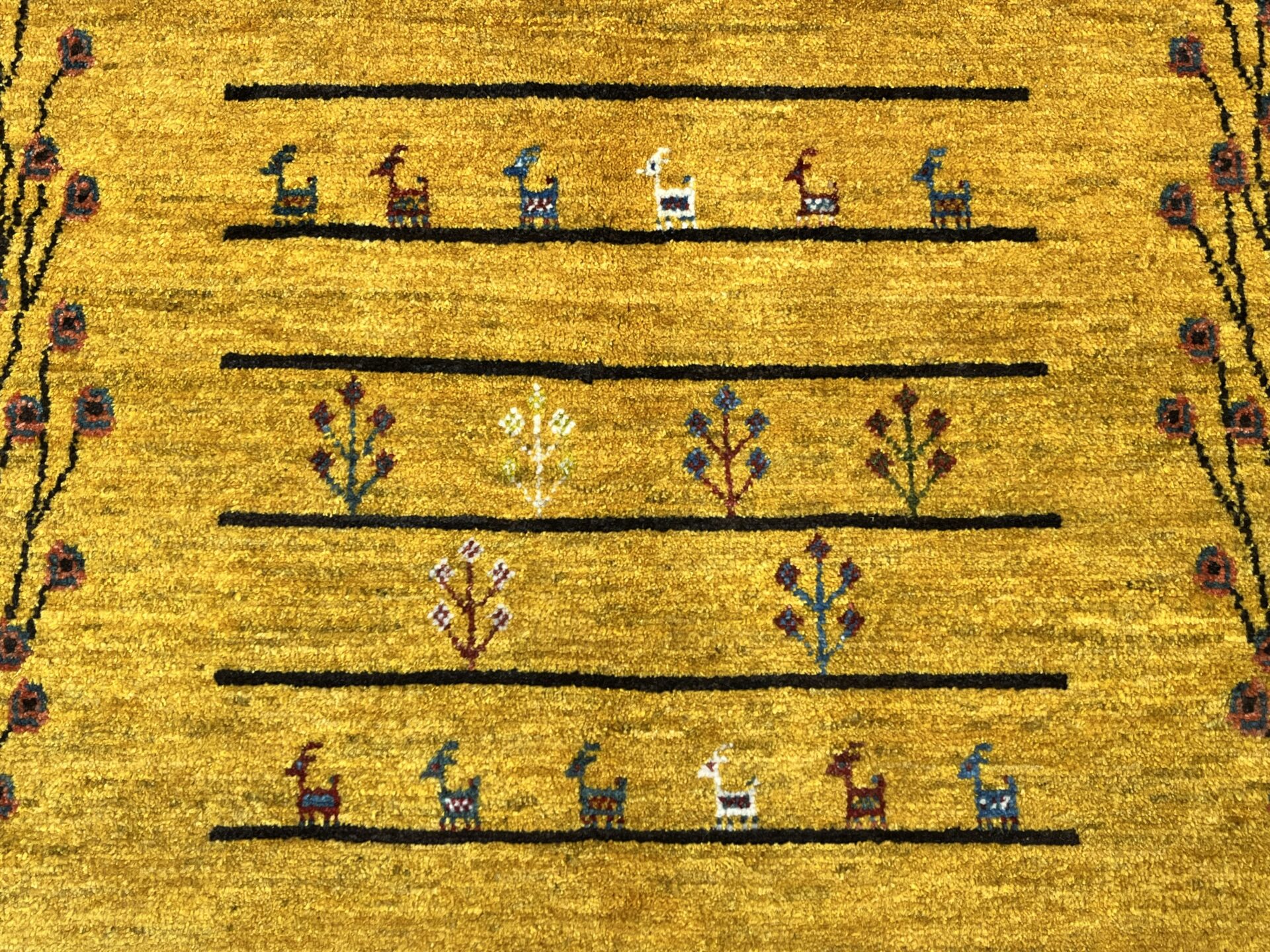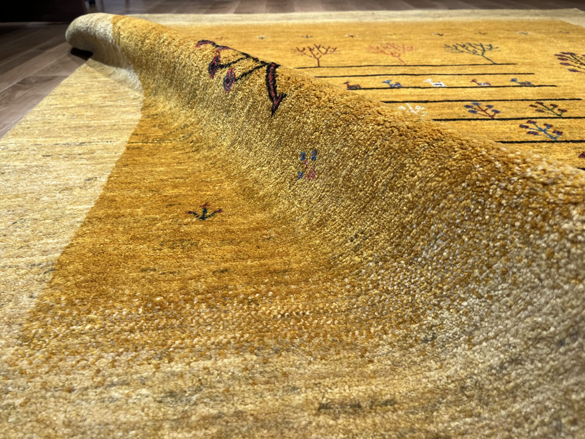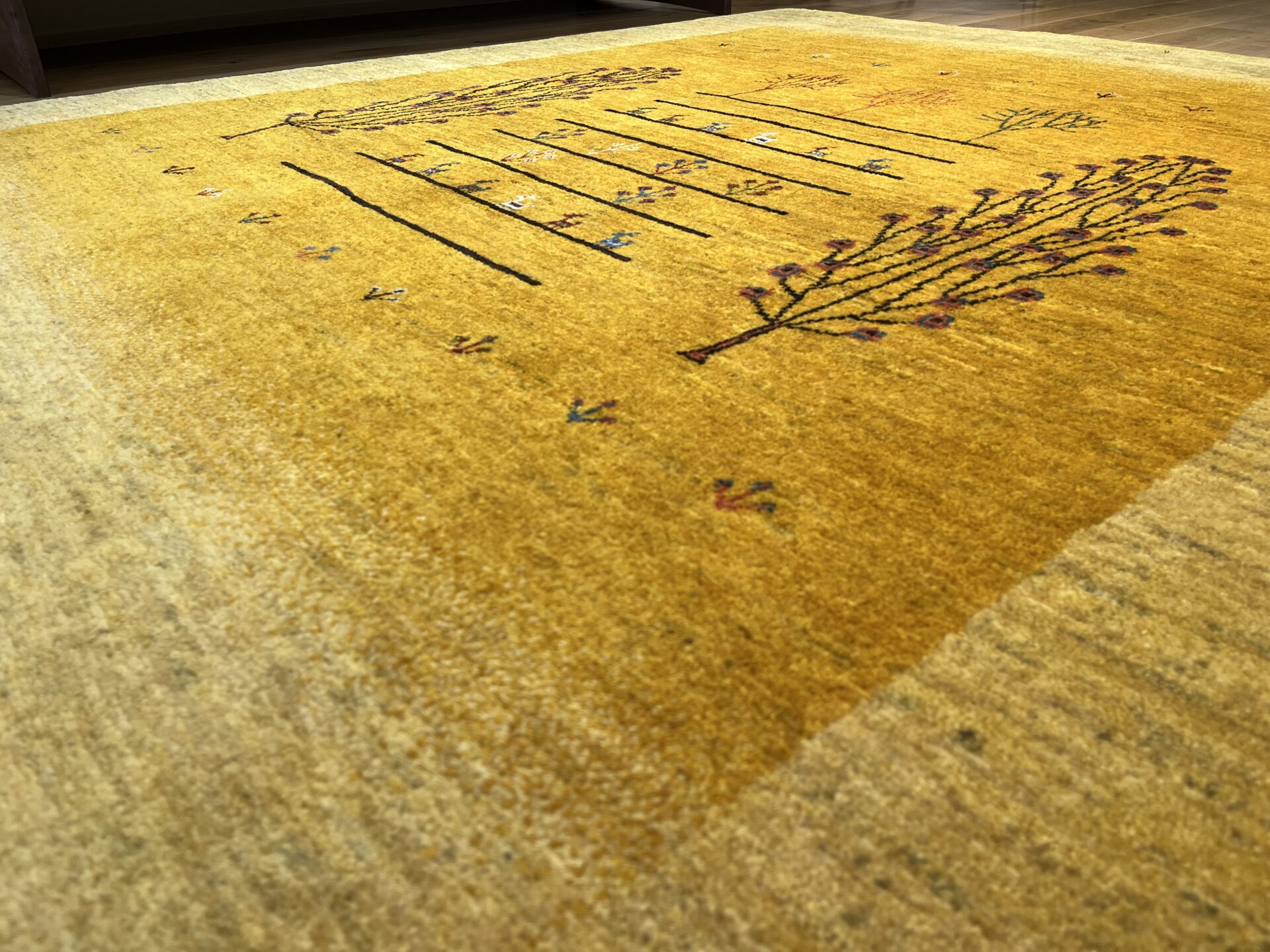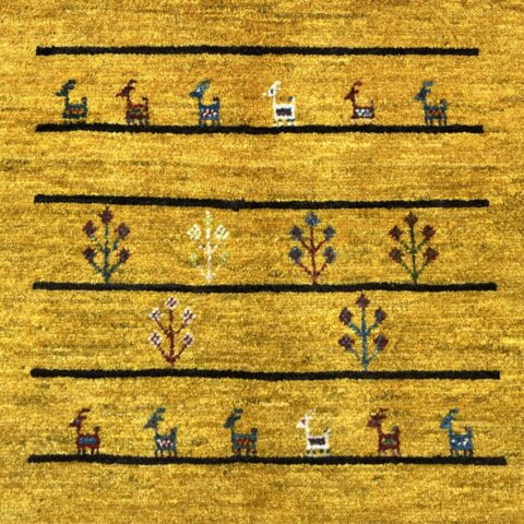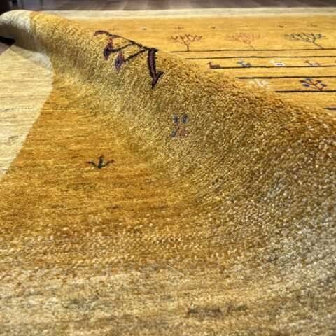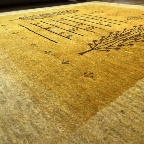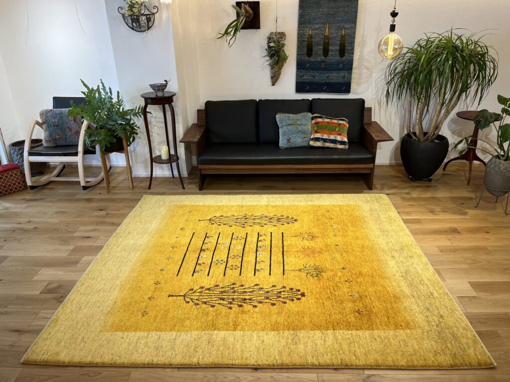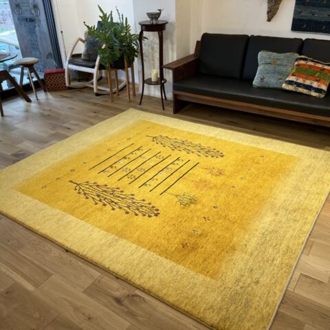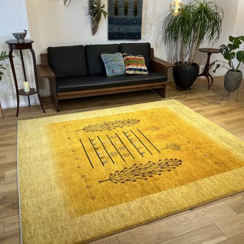 イランの大自然の中で織られるギャッベには、独特な素朴さと力強さがありますよね。黄色は「ザクロの皮」などを使い染色されており、自然素材100%のオーガニック絨毯。赤ちゃんや、小さいお子様がいるご家庭でも安心してご使用いただけます。