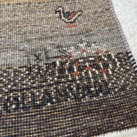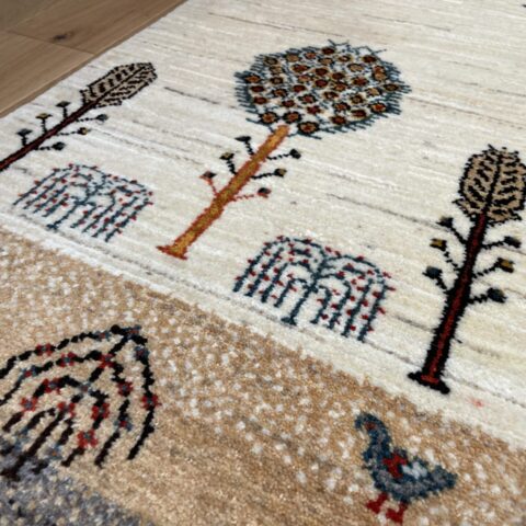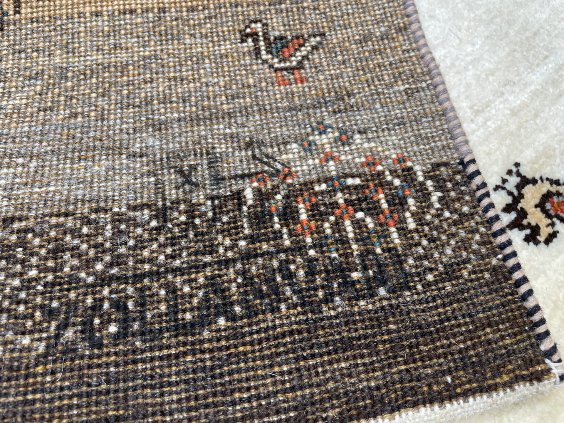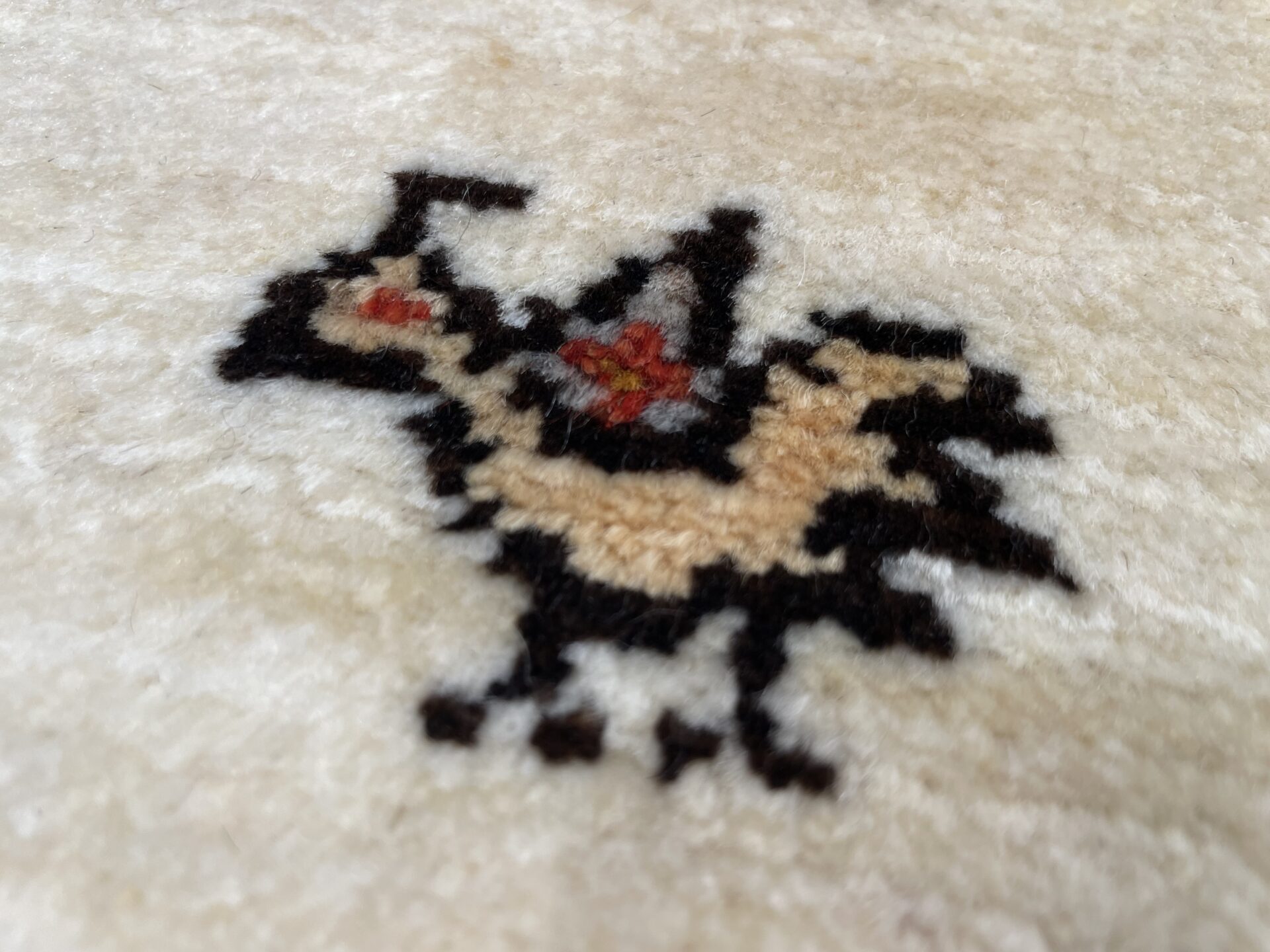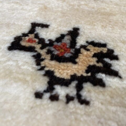 無染色の原毛をベースに、空高く飛ぶ幸せを運ぶ鳥たち。健康・長寿を願う生命の木。豊穣を願う鶏。イランの豊かな風景が可愛らしグラデ―ジョン部分も一目一目丁寧に織られていることが分かります。壁にかけて一枚の絵としても素敵ですね。