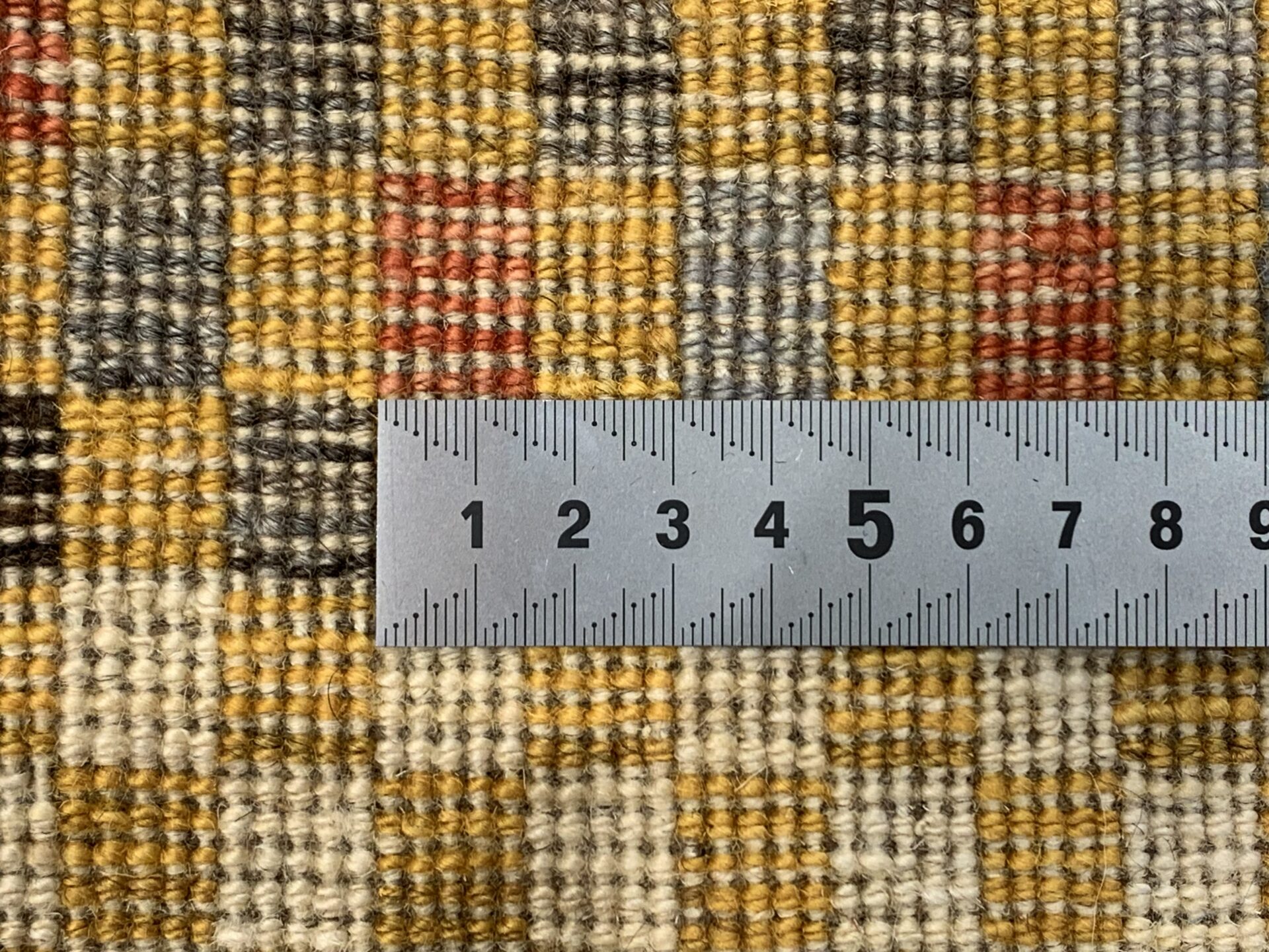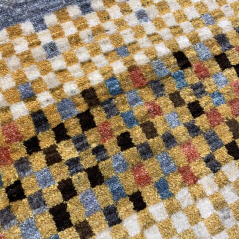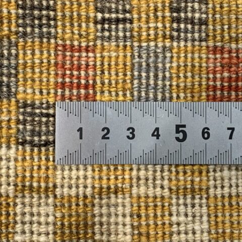 鮮やかな黄色と多彩な色使いが目を引く一枚です。中央の淡いベージュの地色に、カラフルな市松文様が施され、モダンでありながら伝統的な雰囲気を醸し出しています。上下にある黄色の縁取りが全体を引き締め、温かみのあるデザインとなっています。シンプルなインテリアにも良く映え、空間に活気と温かさをもたらします!