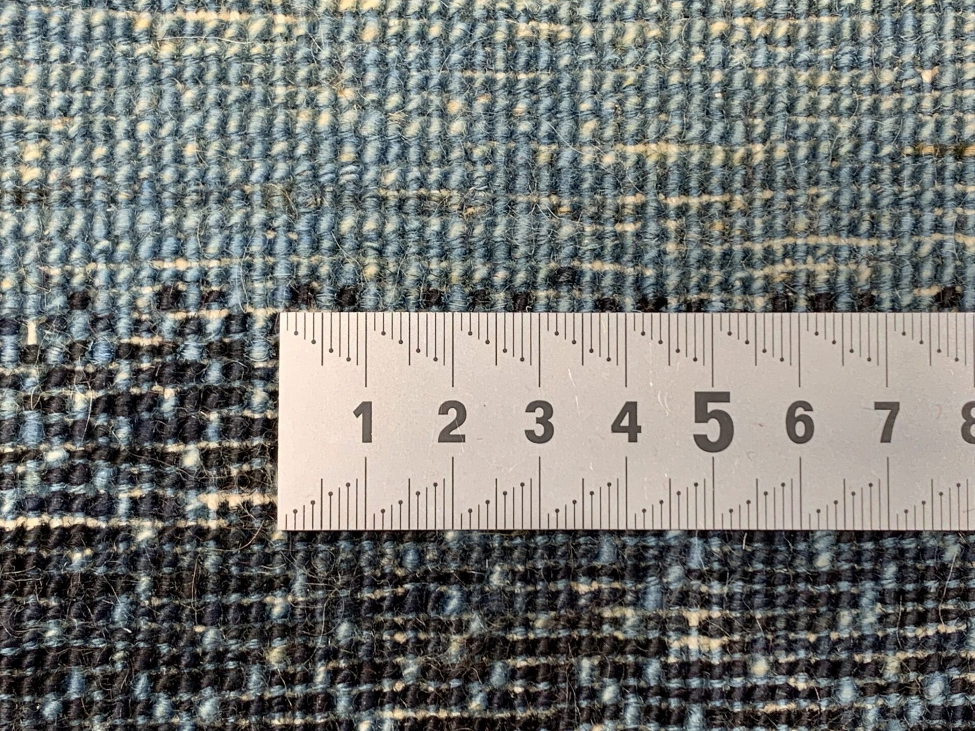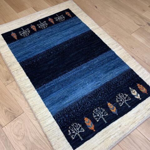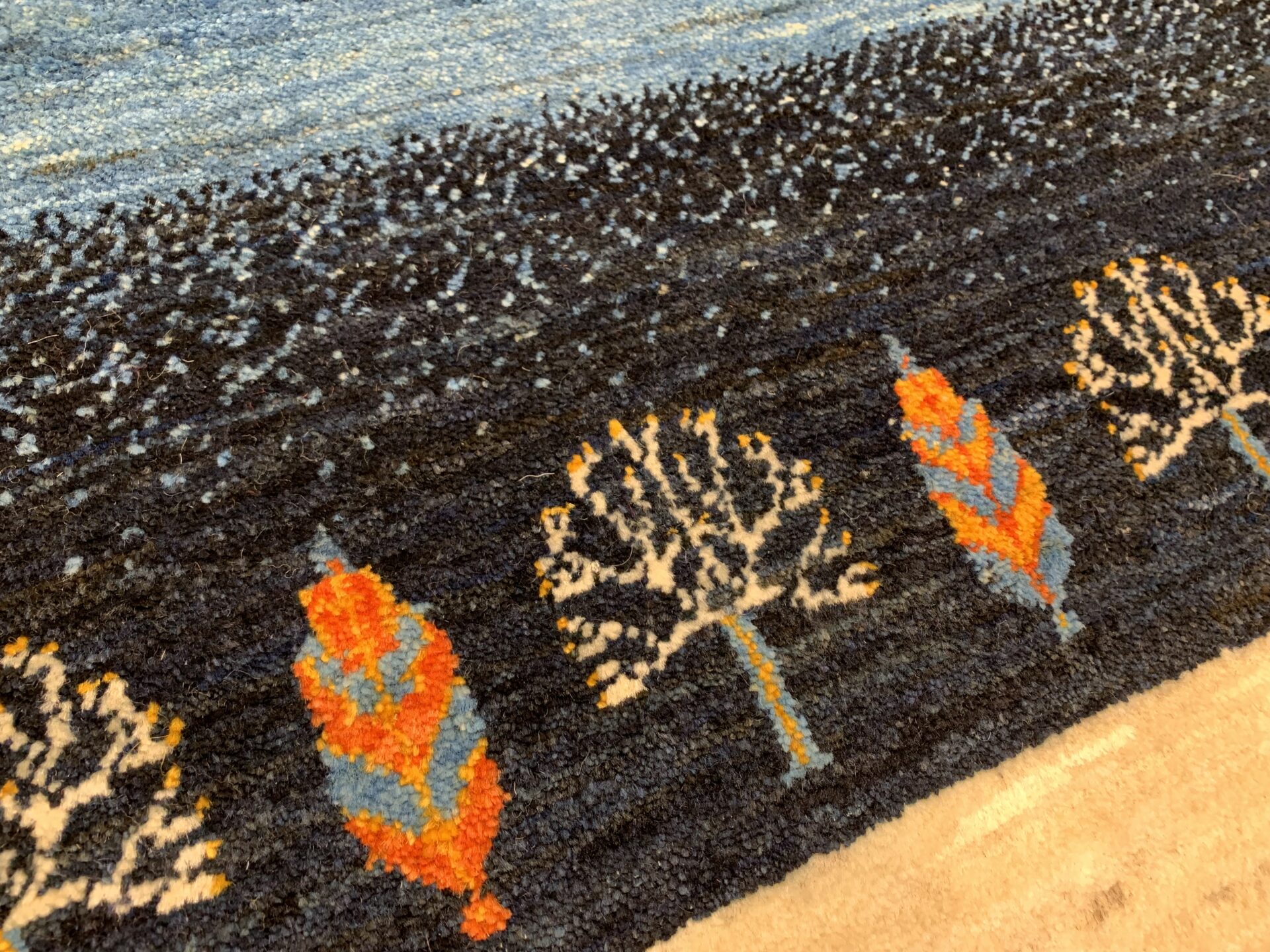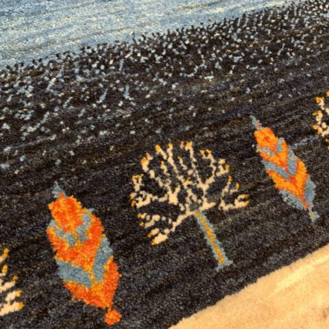 深い青色と自然のモチーフが印象的な一枚ですね。濃淡の異なる青のグラデーションが、海や夜空を連想させ、見る者に穏やかな気持ちをもたらします。上下に配置された木や葉のデザインは、生命と成長を象徴し、自然への敬意が感じられます。玄関やベッドルームに敷くことで、空間に落ち着きと温かみをもたらすでしょう!