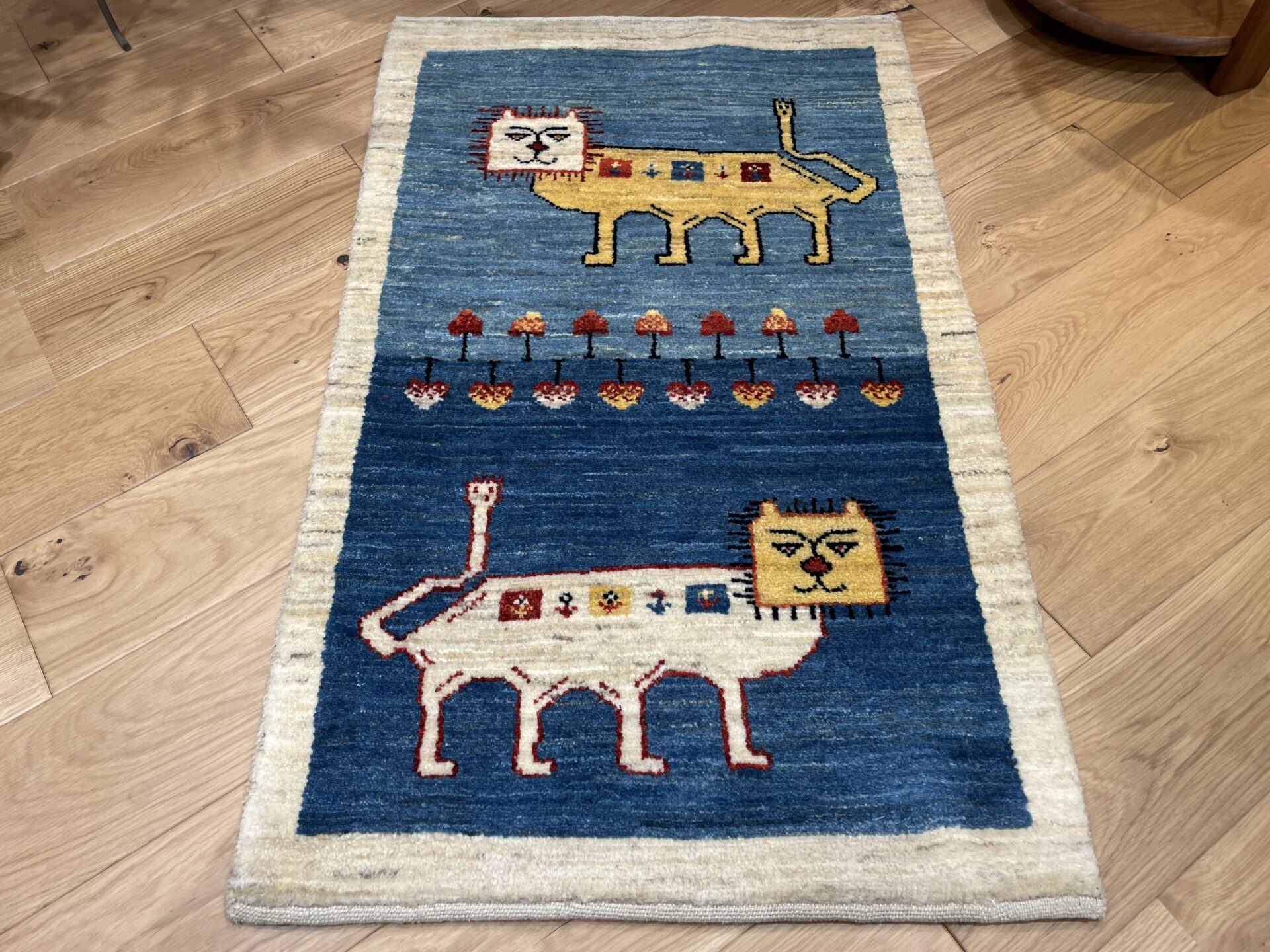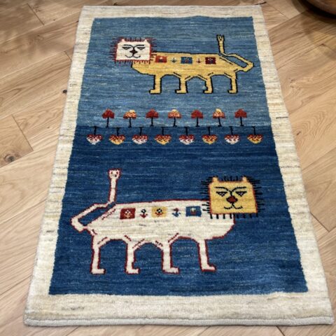 猫のような愛らしい表情を持つライオンが、ユニークで印象的なデザインとなっています。中央のハート型の生命の樹、またライオンの体の中には花模様が描かれ彩りを添えています。手織りの柔らかな風合いと、遊び心溢れるデザインが、玄関、リビングや子供部屋に楽しいアクセントを加えてくれるでしょう!