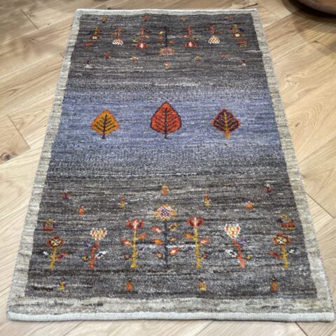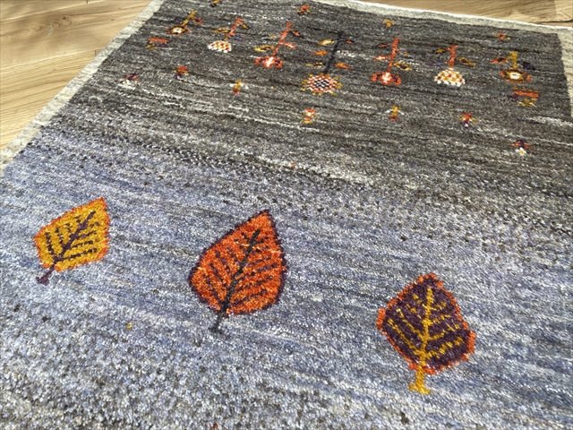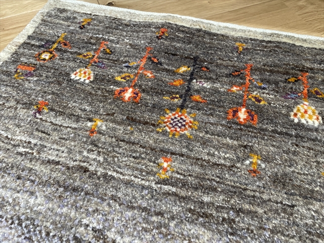 淡い紫を基調にした優しい色合いと可愛らしい生命の樹がデザインされた一枚です。中央に配置された3本の生命の樹は健康と長寿の象徴であり、ギャッベ全体に温かみと生命力を感じさせます。上下には春の訪れを意味する花柄が折り込まれ華やかさを添えてくれています。玄関、リビングや寝室など、どこに置いても落ち着きと癒しを提供してくれることでしょう!