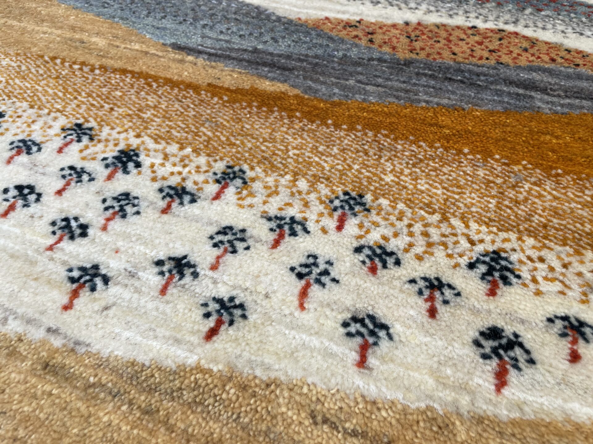 イランの美しい風景がデザインされた一枚です。色とりどりの帯状の模様が、まるで砂漠の風景を描くかのように広がり、遠くに見える羊の群れとヤシの木がアクセントを添えています。羊は財産を象徴し、ヤシの木は生命力を象徴するモチーフとして使われています。絵画のように遠近感もあり見る人の目を惹きつけます。