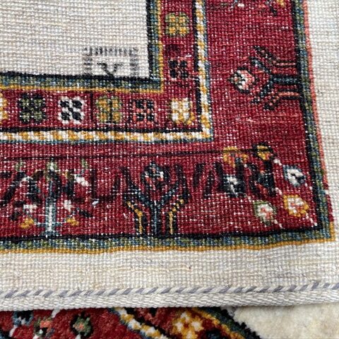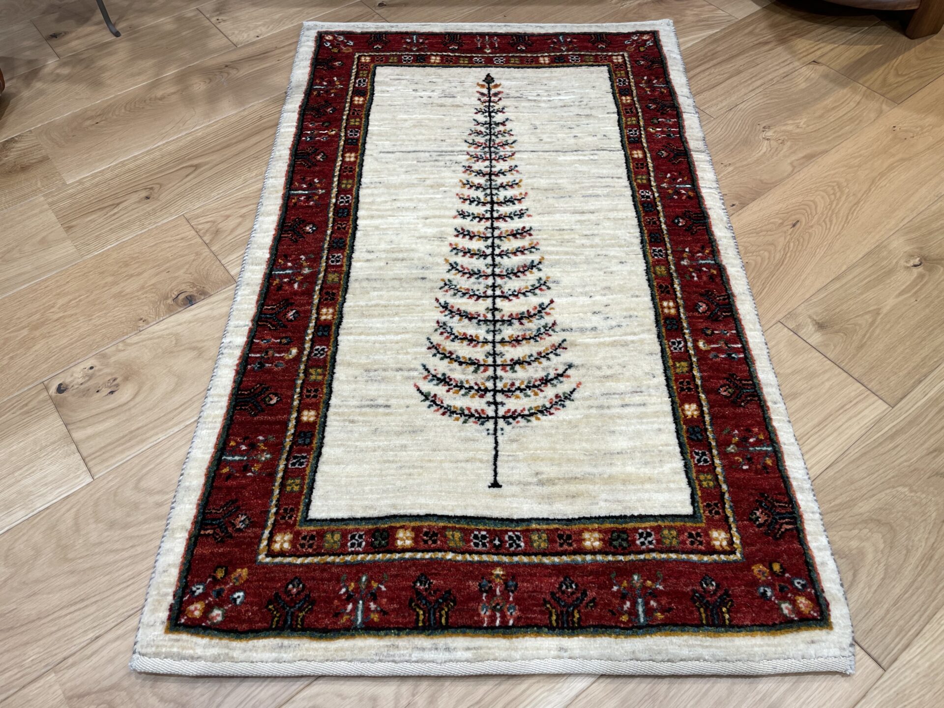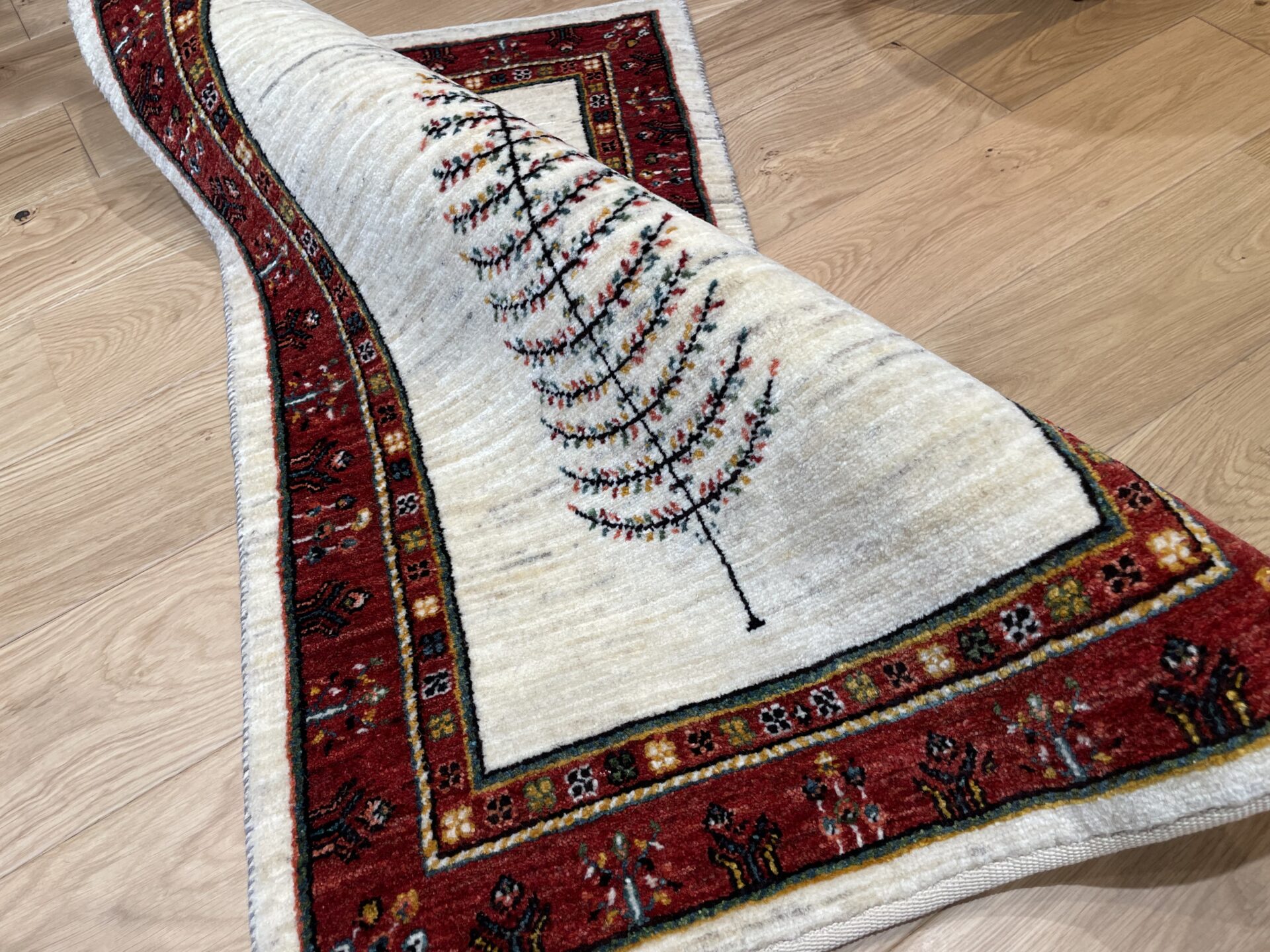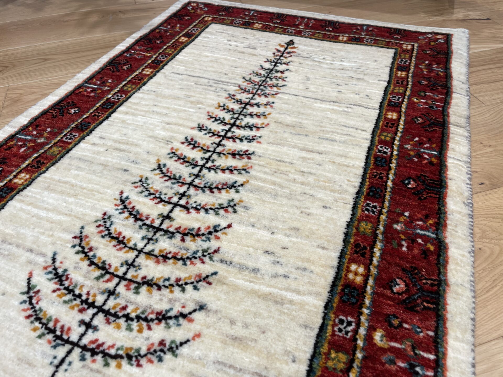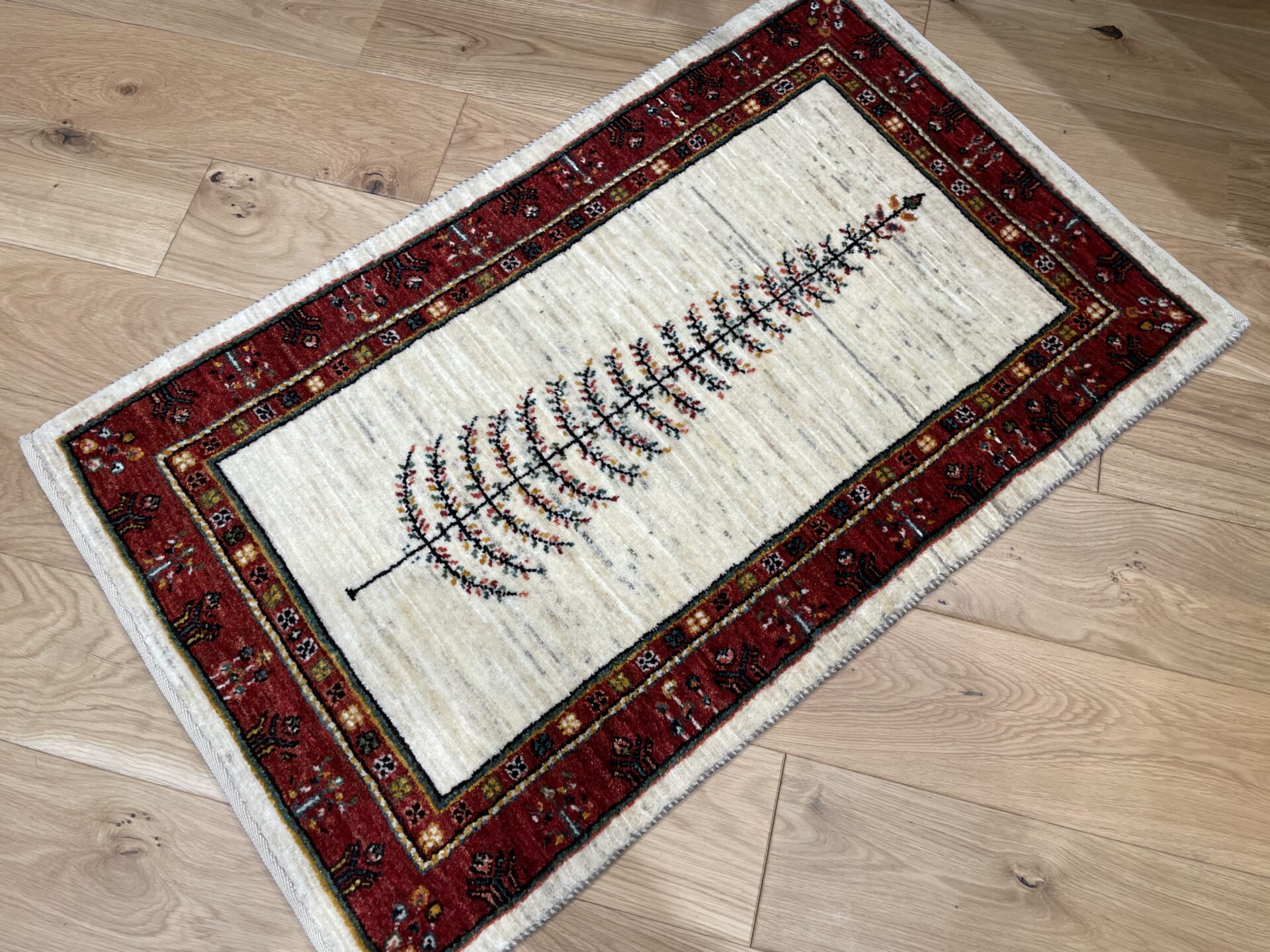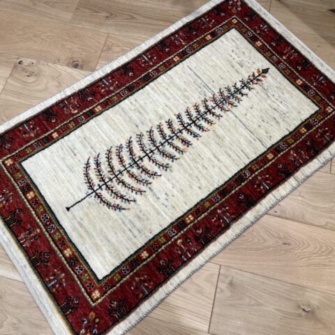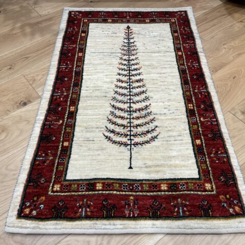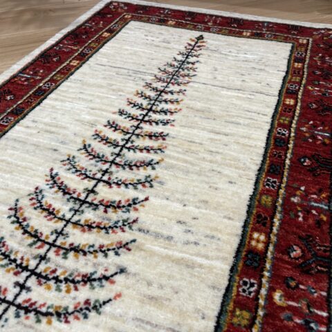 最も織り目の細かいルリバフランクの逸品です。中央に大きく1本描かれた生命の樹のモチーフが目を惹きます。深みのある赤いボーダーが全体を引き締め、高級感を醸し出してくれていますね。日常の中に特別なひとときをもたらしてくれるでしょう。品質とデザインの両方を兼ね備えた一枚です。