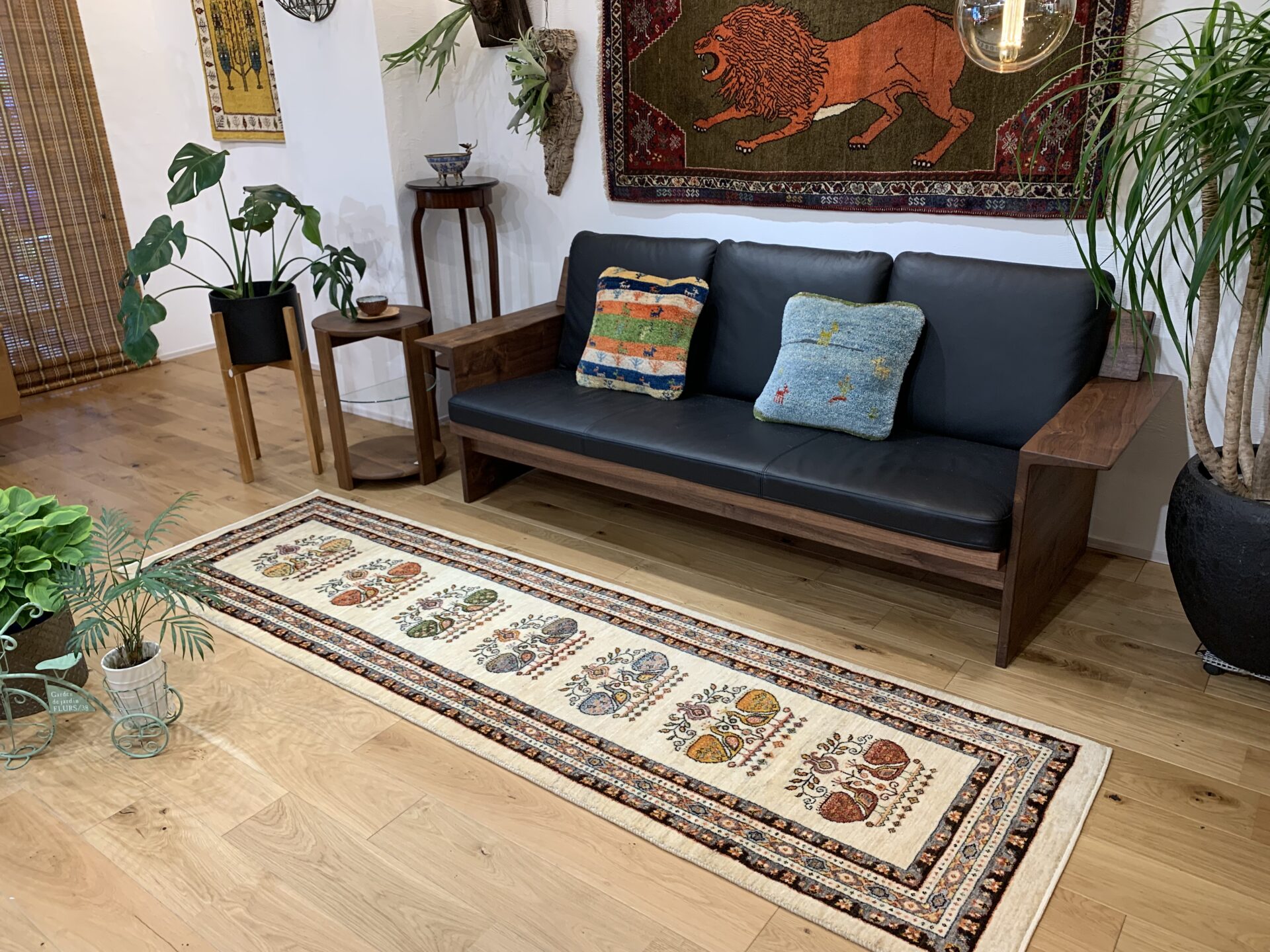 こちらの無染色ギャッベは、染めてない羊の毛をそのまま使用して織られた1枚です。中央に描かれた孔雀のモチーフは、古くから神様の使いとして崇められ、幸運を運ぶ縁起の良い鳥とされています。その優美な姿と、手織りならではの温かみのあるデザインが見事に調和し、空間に穏やかな雰囲気をもたらすでしょう。最も細い糸を使用して技術の高い職人が制作しており、ゾランヴァリ最高ランクの傑作です。