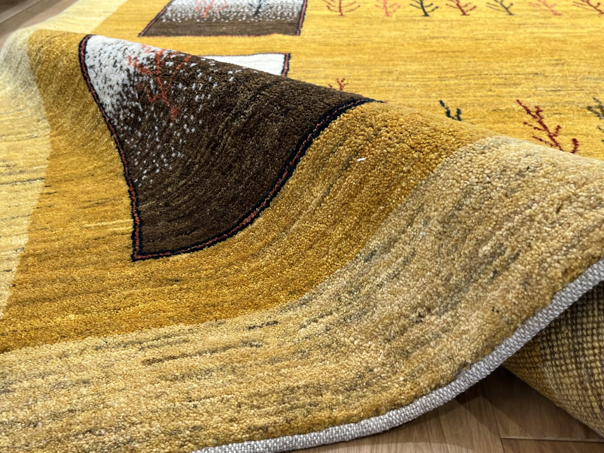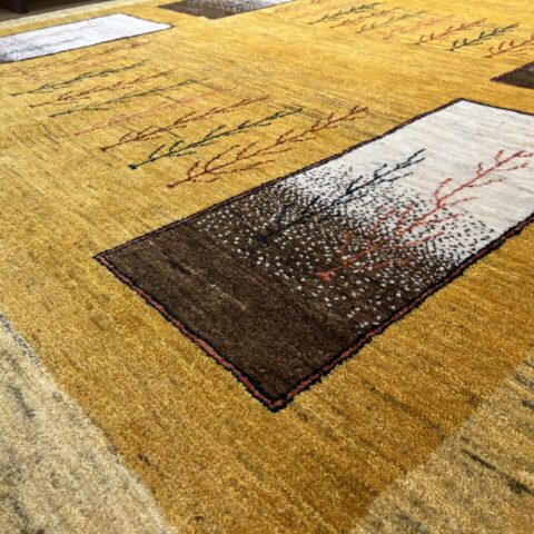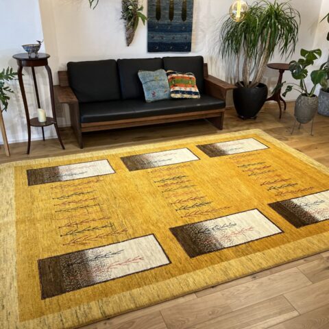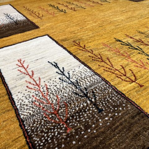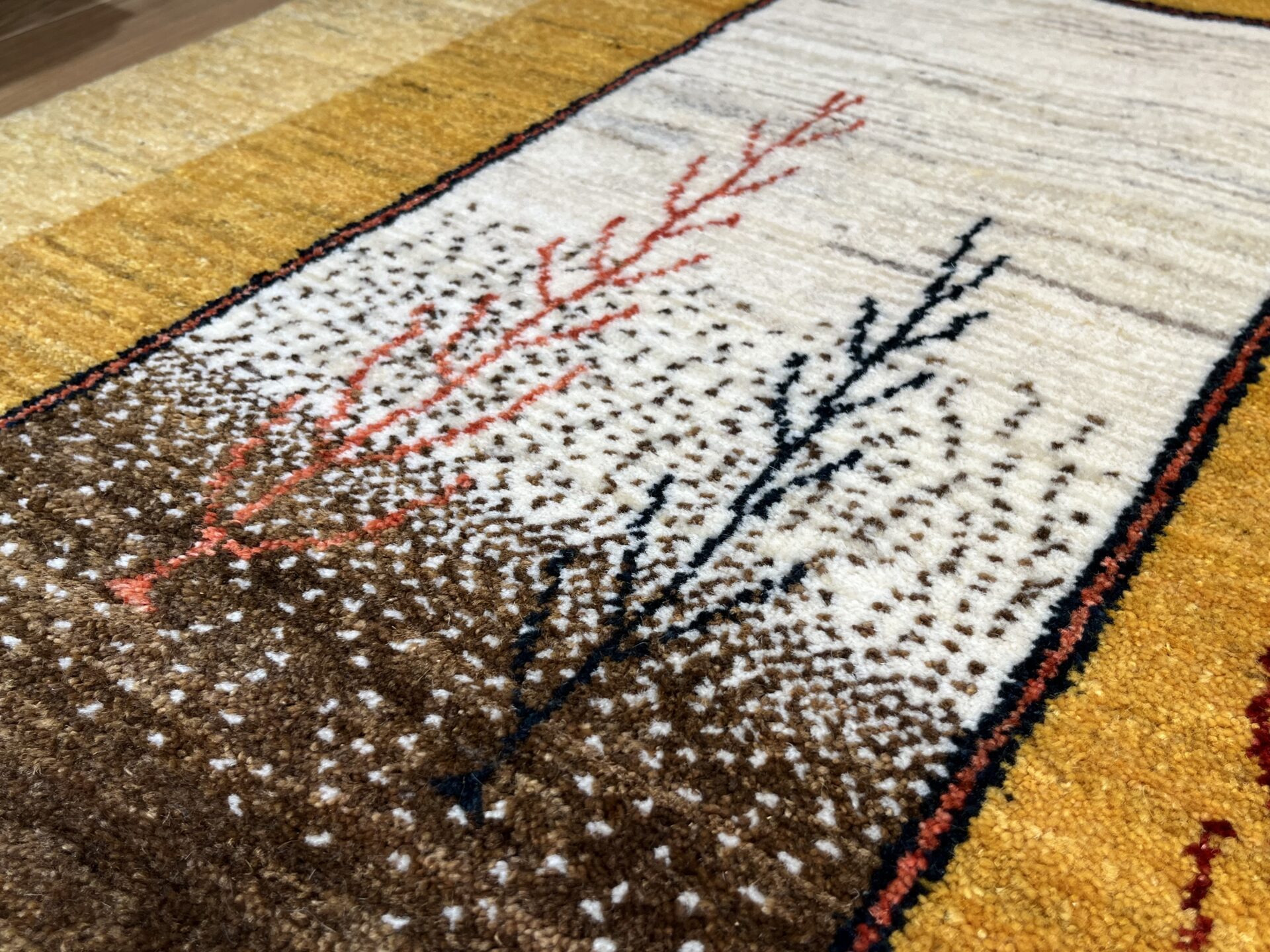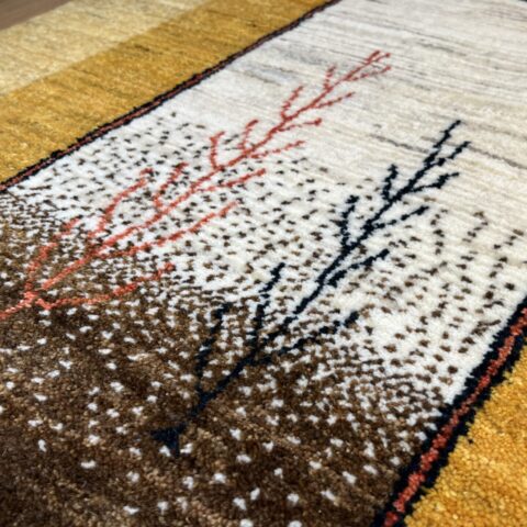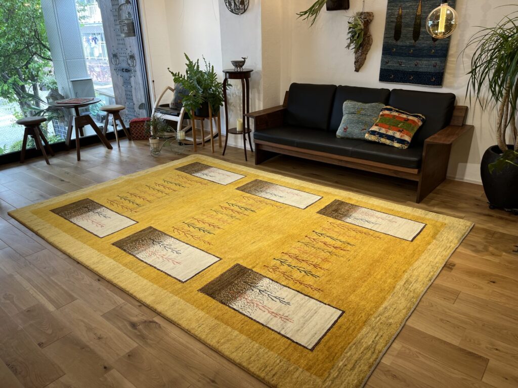 鮮やかな黄色が美しい一枚で、空間に明るさと温かみをもたらします。一部に使われた白の原毛が、全体に爽やかな印象を加え、バランスの取れたデザインとなっています。中央に織り込まれた生命の樹のモチーフは、天国に上る階段とも呼ばれ、健康と長寿の願いを込めた縁起の良いデザインです。リビングやダイニングなど、日常の空間に置くことで、鮮やかな彩りとともに幸福を招くアイテムとして活躍します。