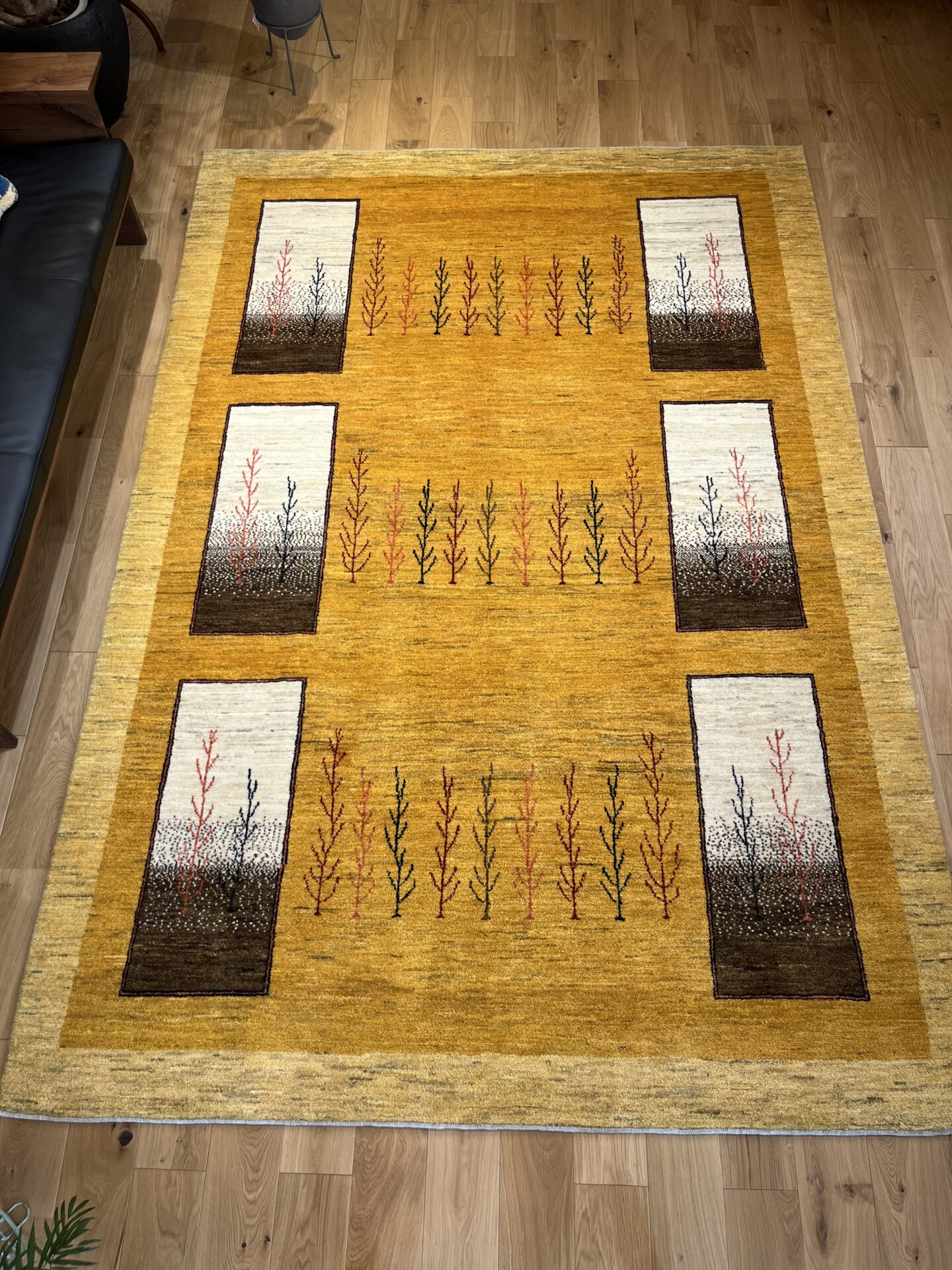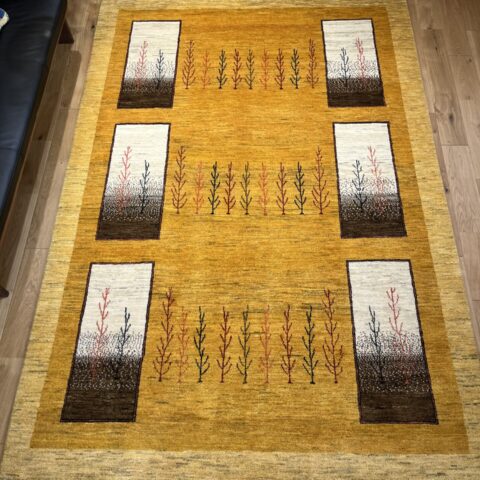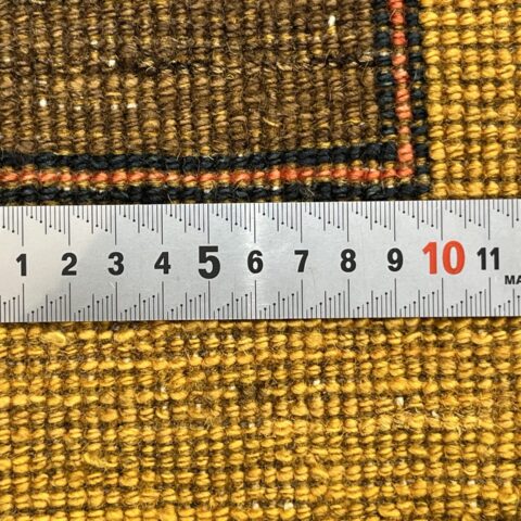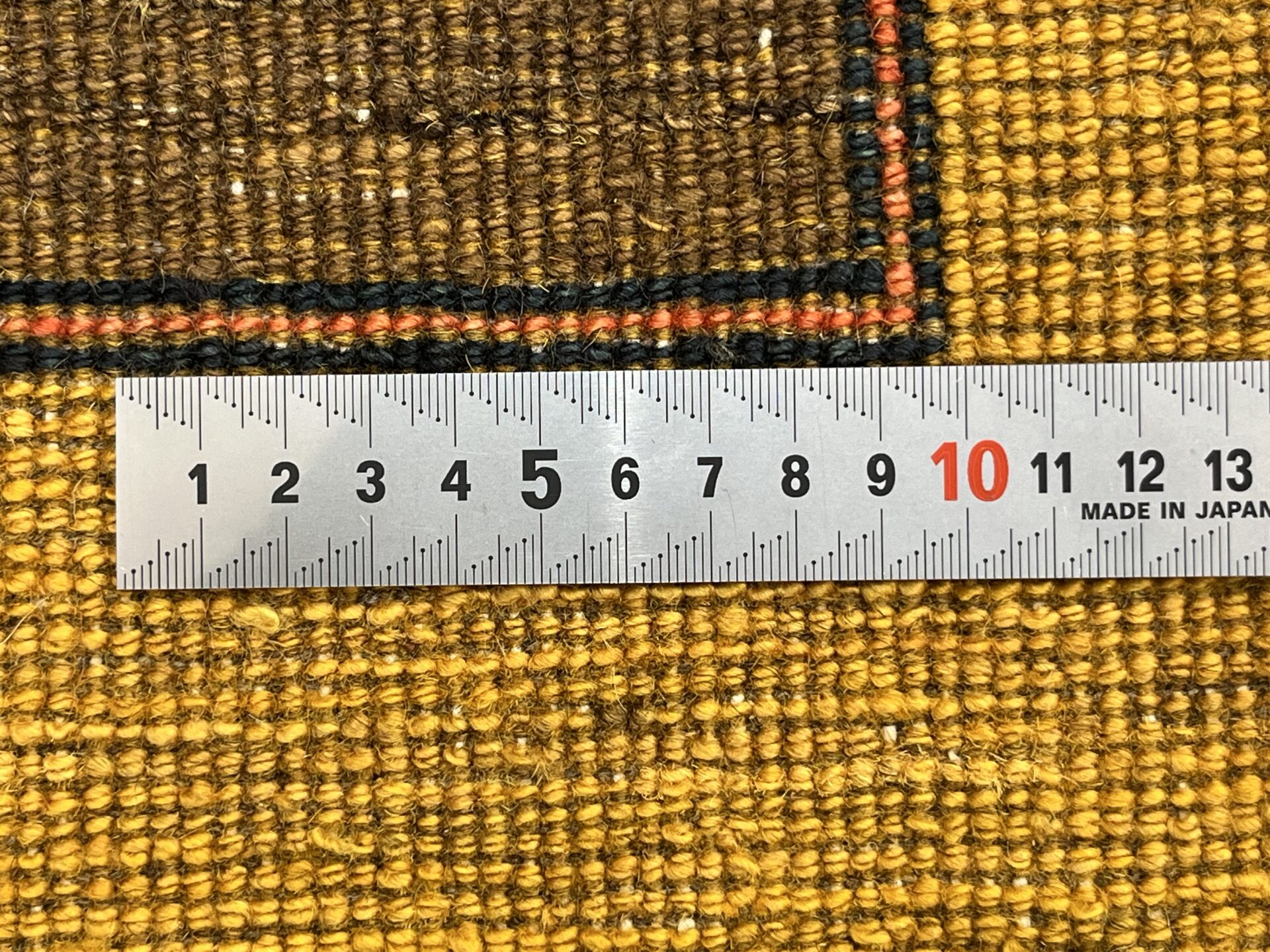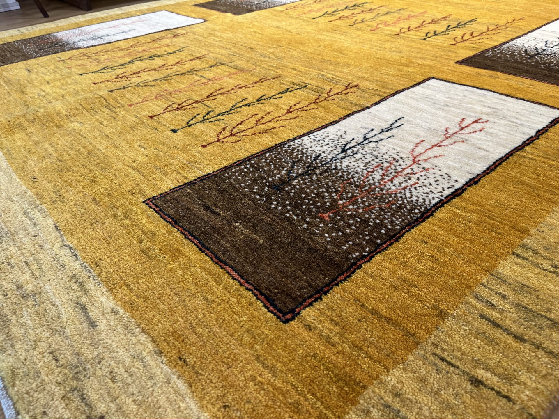 鮮やかな黄色が美しい一枚で、空間に明るさと温かみをもたらします。一部に使われた白の原毛が、全体に爽やかな印象を加え、バランスの取れたデザインとなっています。中央に織り込まれた生命の樹のモチーフは、天国に上る階段とも呼ばれ、健康と長寿の願いを込めた縁起の良いデザインです。リビングやダイニングなど、日常の空間に置くことで、鮮やかな彩りとともに幸福を招くアイテムとして活躍します。
