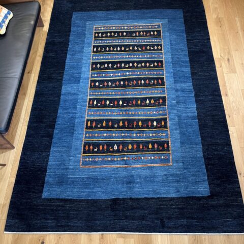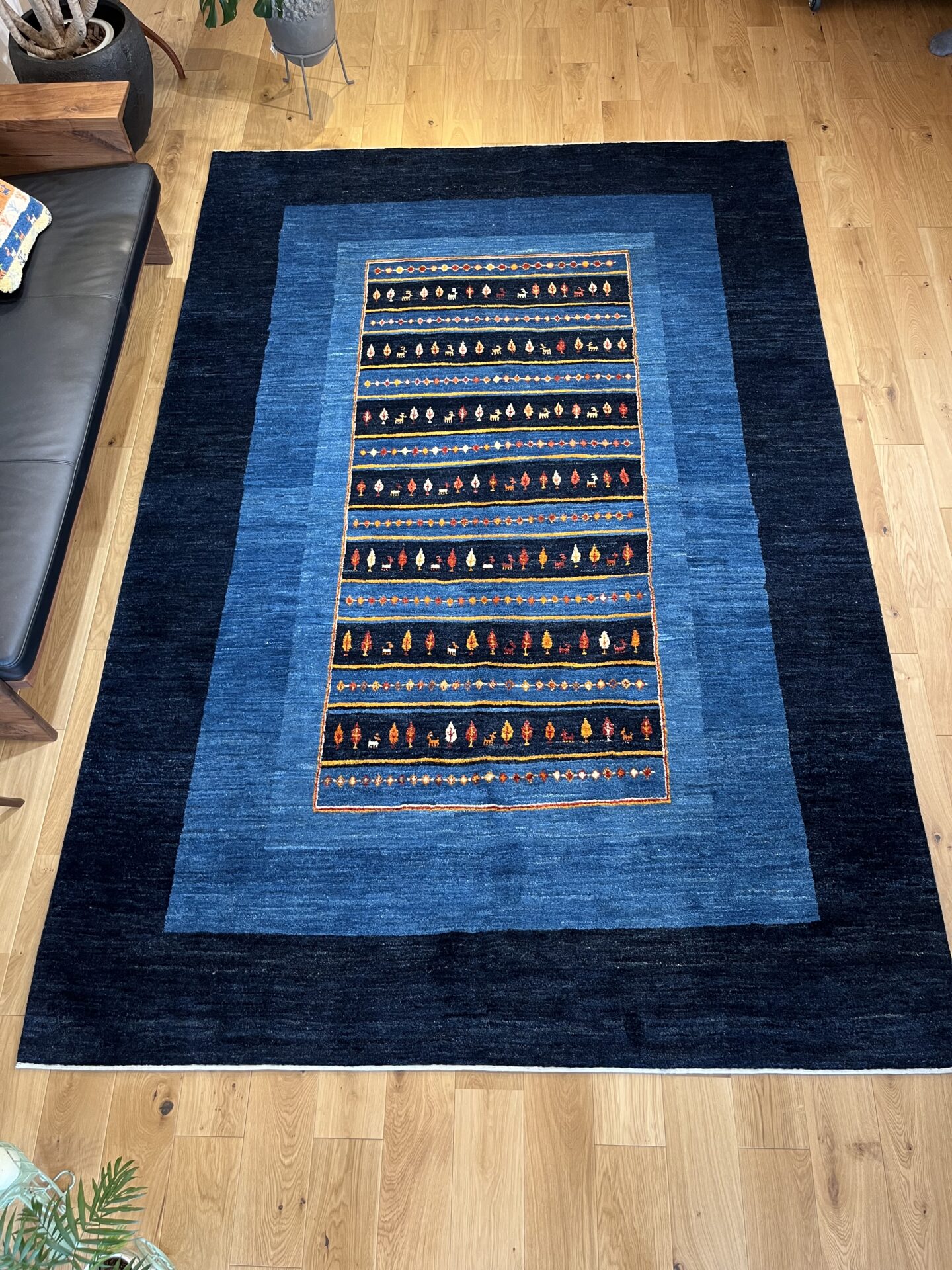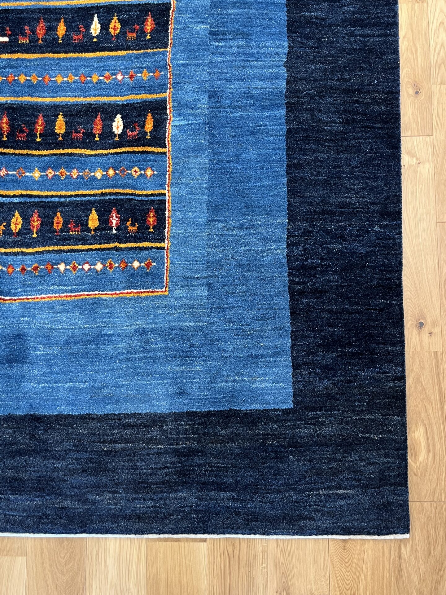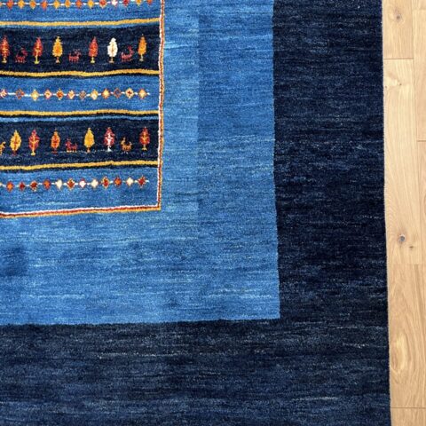 淡いブルーと濃紺の色調が織りなす、非常に美しい一枚です。中央に織り込まれたカラフルな小さなモチーフがは財産を意味する羊、健康・長寿の生命の樹、菱形の文様は魔除けのモチーフ。ブルーは藍染めで、古くから魔除けや浄化の意味を持つ色とされ、見る者に安心感をもたらしてくれます。モダンな空間にも伝統的な空間にも調和し、リビングや書斎など、落ち着いた雰囲気を求める場所にぴったりです。その深みのある色合いとシンプルなデザインが、長く愛される一枚となるでしょう。
