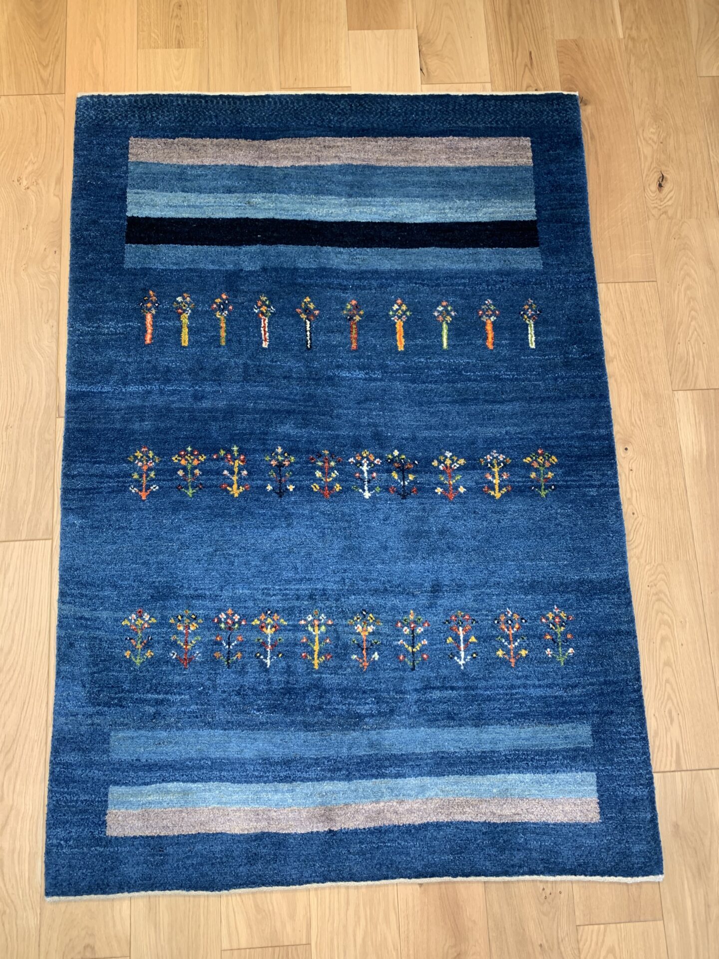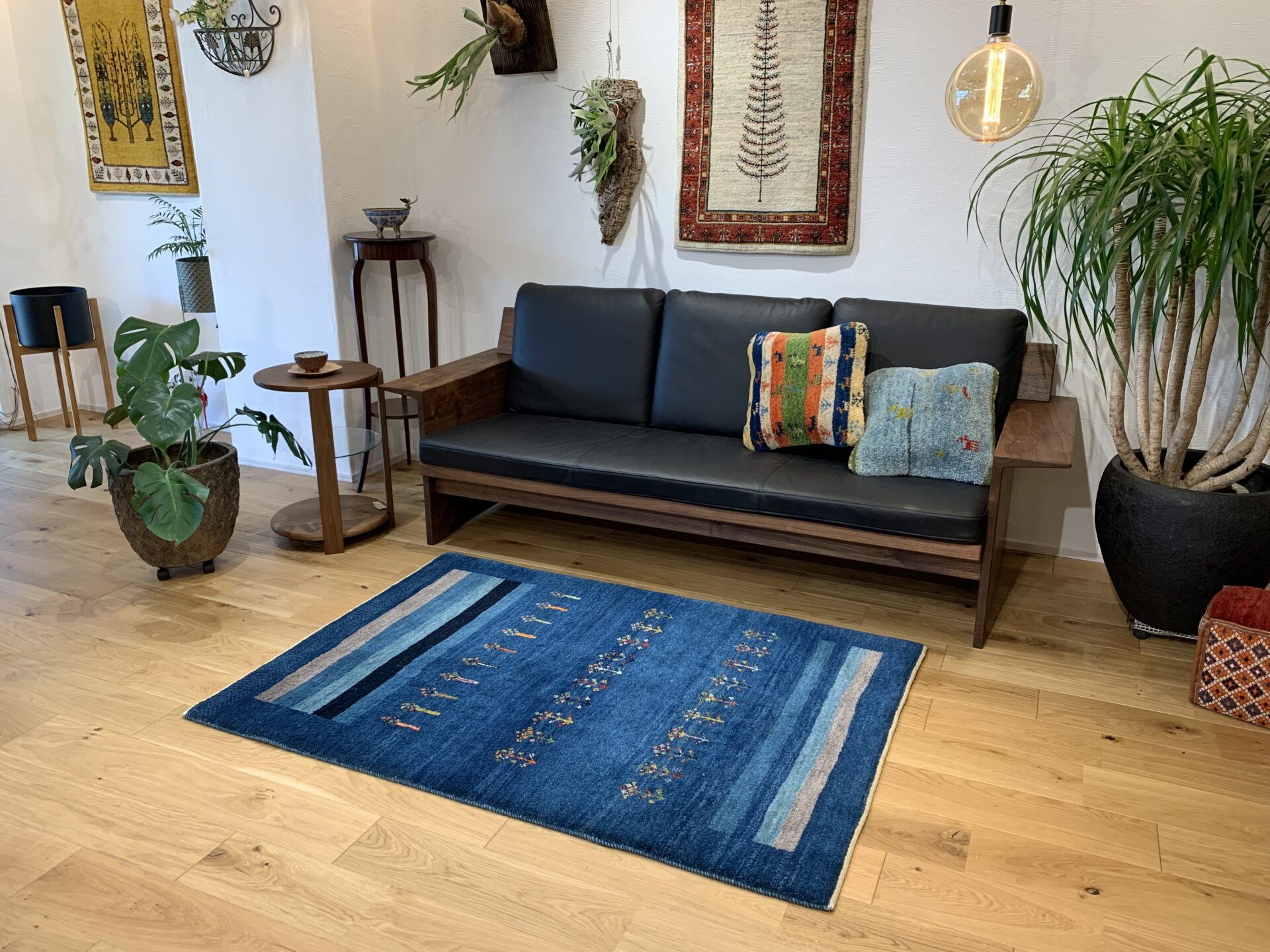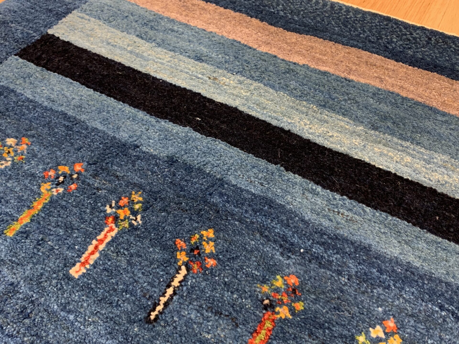 藍染めの濃淡が美しいグラデーションを描く一枚です。中央には春への憧れを象徴する花が散りばめられ、生命の息吹が感じられるデザインです。藍の深い色合いと光沢が、空間に落ち着きと品格をもたらします。さらに、長い毛足が生み出す柔らかなクッション感が、足元に贅沢な心地よさを提供します。このギャッベの上で過ごす時間は、日常の疲れを忘れさせる至福のひとときとなるでしょう。
