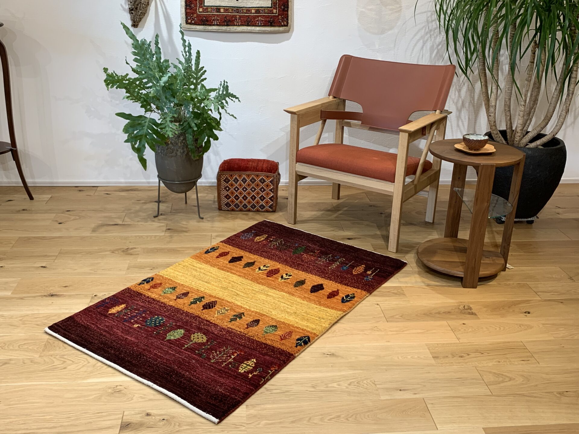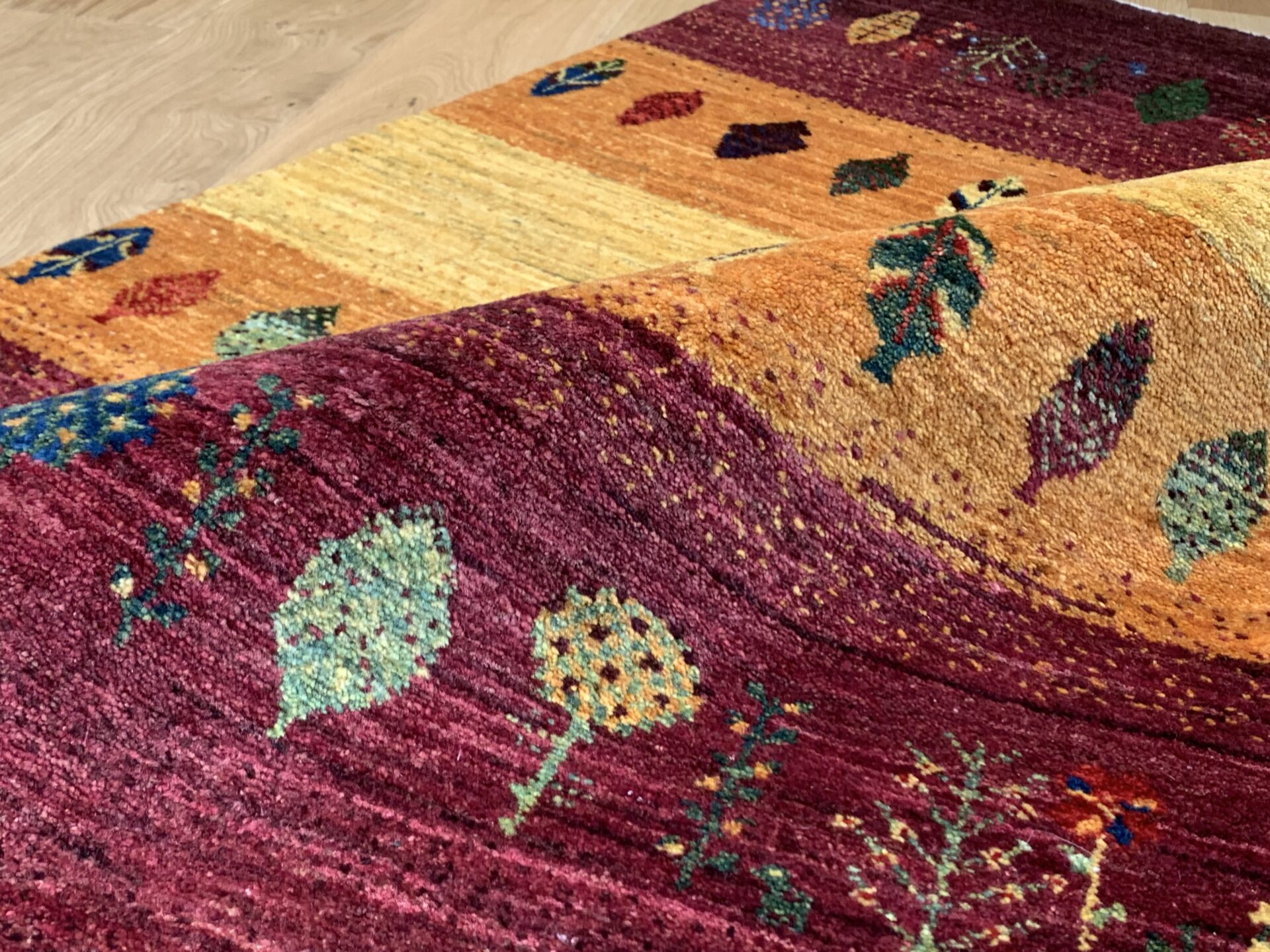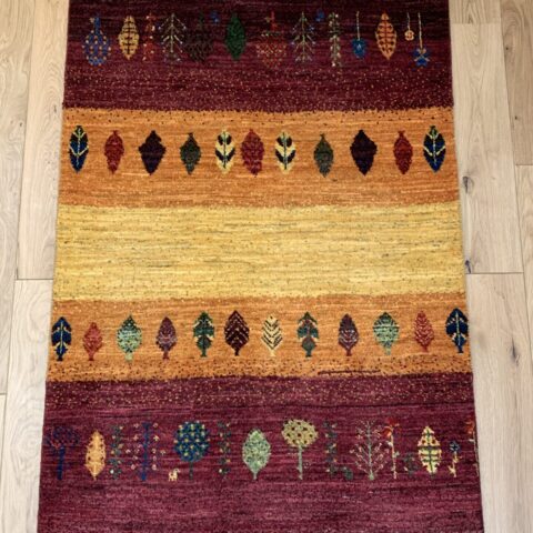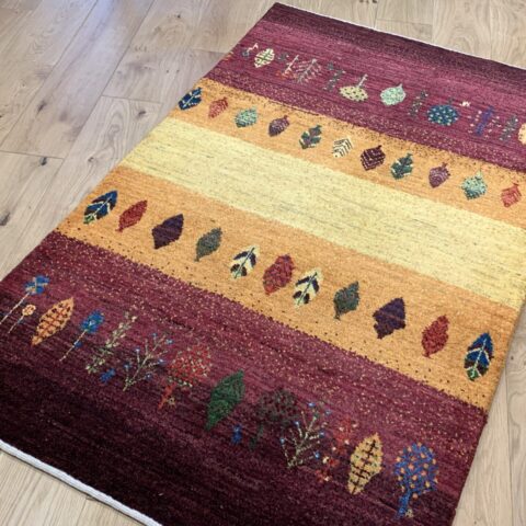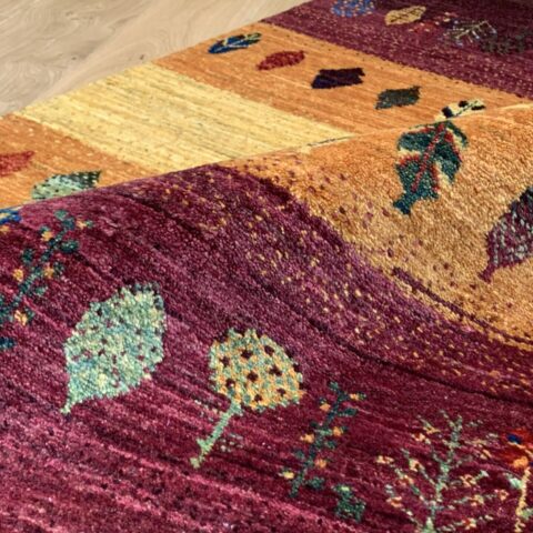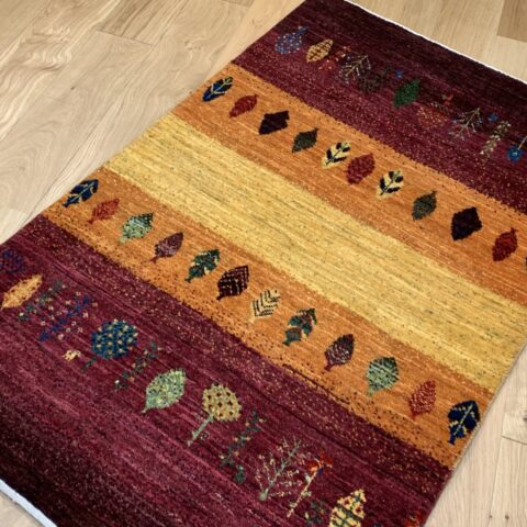 カシュクリ・ギャッベはアマレよりも細かな糸を使い、より緻密で滑らかな織りが特徴です。草木染めの色が美しく映え、模様の表現力も豊か。品質と軽やかさのバランスに優れ、使い心地と見た目の両方にこだわりたい方に最適な「カシュクリ ギャッベ」です。