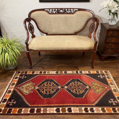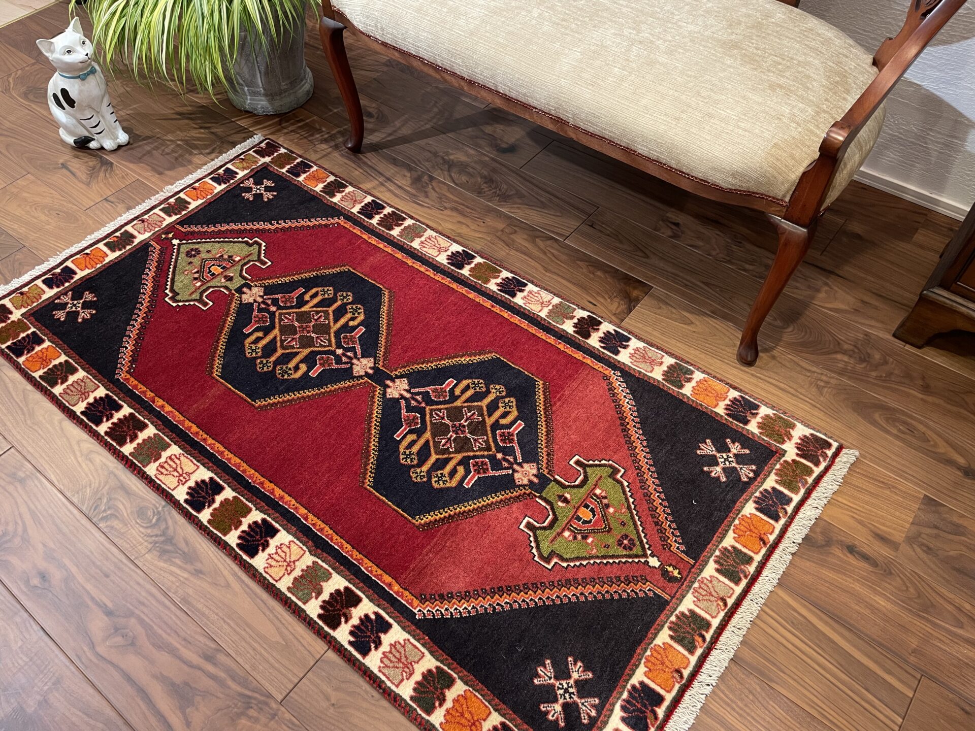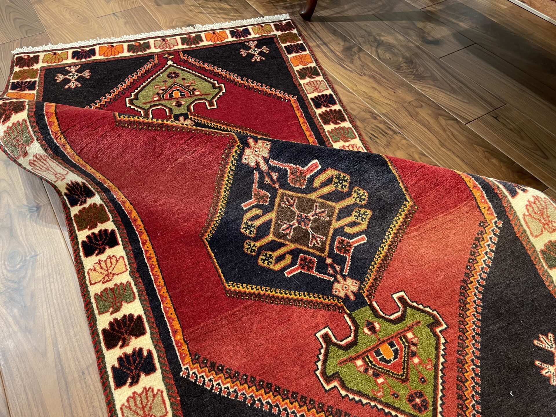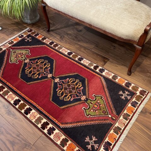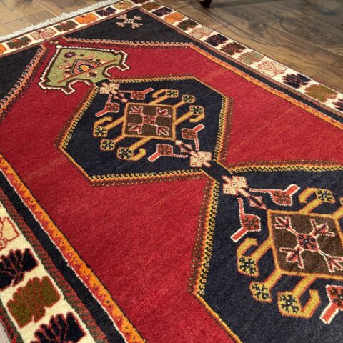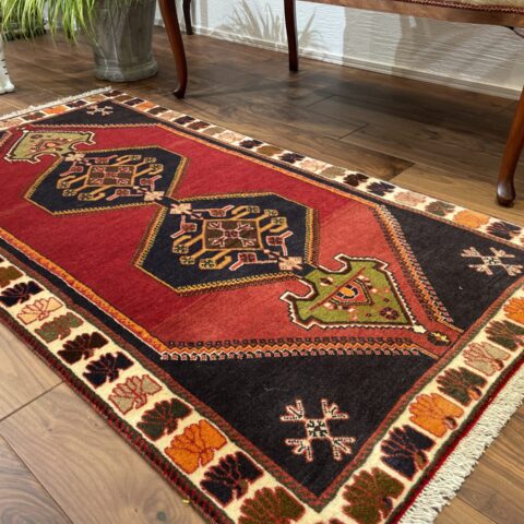 こちらは20~30年の歴史を刻むビンテージのシラーズ産ペルシャ絨毯。鮮やかな赤と黒のコントラストが印象的で、中心に描かれた幾何学模様がクラシックな魅力を放っています。縁に施された色とりどりのモチーフも遊牧民の文化を感じさせ、絨毯全体に温かみと芸術性を与えています。細長いサイズ感はコンパクトなスペースにも馴染みやすく、玄関やリビングのアクセントとしてもおすすめ。お部屋に上質な雰囲気をプラスする一枚です。