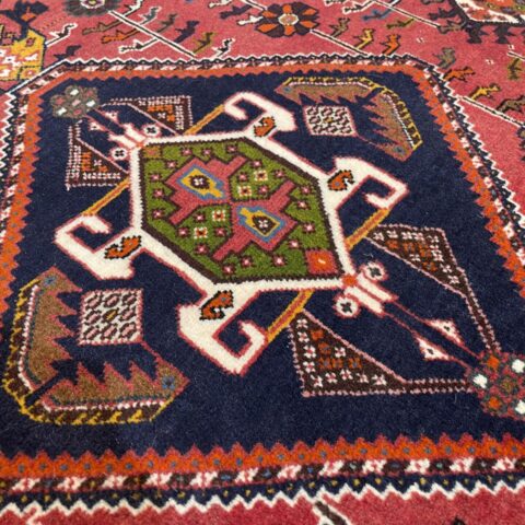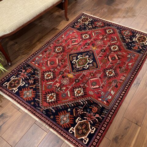 中央と四隅に描かれた六角形のモチーフは『スカラベ文様』と呼ばれています。これはフンコロガシ(昆虫)を象徴しており、フンを転がす姿が古代では太陽神の化身とされ、生命や再生のシンボルとして絨毯に取り入れられるようになりました。壮大な歴史と深い意味を持つデザインが、鮮やかな赤と深い紺の背景に映えるこの一枚は、見ているだけで神秘的な物語を感じさせます。アートとしての価値も高く、お部屋の中心に置くことで特別な空間を演出します。