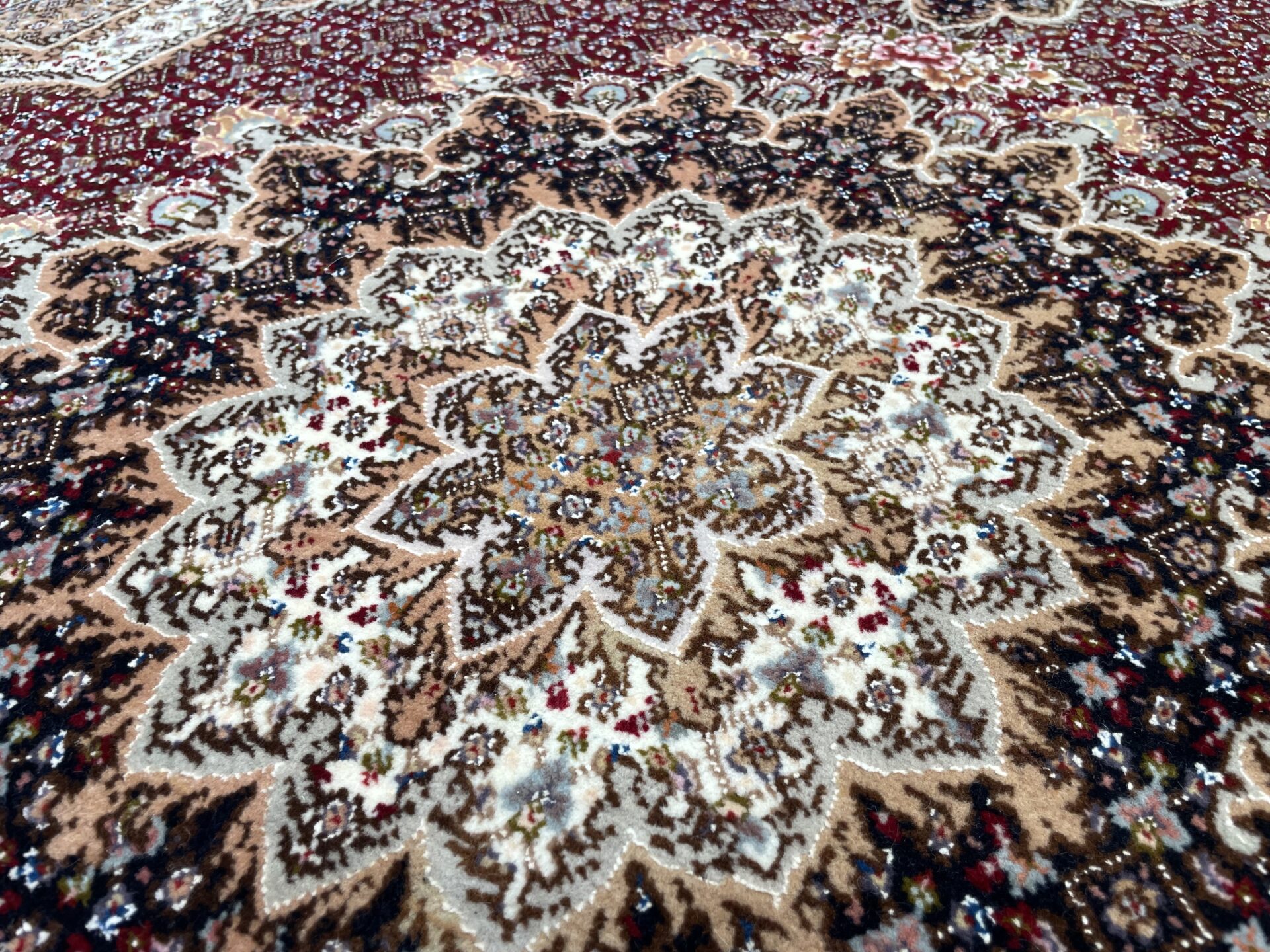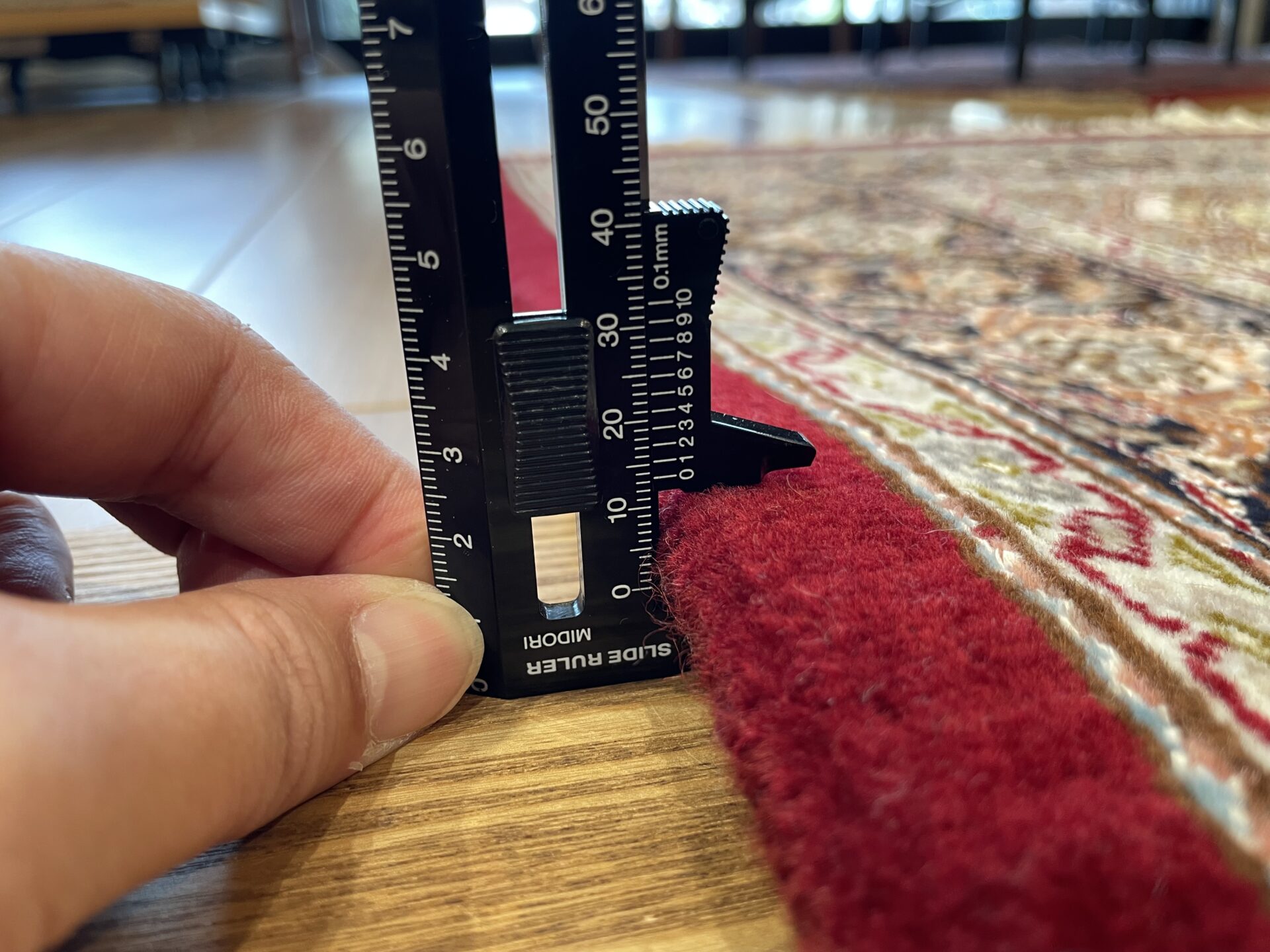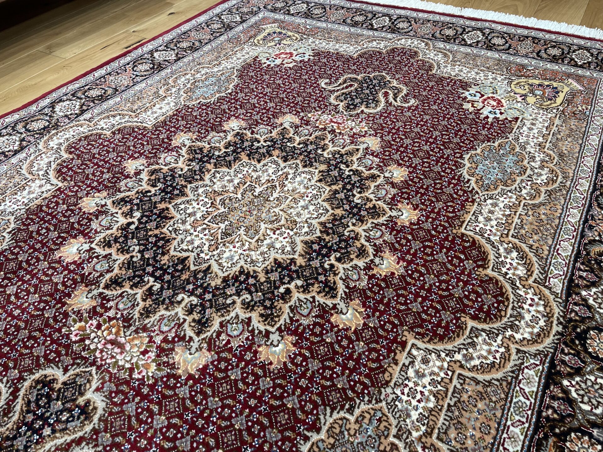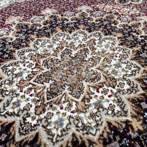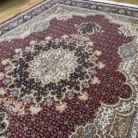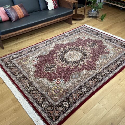 こちらは約30年前にイラン・タブリーズで手織りされたヴィンテージのペルシャ絨毯です。タブリーズ地方を象徴する「ヘラティ紋様」が施されており、4つのアカンサス葉に囲まれた菱形模様が繊細に織り込まれています。この文様は、タブリーズの伝統的な美意識を見事に体現しており、見る人に優雅で調和の取れた印象を与えます。特徴的な深みのある赤を基調とした配色は、空間に温かみと重厚感をプラスします。さらに、細部にわたる緻密な織りと美しい色彩のコントラストが、絨毯全体を一層引き立てています。この一枚を敷くことで、お部屋の雰囲気がぐっと引き締まり、高級感のある空間を演出します。ヴィンテージならではの味わい深さを、ぜひお楽しみください。