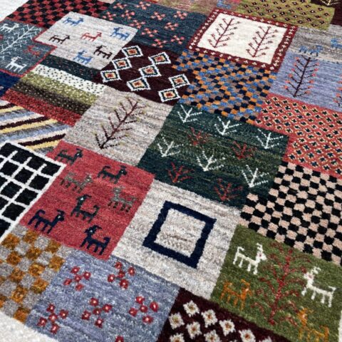 【カラフルなパッチワークギャッベ – まさに「これぞギャッベ」な一枚 】誰が見ても一目で「ギャッベ」とわかる、伝統的なパッチワークデザインのギャッベ。羊、木、井戸、オオカミの足跡など、遊牧民の願いが込められた縁起の良い文様がぎっしり詰まっています。細かな織りによるなめらかな肌触りも魅力。天然ウールの特性で、夏はさらっと快適、冬は暖かく、一年を通して心地よくお使いいただけます。お部屋に彩りと温もりをもたらす、特別な一枚をぜひ。