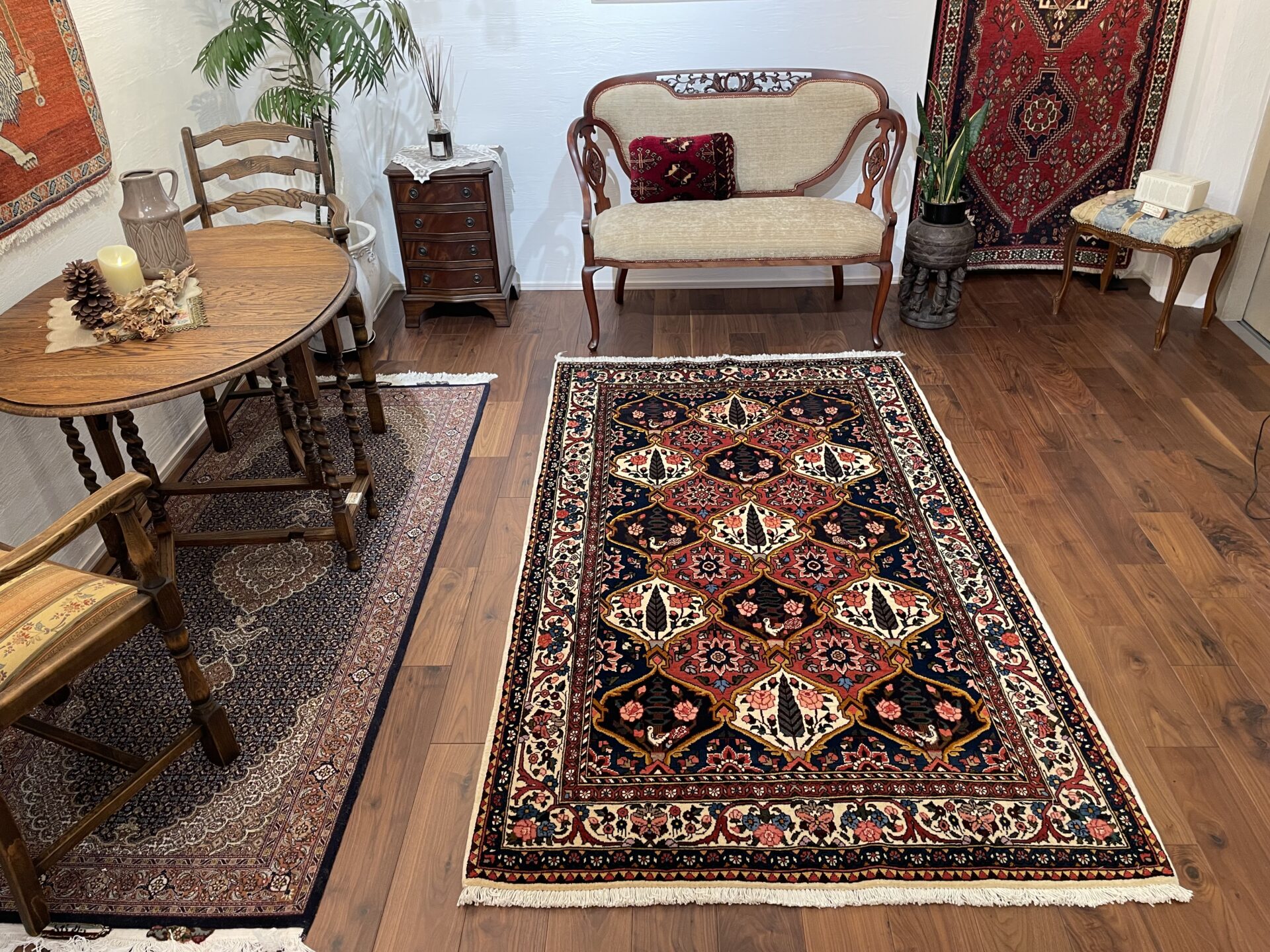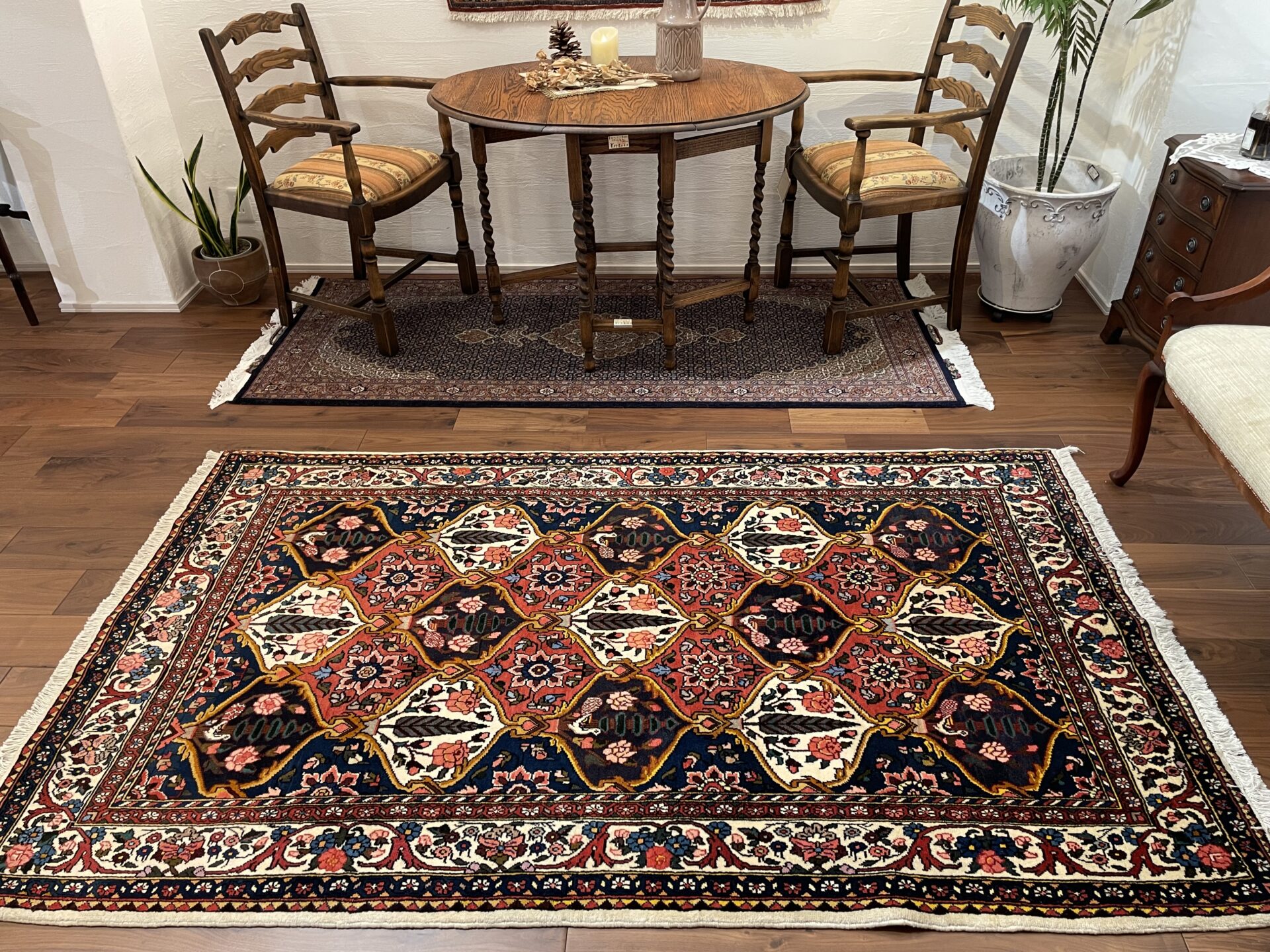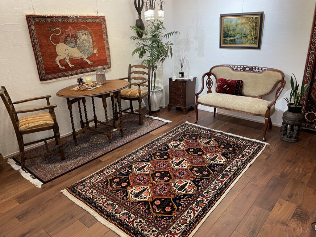 【シラーズ産ヴィンテージ絨毯 – 歴史と伝統が織りなす芸術】約20〜30年前に織られた、シラーズ産のヴィンテージ絨毯。イランにはアジア最古の杉の木が生息し、古くからペルシャ絨毯やギャッベのデザインに取り入れられてきました。また、織り込まれた薔薇の花は、イランの国花であり、神聖な花として古くから愛されてきたモチーフ。深みのある色彩と繊細な文様が、イランの歴史と伝統を感じさせる一枚。空間に格式と温かみをもたらす、時を超えた美しさをお楽しみください。