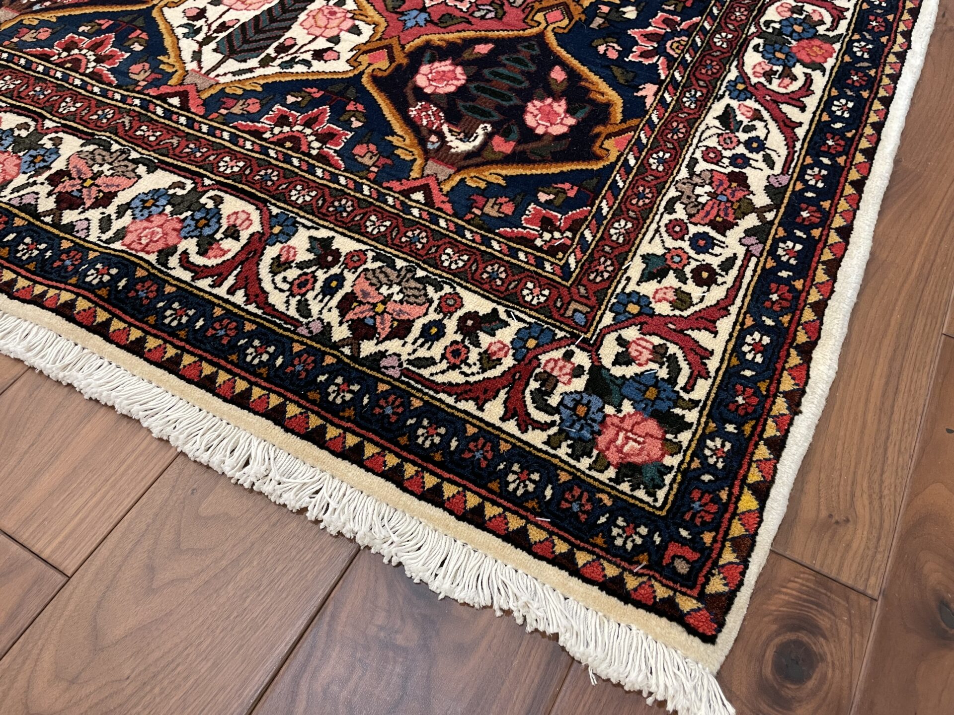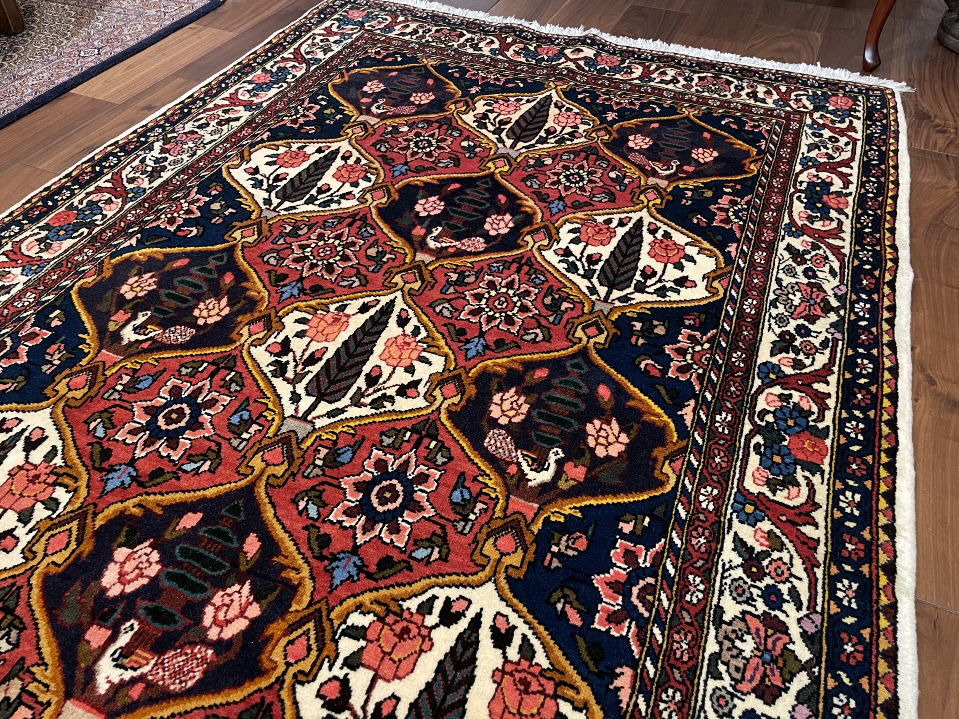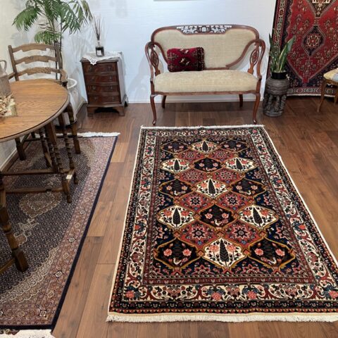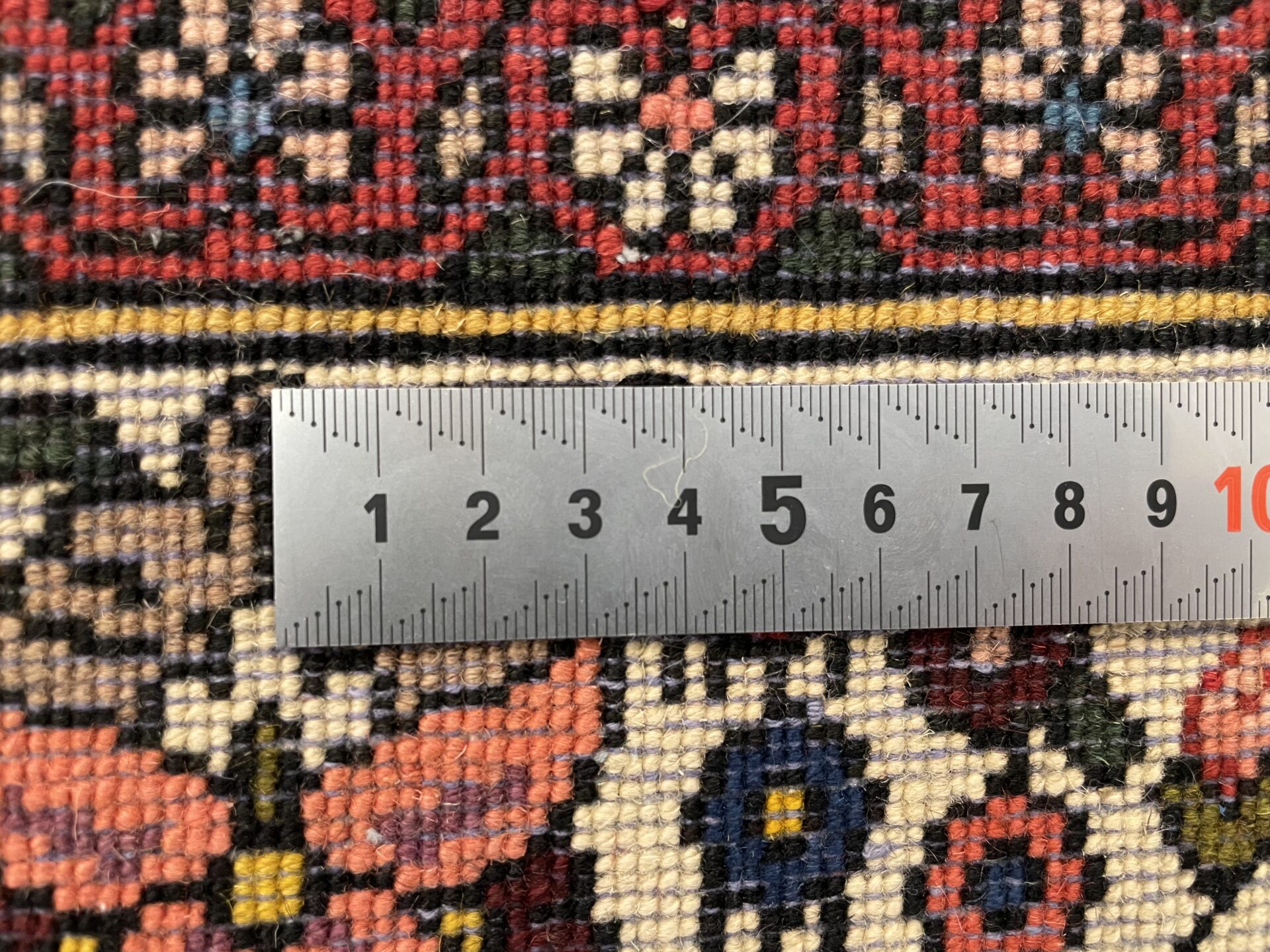 【シラーズ産ヴィンテージ絨毯 – 歴史と伝統が織りなす芸術】約20〜30年前に織られた、シラーズ産のヴィンテージ絨毯。イランにはアジア最古の杉の木が生息し、古くからペルシャ絨毯やギャッベのデザインに取り入れられてきました。また、織り込まれた薔薇の花は、イランの国花であり、神聖な花として古くから愛されてきたモチーフ。深みのある色彩と繊細な文様が、イランの歴史と伝統を感じさせる一枚。空間に格式と温かみをもたらす、時を超えた美しさをお楽しみください。