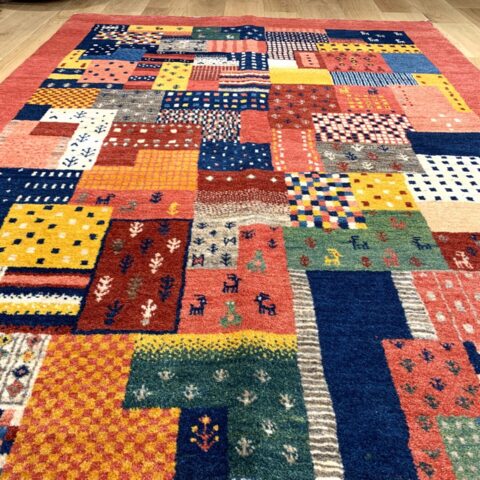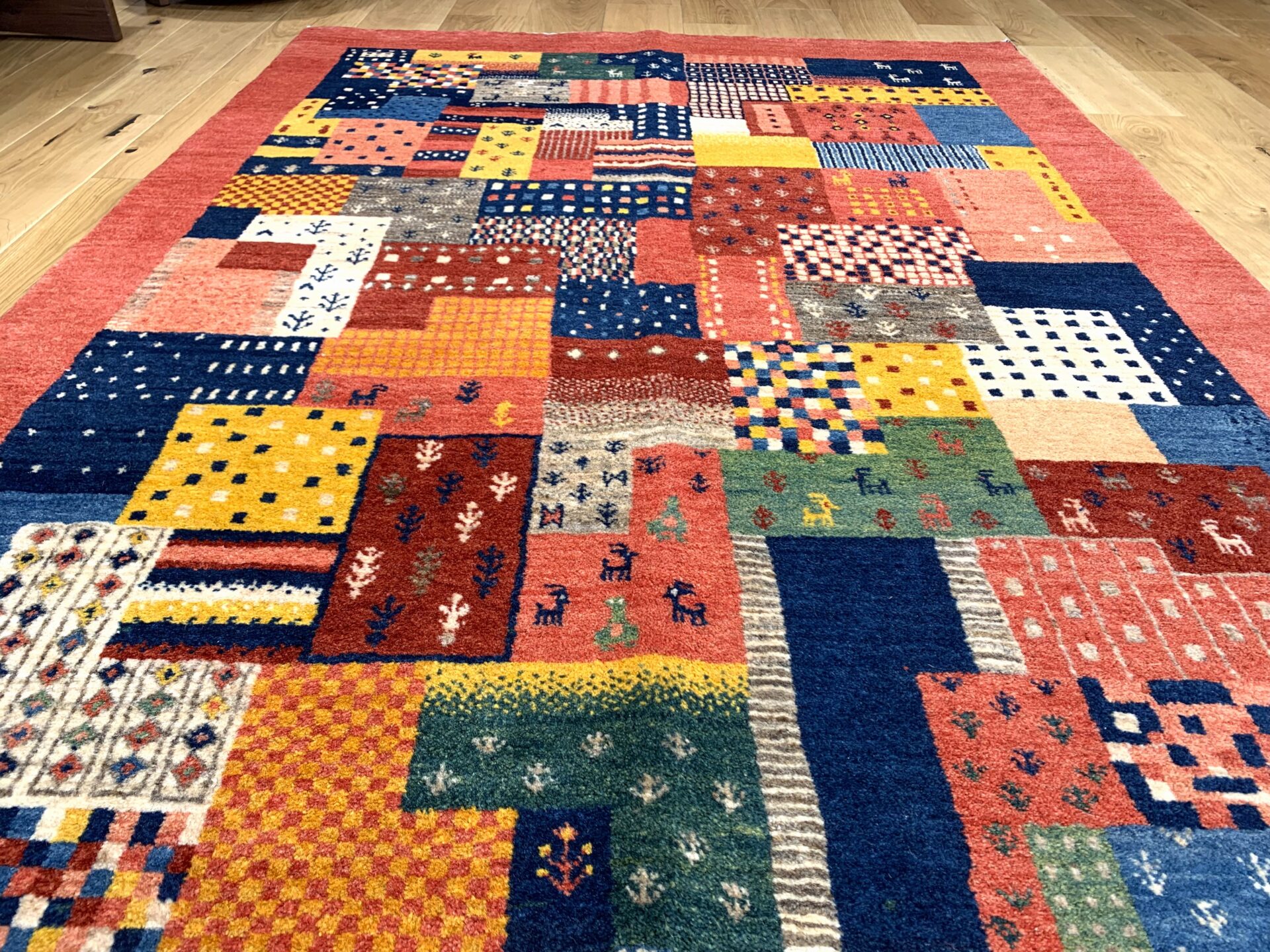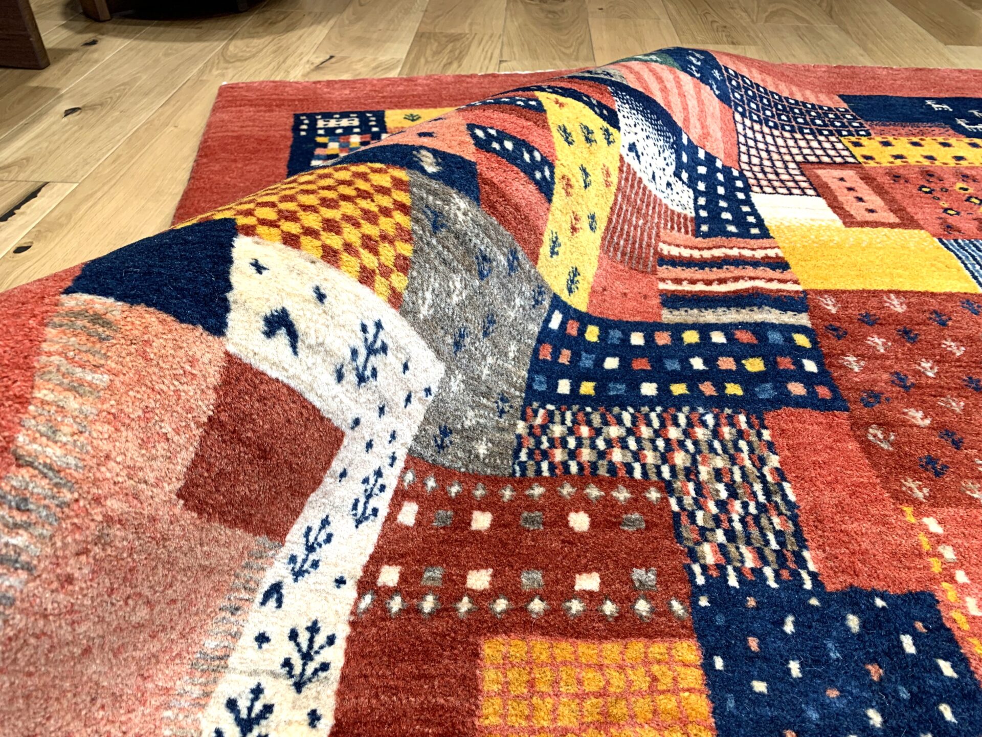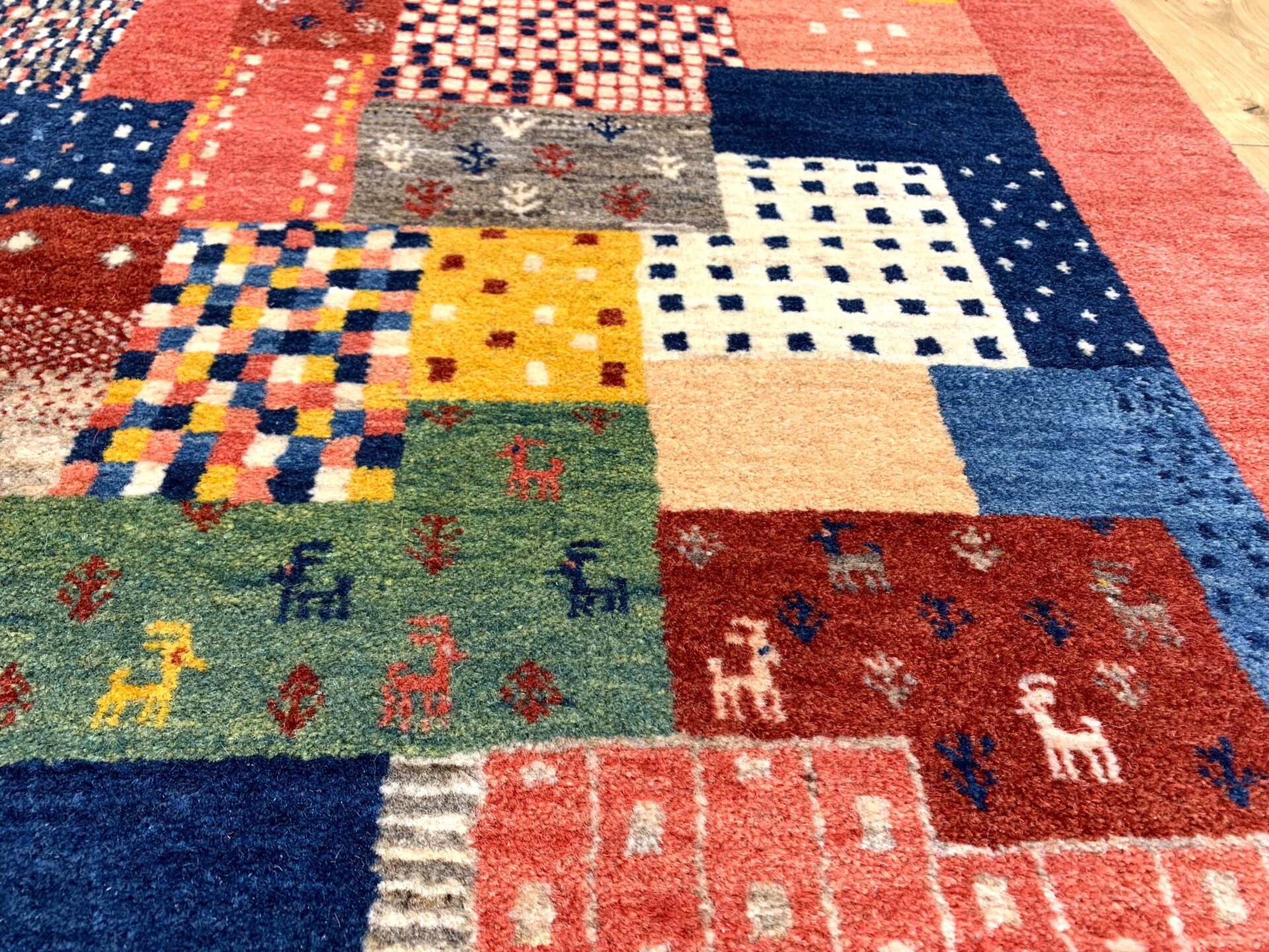 【パッチワークデザインのギャッベ – 縁起の良い文様が詰まった一枚】ギャッベらしいカラフルなパッチワークデザインが魅力の一枚。それぞれの模様には深い意味が込められています。羊は財産、生命の樹は健康と長寿、そして四角のモチーフは井戸を表し、「大切なもの」を意味します。遊牧民の願いと暮らしが織り込まれた、見ているだけでも楽しいギャッベ。お部屋に敷けば、空間が明るく華やかに。縁起の良いアートラグを、ぜひお迎えください。