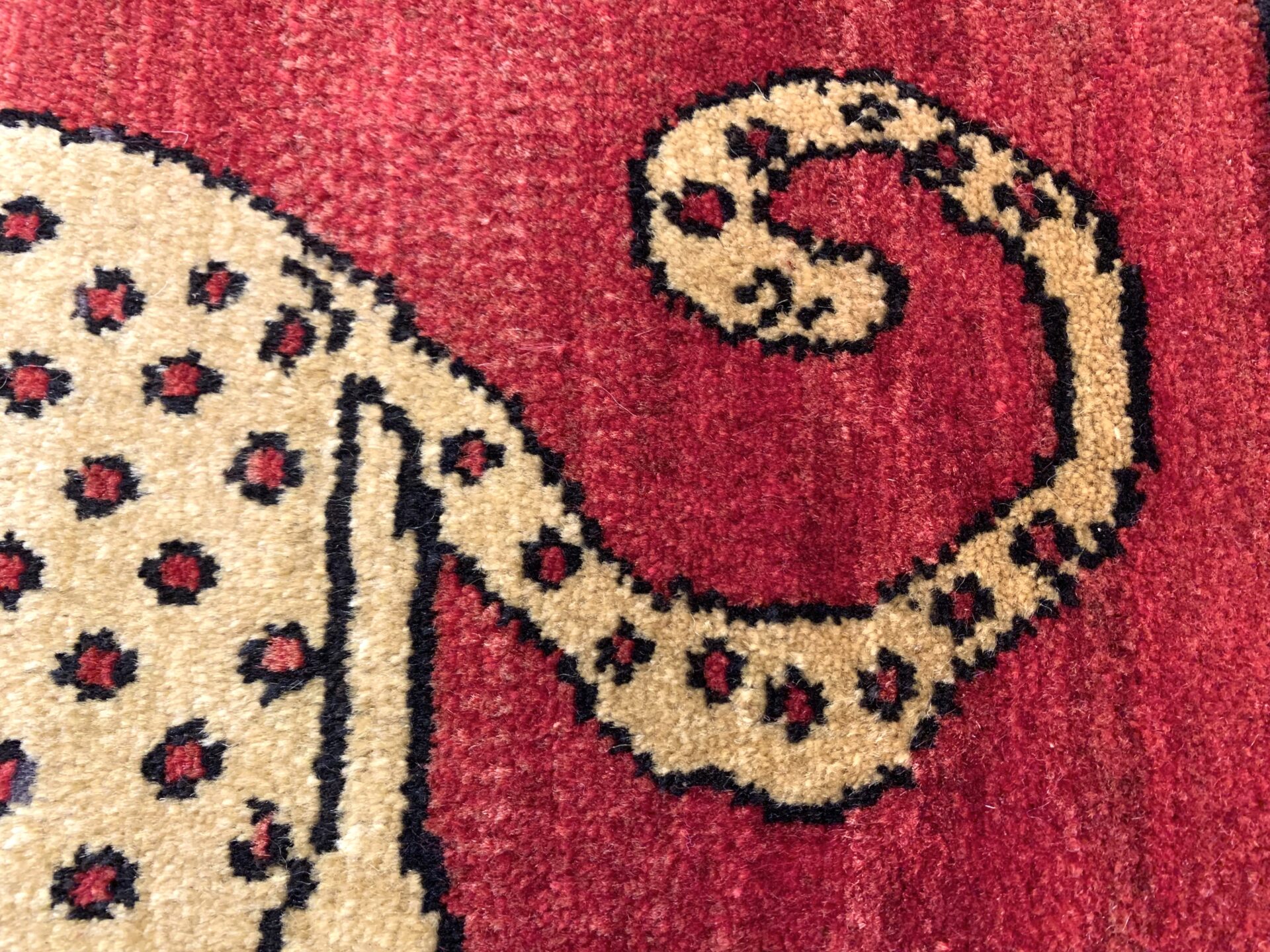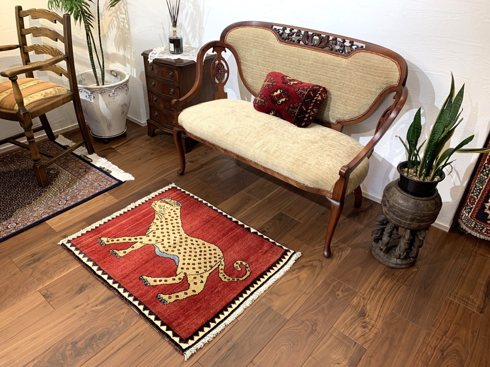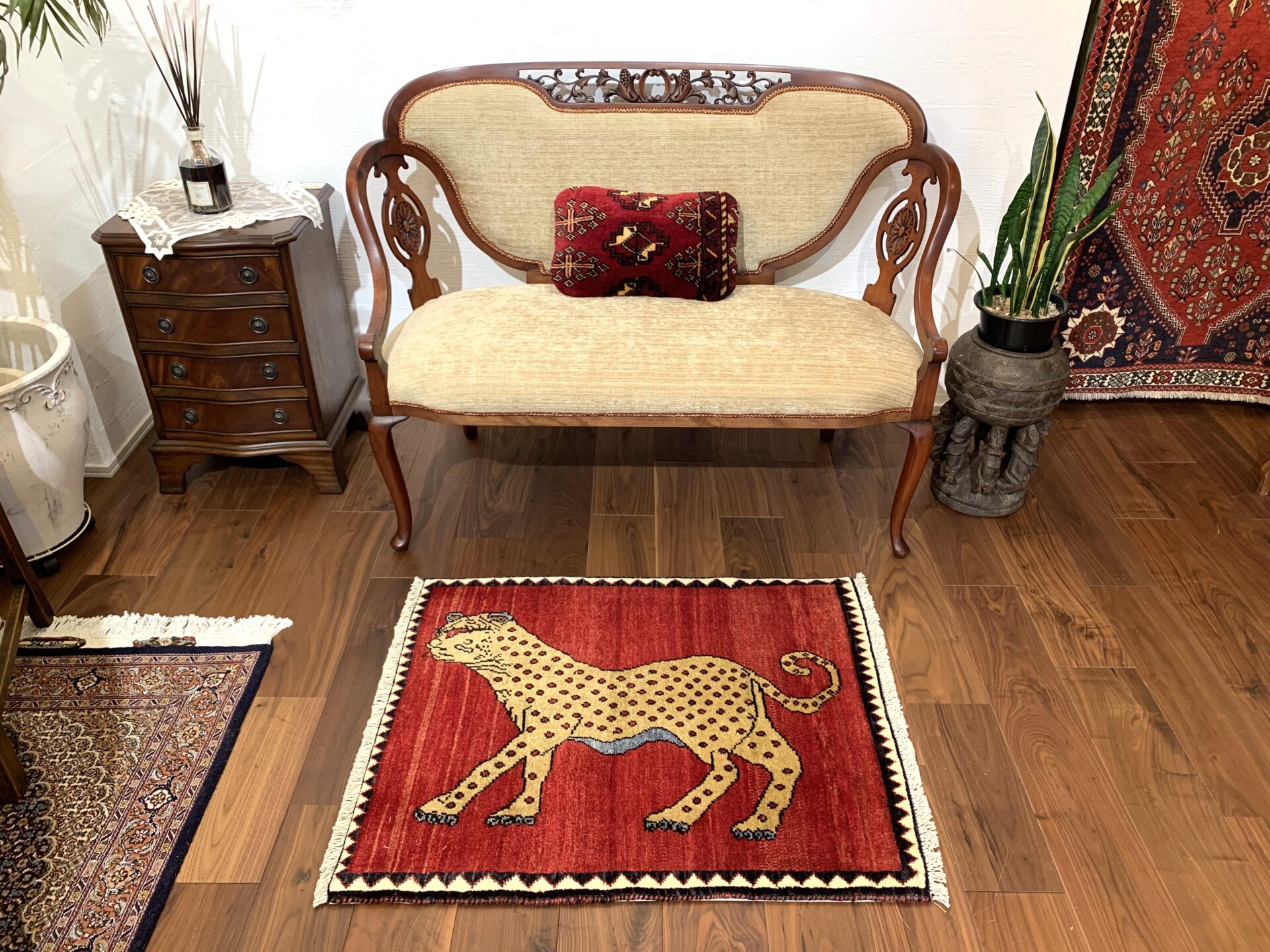 この絨毯の特徴的なデザインとして、ライオンを囲む三角模様が挙げられます。これはオオカミの牙を表し、魔除けの意味を持つ伝統的な文様。遊牧民の暮らしの中で、大切な家族や財産を邪悪なものから守るために取り入れられてきたデザインです。背景の深みのある赤がライオンの存在感を一層引き立て、空間に力強いアクセントを与えます。天然ウールのふかふかとした柔らかい肌触りは、足元に心地よさをもたらし、日常の中で絨毯の温もりを感じられます。小ぶりなサイズなので、玄関、ベッドサイド、デスク前など、様々なシーンに馴染みやすいのもポイント。守護の意味が込められた一枚を、大切な空間に迎えてみてはいかがでしょうか?